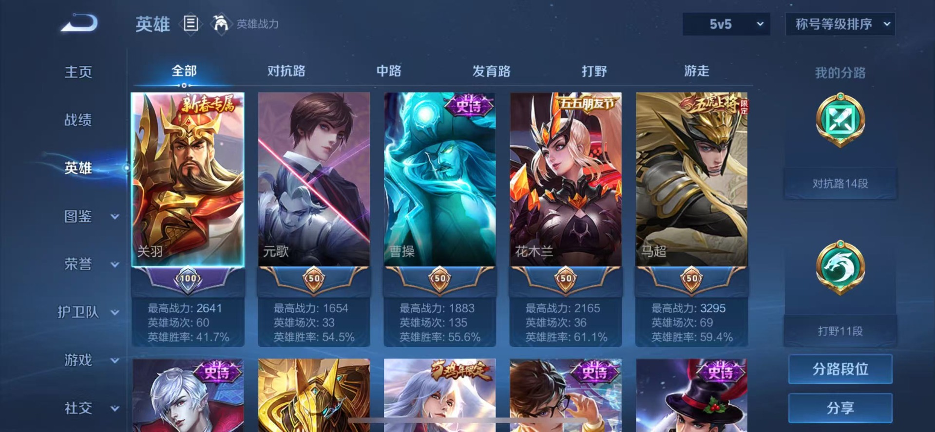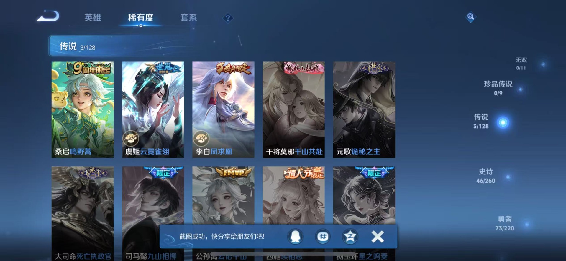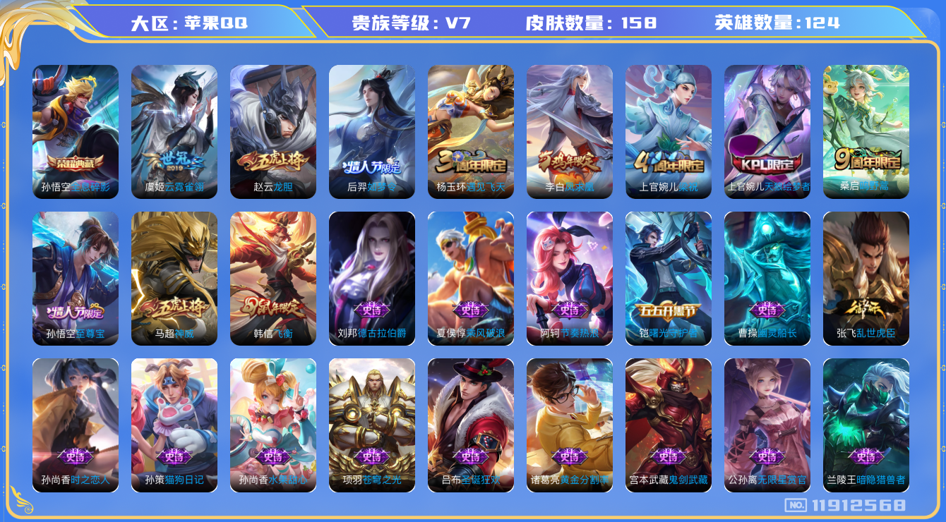 - [11605404]V7 1典藏 12传说 125英雄 264皮肤 可修改实名 优质装备:幻阙歌(貂蝉典藏),黄金狮子座,冠军飞将,一念神魔,零号·赤焰,地狱之眼,时之恋人-刘备(电焊工),音你闪耀(rap皮),鹤归松栖(云缨) 传说皮:云诺千山,幻光神枪 珍宝阁皮:优雅恋人,女武神 限定皮:愿照·千秋盛(女娲年限),至尊宝,白虎志(电光耗子),神威(电光马子),遇见飞天,高山流水,五谷丰年,冰锋战神,梁祝,御风骁将(吕布年限),烈魂,李小龙,如梦令-后羿,猪悟能,大圣娶亲 史诗皮:飞车小橘子,器灵·浮梦炉,化蝶舞,雪豹·霜爪,电玩小子(小书包),千年之狐,完美假期,匿光侦查者,偶像歌手,龙骑士(小龙虾),乱世虎臣,节奏热浪,修罗,女仆咖啡,摇滚巨星,水果甜心,时之奇旅-安琪拉,功夫厨神,德古拉伯爵,暗隐猎兽者,幽灵船长,鬼剑武藏,心灵战警,舞动绿茵,地狱岩魂,纤云弄巧,繁星吟游(呼啦呼啦),逐浪之夏,水晶猎龙者,金属风暴,原初追逐者,圣诞恋歌,鹰眼统帅,魅力维加斯,黎明之约,未来纪元-赵云