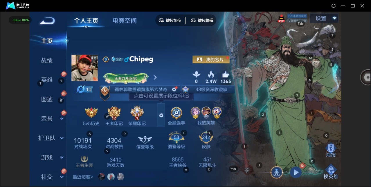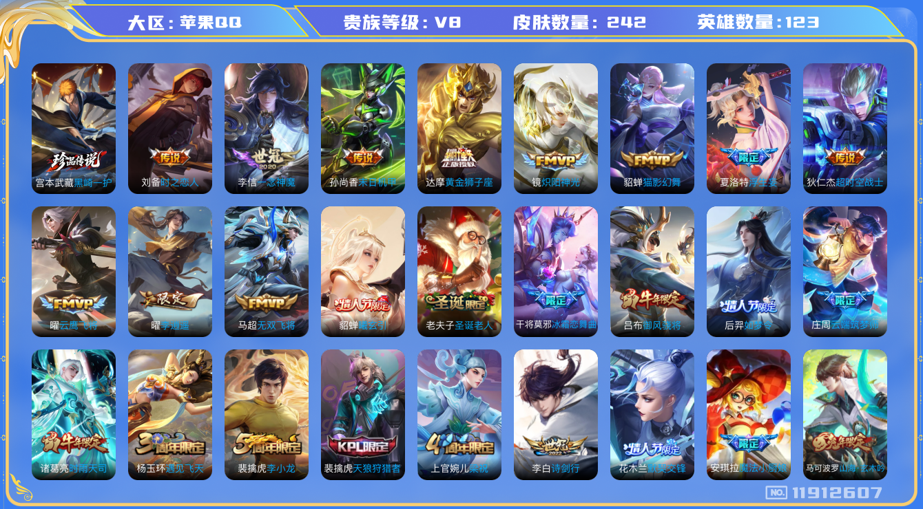 - PX_2088151-实名: 可修改 贵族等级: V7 英雄数: 122 皮肤数: 242 传说皮: 黄金射手座,挚爱之约,神器·狴犴令,山海·炽霜斩,燃星之曲,浮生妄,幻光神枪 限定皮: 李小龙,奔雷神使,梁祝,龙胆,寅虎·御盾,武陵仙君,高山流水,猪悟能,时之祈愿-云中君,时之祈愿-瑶,百木心枪,玉兔公主,匿光决锋者,深海之息,五谷丰年,鸣野蒿,逐霄战戟,愿照·山河定