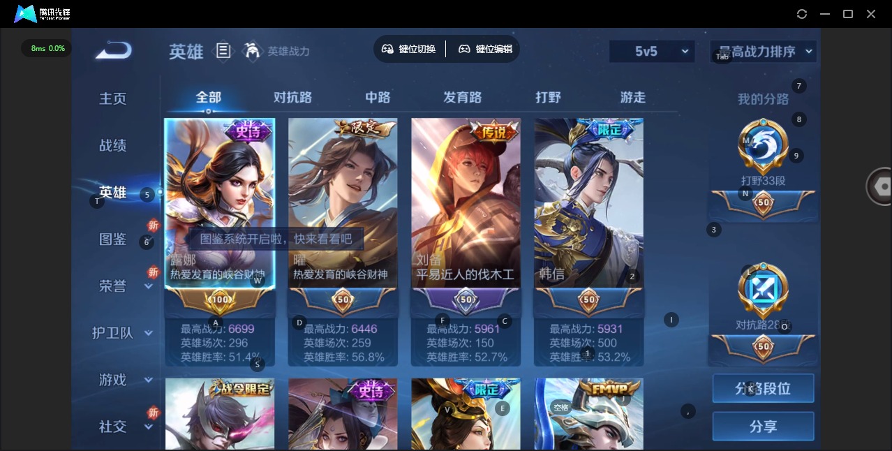 - [11608114]V6 3传说 114英雄 107皮肤 可修改实名 传说皮:典韦战鼓燎原,幻光神枪 珍宝阁皮:蔷薇恋人 限定皮:鸣野蒿,飞衡(韩信年限),龙胆 史诗皮:化蝶舞,谪仙醉月,龙之律动,茶境仙,百相守梦-黄忠,特工魅影,偶像歌手,末日机甲-吕布,猫狗日记-孙策,女仆咖啡,摇滚巨星,水果甜心,天才门将,暗隐猎兽者,幽灵船长,鬼剑武藏,心灵战警,纤云弄巧,缤纷独角兽,乘风破浪,逐浪之夏,曙光守护者,金属风暴,圣诞恋歌,鹰眼统帅,魅力维加斯,未来纪元-赵云