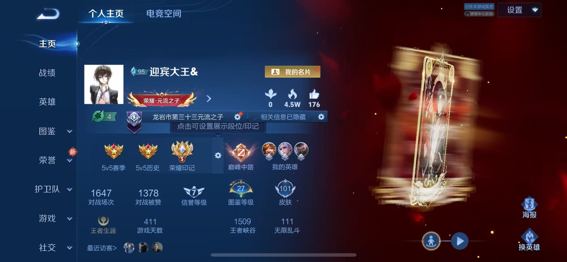 - PX_2083991-贵族等级: V7 英雄数: 125 皮肤数: 209 传说皮: 炽阳神光,一念神魔,零号·赤焰,音你心动-周瑜,山海·苍雷引 限定皮: 李小龙,梁祝,蜜橘之夏,朱雀志,大圣娶亲,高山流水,孙行者,五谷丰年,诗剑行,鸣野蒿