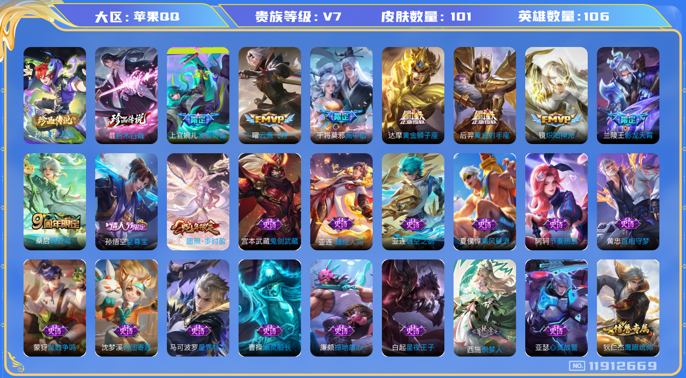 [11912669]V7 2珍品传说 9传说 106英雄 101皮肤 可修改实名 优质装备:朽木白哉,黄金狮子座,黄金射手座,云鹰飞将(小将军),炽阳神光,画中仙,妄想奇谈 珍品传说:时之奇旅-孙策 限定皮:愿照·岁时盈(虞姬年限),鸣野蒿,至尊宝,影龙天霄 史诗皮:器灵·浮梦炉,糖绘人间,龙之律动,石田雨龙,茶境仙,撼地雄心,破空之剑,星界特工,百相守梦-黄忠,织梦人,守夜人,苍穹之光,黄金分割率,特工魅影,节奏热浪,修罗,水果甜心,星夜王子,幽灵船长,鬼剑武藏,心灵战警,乘风破浪,逐浪之夏,龙鼓争鸣,月团寄思,鹰眼统帅,魅力维加斯,黎明之约