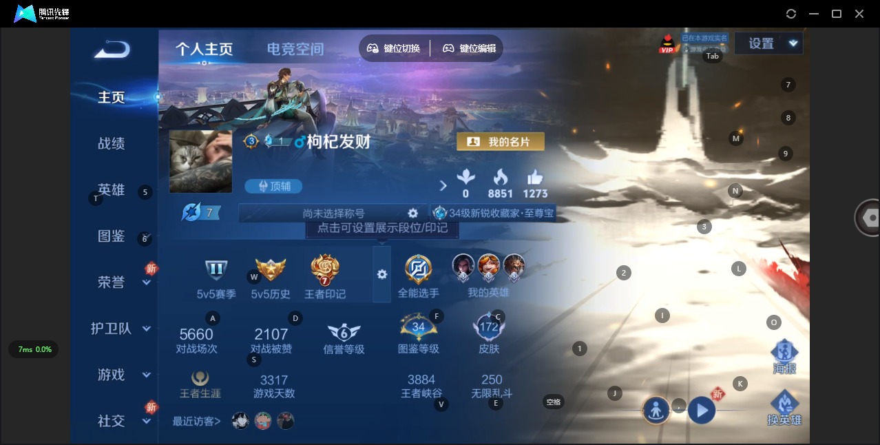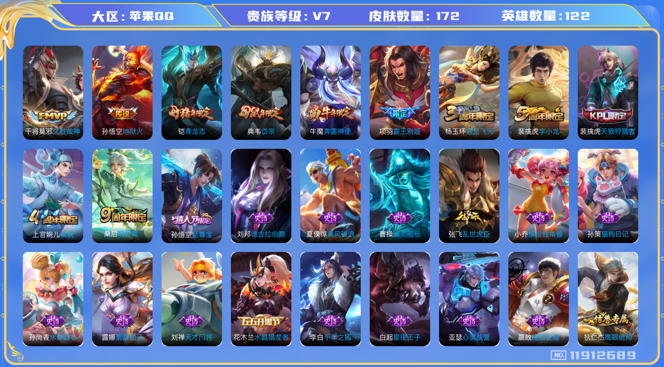 - [11601175]V7 1典藏 6传说 124英雄 285皮肤 可修改实名 优质装备:鸣剑·曳影,冠军飞将,炽阳神光,一念神魔,地狱火,淬星耀世,超时空战士-狄仁杰 珍宝阁皮:蔷薇恋人,玩趣恶龙 限定皮:神威(电光马子),遇见飞天,高山流水,五谷丰年,冰锋战神,梁祝,逐梦之星,李小龙,逐梦之影,朱雀志(守约年限),孙行者 史诗皮:星界战将,苍穹之光,电玩小子(小书包),白龙吟,黄金分割率,千年之狐,江河有灵,蒙恬荣光圣徽,偶像歌手,魅语,电玩·爆裂旋风,暗夜猫娘,乱世虎臣,修罗,摇滚巨星,水果甜心,绅士熊喵,天才门将,星夜王子,心灵骇客,时之奇旅-安琪拉,德古拉伯爵,暗隐猎兽者,幽灵船长,鬼剑武藏,暗渊魔法,心灵战警,舞动绿茵,地狱岩魂,纤云弄巧,拒霜思,缤纷独角兽,乘风破浪,逐浪之夏,水晶猎龙者,曙光守护者,金属风暴,原初追逐者,圣诞狂欢,圣诞恋歌,鹰眼统帅,魅力维加斯,黎明之约,无心,未来纪元-赵云
