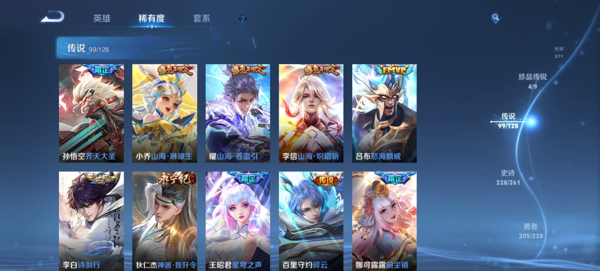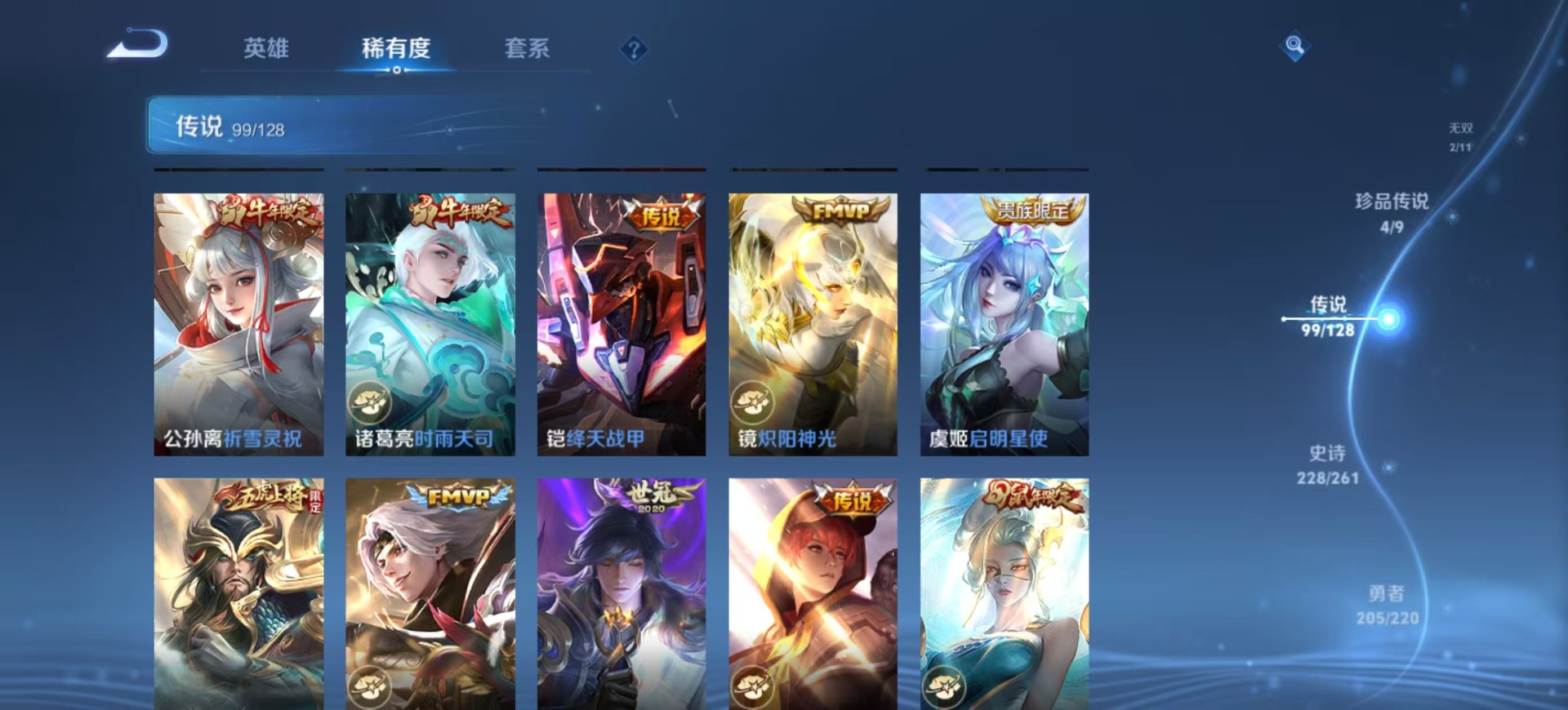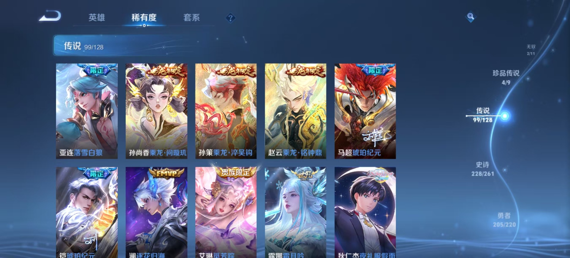 金蝉唐三藏,夏侯惇匿光决锋者,黄忠烈魂,老夫子圣诞老人,盾山梦圆繁星,曹操天狼征服者,苏烈玄武志,孙尚香异界灵契,牛魔奔雷神使,项羽霸王别姬,露娜启示之音,露娜一生所爱,庄周玄嵩,镜匿光追影者,庄周云端筑梦师,诸葛亮时雨天司,杨玉环寅虎·心曲,貂蝉逐梦之音,裴擒虎梅西,裴擒虎李小龙,裴擒虎天狼狩猎者,裴擒虎寅虎·赤拳,上官婉儿梁祝,上官婉儿神器·万象笔,上官婉儿天狼绘梦者,花木兰默契交锋,花木兰瑞麟志,花木兰青春决赛季,马可波罗逐梦之星,马可波罗山海·玄木吟,马可波罗深海之息,猪八戒猪悟能,孙悟空孙行者,孙悟空大圣娶亲,芈月白晶晶,孙悟空至尊宝,孙悟空美猴王,雅典娜神奇女侠,云中君时之祈愿,韩信傲雪梅枪,韩信飞衡,韩信逐梦之影,百里守约朱雀志,墨子降魔,嫦娥如梦令,王昭君凤凰于飞,王昭君星穹之声,王昭君映山客,大乔白鹤梁神女,哪吒逐梦之翼,甄姬幽恒,甄姬女儿国国王,甄姬至美·化雀舞,铠青龙志,廉颇寅虎·御盾,伽罗天狼溯光者,伽罗太华,张飞虎魄,赵云百木心枪,赵云龙胆,孙膑天狼运算者,孙膑寅虎·展翼,干将莫邪冰霜恋舞曲,典韦岱宗,鲁班七号乒乒小将,鲁班七号寅虎·瑞焰,后羿无尽星芒,吕布御风骁将,后羿如梦令,后羿辉光之辰,公孙离祈雪灵祝,兰陵王默契交锋,公孙离玉兔公主,兰陵王影龙天霄,鲁班大师匿光启智者,李白诗剑行,安琪拉魔法小厨娘,艾琳陌上桑,西施至美·乘鲤谣,桑启鸣野蒿,女娲补天,百里玄策白虎志,马超神威,赵云引擎之心,妲己愿照·众生和,瑶时之祈愿,瑶山海·碧波行,娜可露露前尘镜,妲己热情桑巴,关羽武圣,关羽冰锋战神