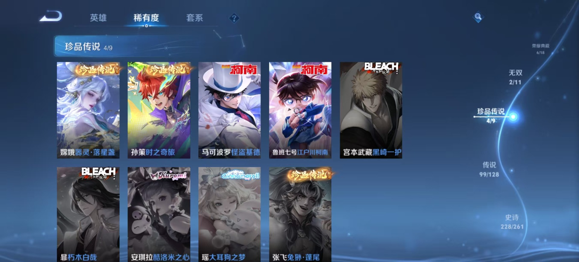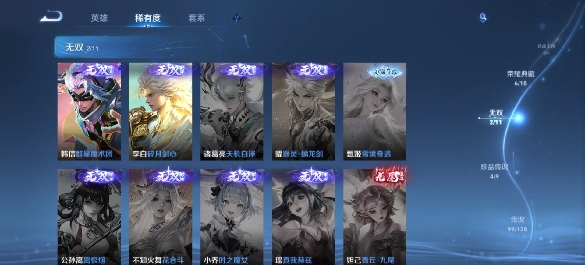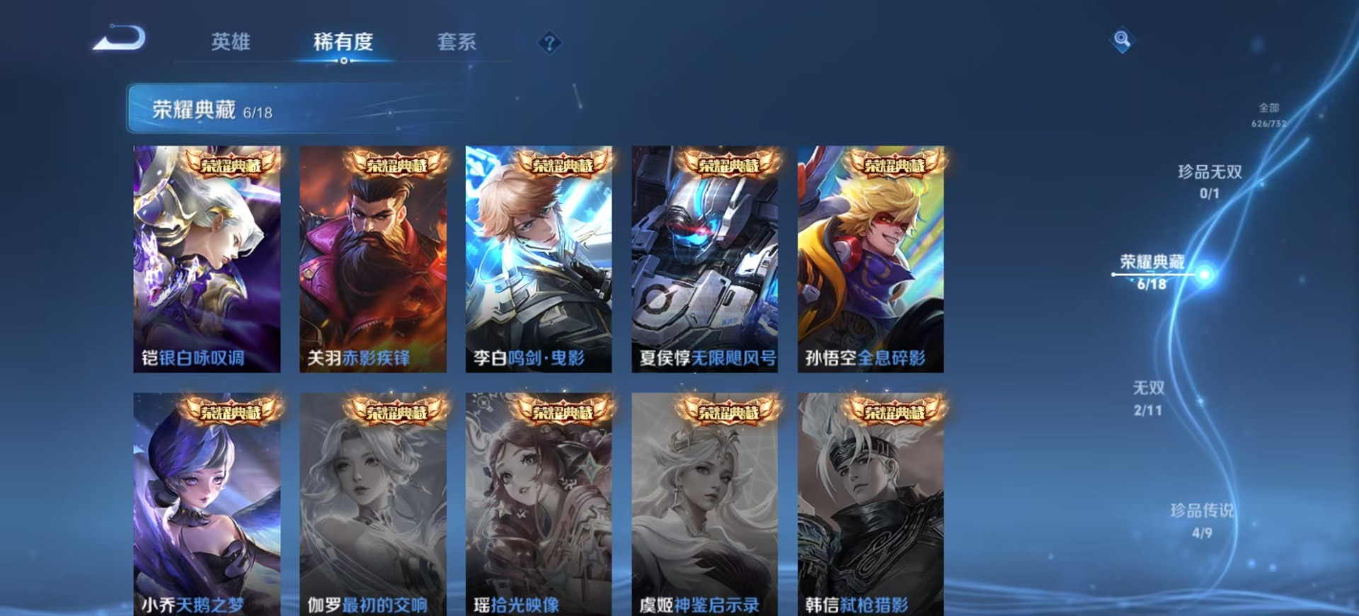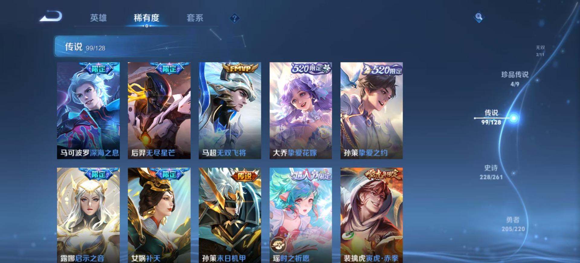 金蝉唐三藏,夏侯惇匿光决锋者,黄忠烈魂,老夫子圣诞老人,盾山梦圆繁星,曹操天狼征服者,苏烈玄武志,孙尚香异界灵契,牛魔奔雷神使,项羽霸王别姬,露娜启示之音,露娜一生所爱,庄周玄嵩,镜匿光追影者,庄周云端筑梦师,诸葛亮时雨天司,杨玉环寅虎·心曲,貂蝉逐梦之音,裴擒虎梅西,裴擒虎李小龙,裴擒虎天狼狩猎者,裴擒虎寅虎·赤拳,上官婉儿梁祝,上官婉儿神器·万象笔,上官婉儿天狼绘梦者,花木兰默契交锋,花木兰瑞麟志,花木兰青春决赛季,马可波罗逐梦之星,马可波罗山海·玄木吟,马可波罗深海之息,猪八戒猪悟能,孙悟空孙行者,孙悟空大圣娶亲,芈月白晶晶,孙悟空至尊宝,孙悟空美猴王,雅典娜神奇女侠,云中君时之祈愿,韩信傲雪梅枪,韩信飞衡,韩信逐梦之影,百里守约朱雀志,墨子降魔,嫦娥如梦令,王昭君凤凰于飞,王昭君星穹之声,王昭君映山客,大乔白鹤梁神女,哪吒逐梦之翼,甄姬幽恒,甄姬女儿国国王,甄姬至美·化雀舞,铠青龙志,廉颇寅虎·御盾,伽罗天狼溯光者,伽罗太华,张飞虎魄,赵云百木心枪,赵云龙胆,孙膑天狼运算者,孙膑寅虎·展翼,干将莫邪冰霜恋舞曲,典韦岱宗,鲁班七号乒乒小将,鲁班七号寅虎·瑞焰,后羿无尽星芒,吕布御风骁将,后羿如梦令,后羿辉光之辰,公孙离祈雪灵祝,兰陵王默契交锋,公孙离玉兔公主,兰陵王影龙天霄,鲁班大师匿光启智者,李白诗剑行,安琪拉魔法小厨娘,艾琳陌上桑,西施至美·乘鲤谣,桑启鸣野蒿,女娲补天,百里玄策白虎志,马超神威,赵云引擎之心,妲己愿照·众生和,瑶时之祈愿,瑶山海·碧波行,娜可露露前尘镜,妲己热情桑巴,关羽武圣,关羽冰锋战神