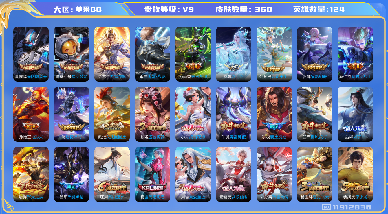 - [12141402]V10 5典藏 5无双 8珍品传说 64传说 125英雄 509皮肤 可修改实名 优质装备:鸣剑·曳影,全息碎影(猴子典藏),九霄神辉(木兰典藏),银白咏叹调(倪克斯侍卫),弑枪猎影(韩信典藏),真我赫兹(瑶)(瑶无双),小乔时之魔女(小乔无双),韩信群星魔术团(韩信无双),器灵·螭龙剑,天机白泽,江户川柯南,怪盗基德,器灵·落星盏,酷洛米之心,大耳狗之梦,朽木白哉,黑崎一护,黄金狮子座,黄金射手座,冠军飞将,云鹰飞将(小将军),绛天战甲(鸡嘴战神),猫影幻舞,久胜战神,炽阳神光,一念神魔,末日机甲-孙尚香(绿蚂蚱),地狱火,仲夏夜之梦(大飞蛾),音你心动-小乔,零号·赤焰,海洋之心,地狱之眼,音你心动-周瑜,胖达荣荣,李逍遥,乞巧织情,时之恋人-刘备(电焊工),淬星耀世,超时空战士-狄仁杰,末日机甲-孙策,挚爱之约,无双飞将,音你闪耀(rap皮),碎云,浮生妄,记忆之芯(机甲兔),妄想实况,妄想奇谈,惊梅引,澜逐花归海,艾琳觅芳踪,千劫归真,诡秘之主,千山共赴,涂山容容 珍品传说:时之奇旅-孙策 传说皮:典韦战鼓燎原,落雪白狼,死亡执政官,九山相柳,星之鸣奏,祥瑞亨通,幻光神枪 珍宝阁皮:万物之道,蔷薇恋人,女武神 限定皮:愿照·九州拓(澜年限),愿照·福禄聚(蔡文姬年限),愿照·岁时盈(虞姬年限),愿照·山河定(司空震年限),愿照·众生和(妲己年限),愿照·千秋盛(女娲年限),逐霄战戟,鸣野蒿,至尊宝,白虎志(电光耗子),武陵仙君(小桃花),傲雪梅枪,绯月行,白鹤梁神女,时雨天司(水龙头),神威(电光马子),飞衡(韩信年限),山海·碧波行(瑶年限),至美·乘鲤谣,至美·化雀舞,遇见飞天,高山流水,诗剑行,怒海麟威,五谷丰年,武圣,游园惊梦,梁祝,逐梦之翼,天狼溯光者,虎魄,天狼征服者,天狼绘梦者,李小龙,逐梦之影,朱雀志(守约年限),永曜之星,辉光之辰,孙行者,猪悟能,大圣娶亲,引擎之心,乒乒小将,蜜橘之夏,寅虎·御盾(廉颇年限),百木心枪,玉兔公主,启示之音,深海之息(深海大菠萝),山海·玄木吟(马可年限),冰霜神祇 史诗皮:赞萌露比,鸭鸭历险记-刘禅,苍鳞隐世,器灵·浮梦炉,糖绘人间,瑰影绮梦,化蝶舞,灵蛊蚀心,星界战将,龙之律动,雪豹·霜爪,布丁狗之誓,小牛鸭,石田雨龙,百相守梦-周瑜,戍鼓铭心,茶境仙,幻珠鲛人,怒海争锋,破空之剑,战舞者,涂山红红,