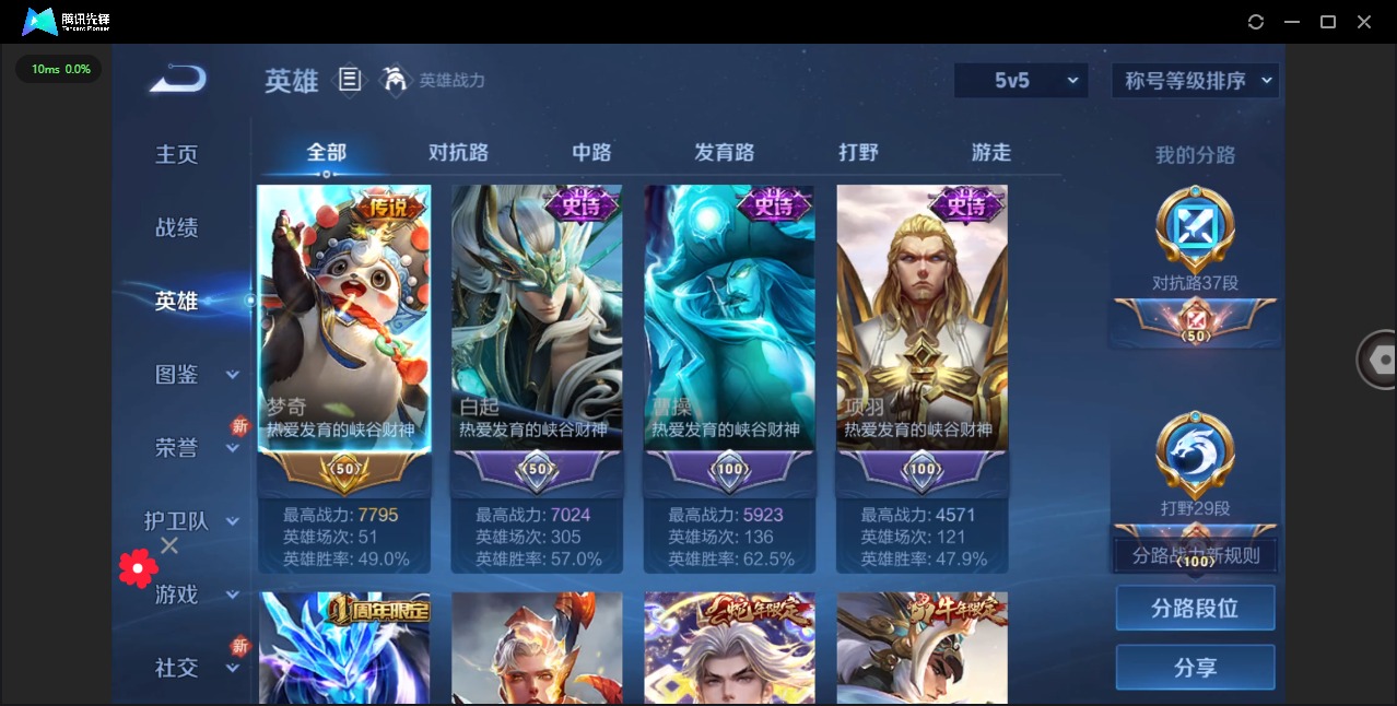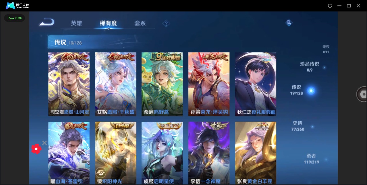 - [11579033]V7 7传说 122英雄 215皮肤 可修改实名 传说皮:黄金狮子座,地狱火,无双飞将,遇见神鼓 珍宝阁皮:妄想食味,胡桃夹子 限定皮:鸣野蒿,至尊宝,傲雪梅枪,五谷丰年,武圣,梁祝,天狼征服者,李小龙,寅虎·瑞焰(虎皮蛋子) 史诗皮:茶境仙,蔬乡物语(鲁班七号),超元猎域,乘龙·忆丹青(大乔年限),化蝶舞,破空之剑,遇见神鹿,紫霞仙子,电玩小子(小书包),黄金分割率,特工魅影,千年之狐,江河有灵,百解令(蒙犽),蒙恬荣光圣徽,青蛇,电玩·爆裂旋风,猫狗日记-孙策,乱世虎臣,节奏热浪,修罗,女仆咖啡,摇滚巨星,水果甜心,天才门将,星夜王子,心灵骇客,功夫厨神,德古拉伯爵,暗隐猎兽者,鬼剑武藏,暗渊魔法,心灵战警,乐园奇幻夜,舞动绿茵,地狱岩魂,纤云弄巧,缤纷独角兽,乘风破浪,逐浪之夏,水晶猎龙者,曙光守护者,箭羽风息,金属风暴,圣诞狂欢,圣诞恋歌,鹰眼统帅,魅力维加斯,无心,未来纪元-赵云