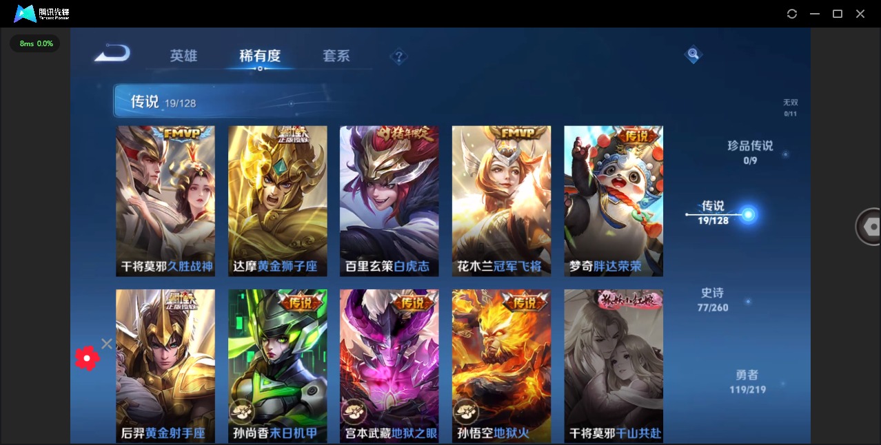 - [12148127]V7 4传说 124英雄 192皮肤 可修改实名 优质装备:黄金狮子座,云霓雀翎,末日机甲-孙尚香(绿蚂蚱),山海·炽霜斩(李信年限) 珍宝阁皮:蔷薇恋人 限定皮:至尊宝,飞衡(韩信年限),遇见飞天,五谷丰年,青龙志(铠年限),梁祝,天狼狩猎者,烈魂,李小龙,辉光之辰,乒乒小将,山海·玄木吟(马可年限) 史诗皮:化蝶舞,龙之律动,茶境仙,百相守梦-黄忠,黄金分割率,特工魅影,千年之狐,冰冠公主,龙骑士(小龙虾),乱世虎臣,节奏热浪,修罗,水果甜心,功夫厨神,暗隐猎兽者,幽灵船长,鬼剑武藏,纤云弄巧,乘风破浪,逐浪之夏,水晶猎龙者,热力回旋,箭羽风息,金属风暴,原初追逐者,鹰眼统帅,黎明之约,无心