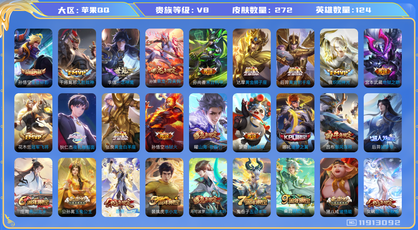 [11913092]V8 1典藏 19传说 124英雄 272皮肤 可修改实名 优质装备:全息碎影(猴子典藏),黄金狮子座,黄金射手座,冠军飞将,黄金白羊座,久胜战神,炽阳神光,一念神魔,末日机甲-孙尚香(绿蚂蚱),地狱火,地狱之眼,胖达荣荣,山海·苍雷引(电光曜子),夜礼服假面,涂山容容 传说皮:乘龙·淬吴钩(孙策年限) 珍宝阁皮:妄想食味,女武神,玩趣恶龙 限定皮:愿照·山河定(司空震年限),愿照·千秋盛(女娲年限),鸣野蒿,至尊宝,白虎志(电光耗子),白晶晶,神威(电光马子),高山流水,五谷丰年,冰锋战神,御风骁将(吕布年限),逐梦之翼,李小龙,如梦令-后羿,猪悟能,玉兔公主,山海·玄木吟(马可年限) 史诗皮:苍鳞隐世,器灵·浮梦炉,星界战将,谪仙醉月,龙之律动,茶境仙,百相守梦-百里守约,紫霞仙子,苍穹之光,黄金分割率,特工魅影,千年之狐,永昼,魅语,百解令(蒙犽),蒙恬荣光圣徽,冰冠公主,偶像歌手,晚萤,电玩·爆裂旋风,末日机甲-吕布,猫狗日记-孙策,乱世虎臣,修罗,摇滚巨星,水果甜心,绅士熊喵,天才门将,星夜王子,心灵骇客,功夫厨神,德古拉伯爵,暗隐猎兽者,幽灵船长,鬼剑武藏,心灵战警,天秀·启明,地狱岩魂,纤云弄巧,乘风破浪,逐浪之夏,月团寄思,水晶猎龙者,金属风暴,原初追逐者,圣诞狂欢,圣诞恋歌,鹰眼统帅,暗夜贵公子,魅力维加斯,黎明之约,赏金猎手,未来纪元-赵云