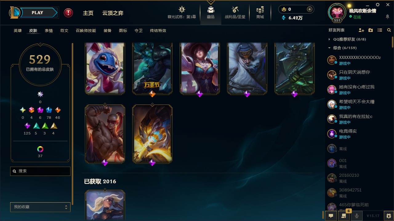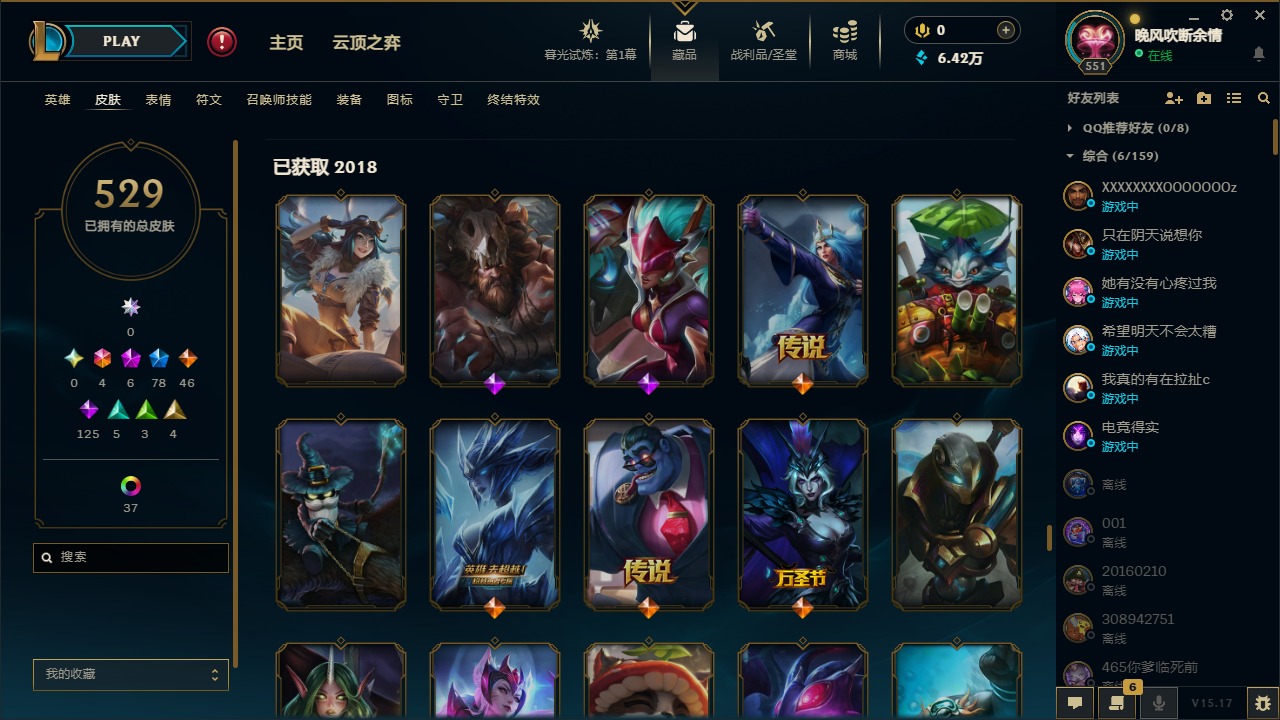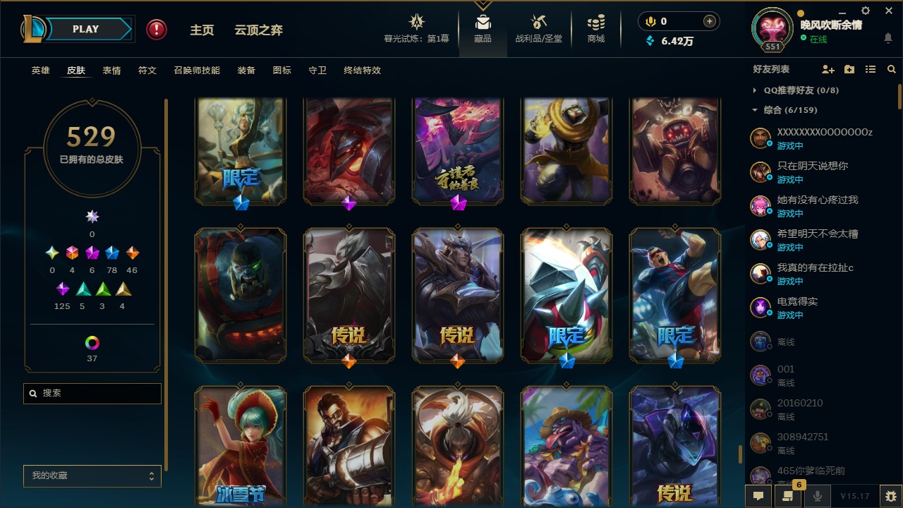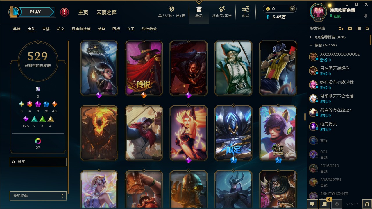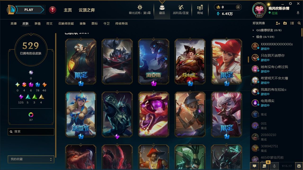 [11913098]4终极 6神话 78限定 46传说 125史诗 529皮肤 64炫彩 171英雄 可二次 可修改实名 优质装备:源代码 乐芙兰,防爆天使 凯尔,暗影 沃里克,巧克力工坊 波比,地底世界 崔斯特,都铎王朝 图奇,夺命美人 卡特,防爆士兵 格雷福斯,冠军掠夺者 卡兹克,冠军之矛 滑板鞋,冠军之志 瑞兹,密林猎手 提莫,送披萨的小姐姐 希维尔,野兽猎人 瑟庄妮,野兽猎人 泰达米尔,勇者 阿狸,御魔星矢 寒冰,征服者 卡尔玛,制胜金球 拉莫斯,制胜金靴 李青,大元素使,灵魂守卫,未来战士,武装战姬,奥德赛 吉格斯,无畏骑士 瑟庄妮 赤子初心,可爱可爱粉红红 布里茨,幻灵战斗猫 金克丝 梦幻强袭,净雪之月 莫甘娜 冬虹,墨之影武者 亚索 金墨耀影,十五周年纪念 希维尔,暗星 科加斯,心之钢 伊泽瑞尔 天纵才华,魔女 阿卡丽 虚荣,王国机神 白虎 贾克斯 云霄,暗裔英雄 盖伦 海克斯:海克斯 玛尔扎哈 情人节限定:穿心之剑 菲奥娜 赛季限定皮:胜利之运 崔斯特,胜利凤凰 艾尼维亚,胜利剑圣 易,胜利之王 泰达米尔,胜利之剑 剑魔,胜利枪神 卢锡安,胜利机器人 布里茨,胜利女神 瑟庄妮 冠军限定系列:S1FNC 酒桶,S1FNC 迦娜,S1FNC 嘉文四世,S2 暗杀星 发条,S2 暗杀星 蒙多,S4 SSW 雷恩加尔,S4 SSW 炼金,S5 SKT T1 雷克顿,S5 SKT T1 滑板鞋,S5 SKT T1 蜘蛛 冰雪节限定:“主人不要我了” 阿木木,冰雪节 马尔扎哈,冰雪节 炼金,冰雪女神 辛德拉,冰雪驯鹿 波比,冬季仙灵 索拉卡,平安夜女神 娑娜,魄罗骑士 瑟庄妮,圣诞开心鬼 提莫,圣诞精灵 崔丝塔娜,圣诞狂欢 时光,圣诞狂欢 努努,圣诞老人 酒桶,圣诞玩偶 波比,圣诞驯鹿 克格莫,冰雪节 茂凯,邪恶圣诞老人 维迦,幸福女神 乐芙兰,雪默丁格,英勇玩具兵船长 泳池派对:泳池派对 吉格斯 万圣节限定:鬼影森森 茂凯,伯爵 卡萨丁,大魔法锅 布里茨,鬼影重重 魔腾,海贼 瑞兹,古拉伯爵 克烈,魅惑女巫 波比 年限:天龙之子 斯莫德,龙年 李青,蛇年 卡西奥佩娅,马年 锐雯,猴年 孙悟空,猴年 莫甘娜,鸡年 盖伦,鼠年 瑟提,鼠年 武器 周年:4周年 锐雯,5周年 阿狸,10周年 安妮,10周年 凤凰