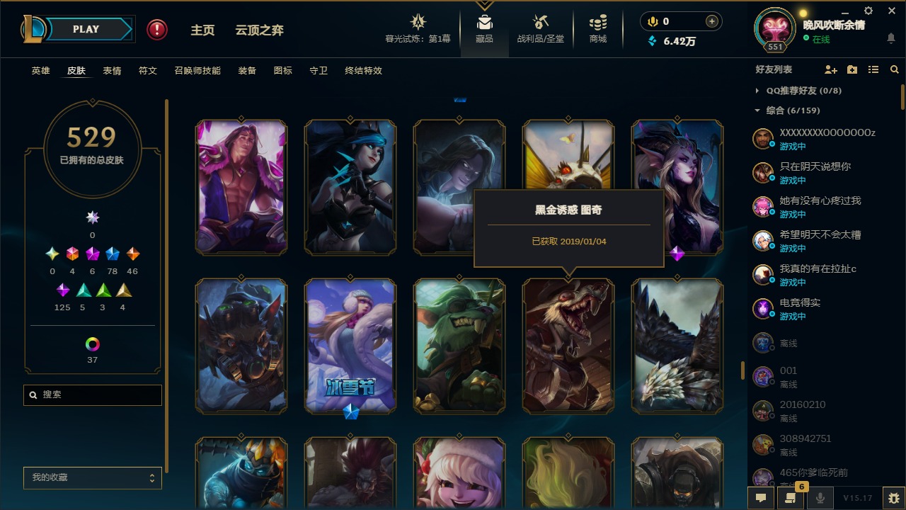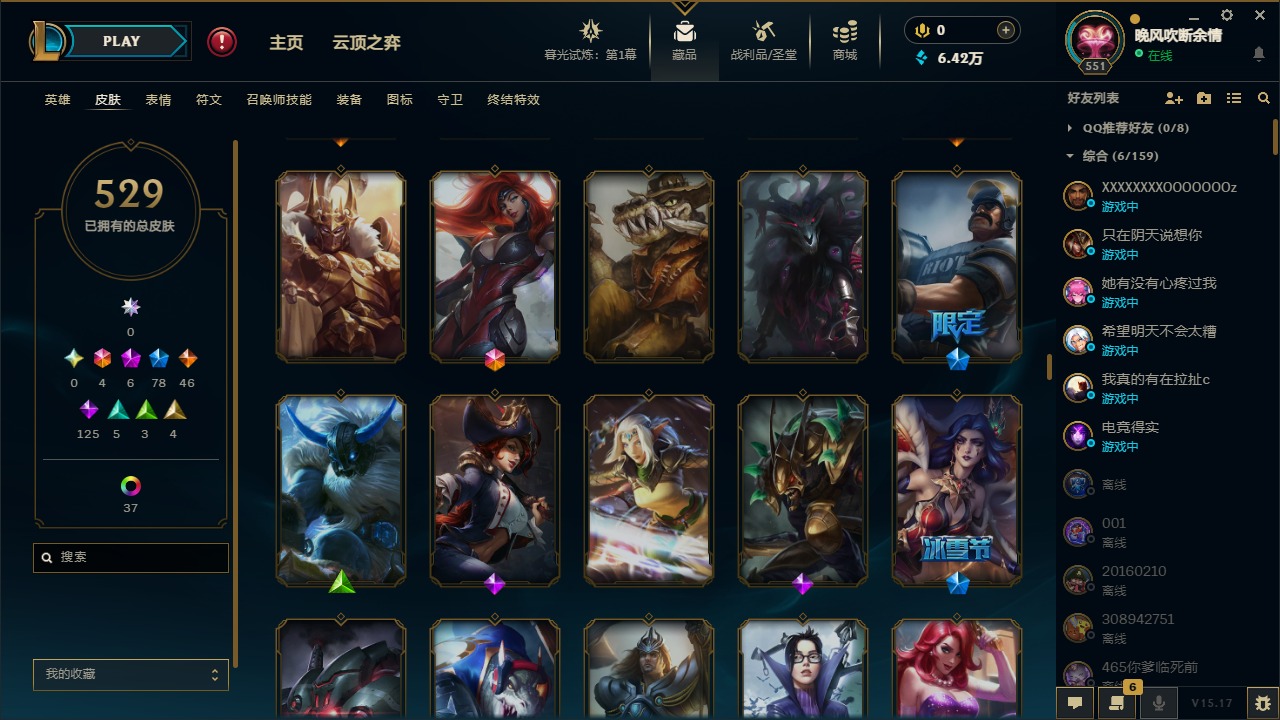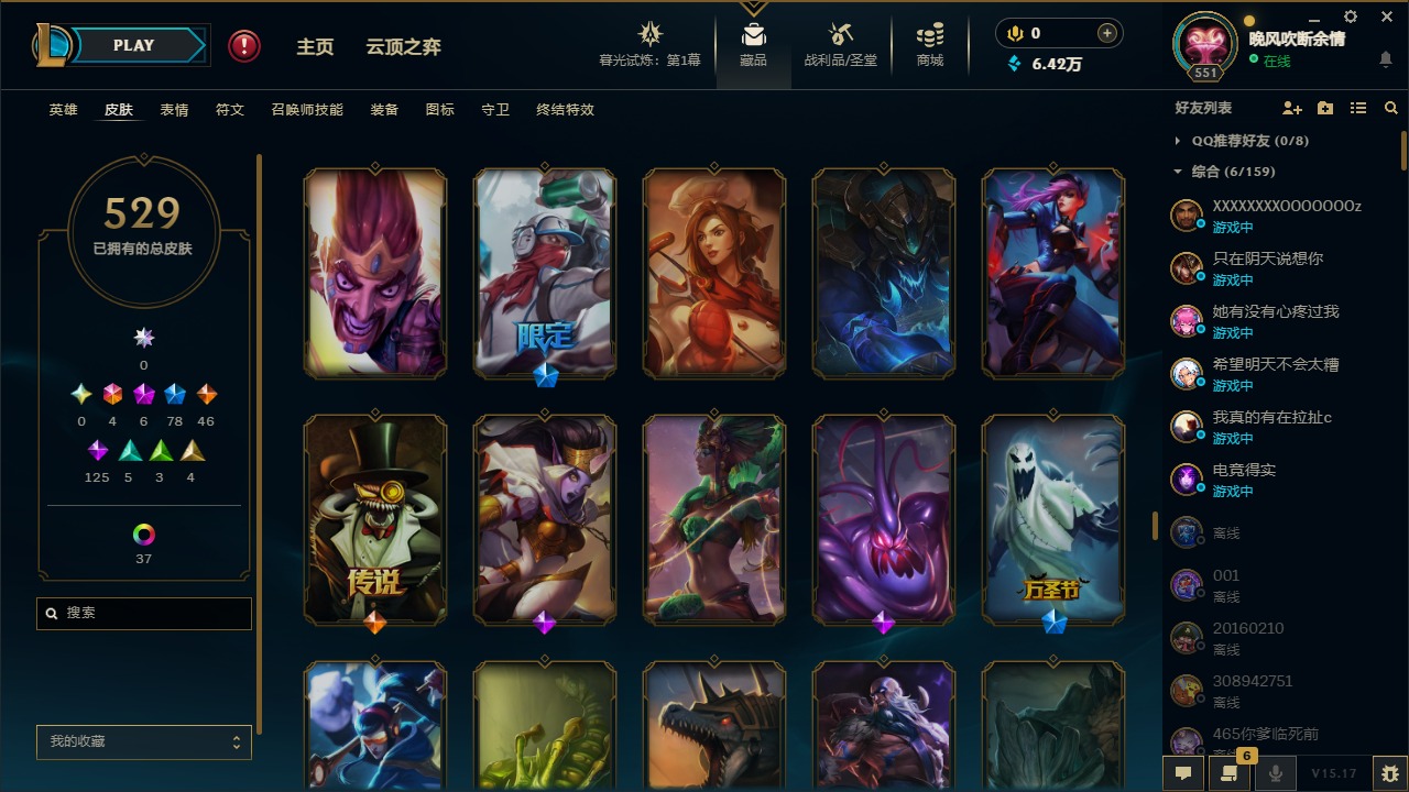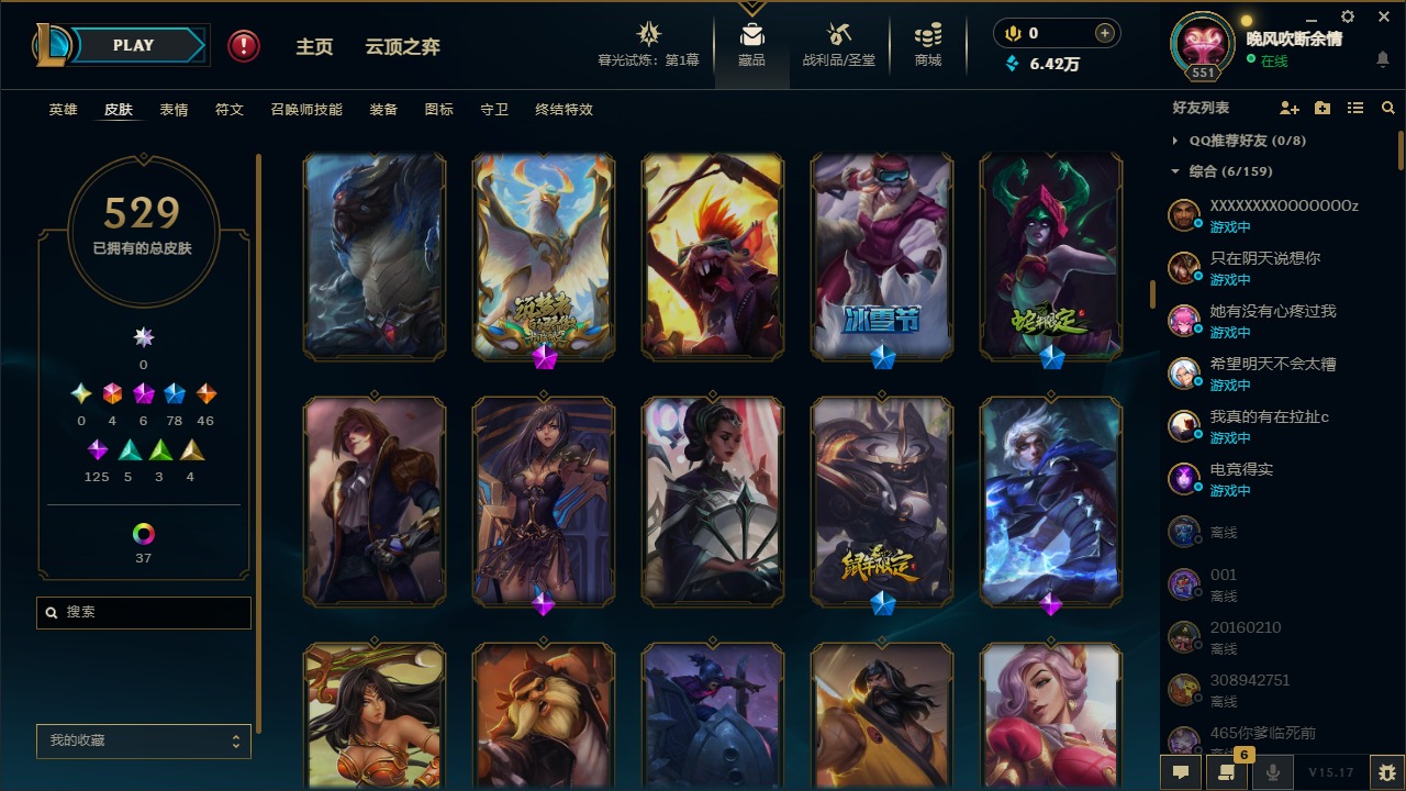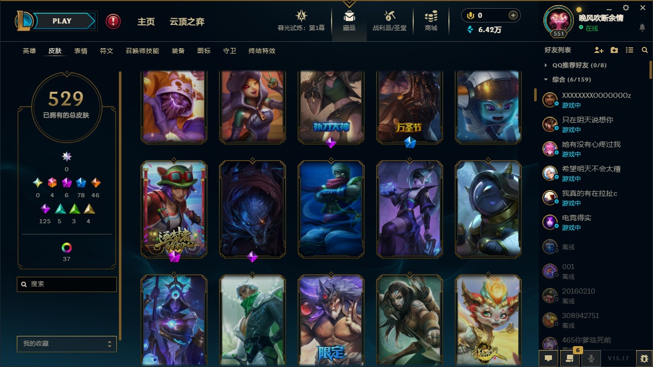 [11913098]4终极 6神话 78限定 46传说 125史诗 529皮肤 64炫彩 171英雄 可二次 可修改实名 优质装备:源代码 乐芙兰,防爆天使 凯尔,暗影 沃里克,巧克力工坊 波比,地底世界 崔斯特,都铎王朝 图奇,夺命美人 卡特,防爆士兵 格雷福斯,冠军掠夺者 卡兹克,冠军之矛 滑板鞋,冠军之志 瑞兹,密林猎手 提莫,送披萨的小姐姐 希维尔,野兽猎人 瑟庄妮,野兽猎人 泰达米尔,勇者 阿狸,御魔星矢 寒冰,征服者 卡尔玛,制胜金球 拉莫斯,制胜金靴 李青,大元素使,灵魂守卫,未来战士,武装战姬,奥德赛 吉格斯,无畏骑士 瑟庄妮 赤子初心,可爱可爱粉红红 布里茨,幻灵战斗猫 金克丝 梦幻强袭,净雪之月 莫甘娜 冬虹,墨之影武者 亚索 金墨耀影,十五周年纪念 希维尔,暗星 科加斯,心之钢 伊泽瑞尔 天纵才华,魔女 阿卡丽 虚荣,王国机神 白虎 贾克斯 云霄,暗裔英雄 盖伦 海克斯:海克斯 玛尔扎哈 情人节限定:穿心之剑 菲奥娜 赛季限定皮:胜利之运 崔斯特,胜利凤凰 艾尼维亚,胜利剑圣 易,胜利之王 泰达米尔,胜利之剑 剑魔,胜利枪神 卢锡安,胜利机器人 布里茨,胜利女神 瑟庄妮 冠军限定系列:S1FNC 酒桶,S1FNC 迦娜,S1FNC 嘉文四世,S2 暗杀星 发条,S2 暗杀星 蒙多,S4 SSW 雷恩加尔,S4 SSW 炼金,S5 SKT T1 雷克顿,S5 SKT T1 滑板鞋,S5 SKT T1 蜘蛛 冰雪节限定:“主人不要我了” 阿木木,冰雪节 马尔扎哈,冰雪节 炼金,冰雪女神 辛德拉,冰雪驯鹿 波比,冬季仙灵 索拉卡,平安夜女神 娑娜,魄罗骑士 瑟庄妮,圣诞开心鬼 提莫,圣诞精灵 崔丝塔娜,圣诞狂欢 时光,圣诞狂欢 努努,圣诞老人 酒桶,圣诞玩偶 波比,圣诞驯鹿 克格莫,冰雪节 茂凯,邪恶圣诞老人 维迦,幸福女神 乐芙兰,雪默丁格,英勇玩具兵船长 泳池派对:泳池派对 吉格斯 万圣节限定:鬼影森森 茂凯,伯爵 卡萨丁,大魔法锅 布里茨,鬼影重重 魔腾,海贼 瑞兹,古拉伯爵 克烈,魅惑女巫 波比 年限:天龙之子 斯莫德,龙年 李青,蛇年 卡西奥佩娅,马年 锐雯,猴年 孙悟空,猴年 莫甘娜,鸡年 盖伦,鼠年 瑟提,鼠年 武器 周年:4周年 锐雯,5周年 阿狸,10周年 安妮,10周年 凤凰