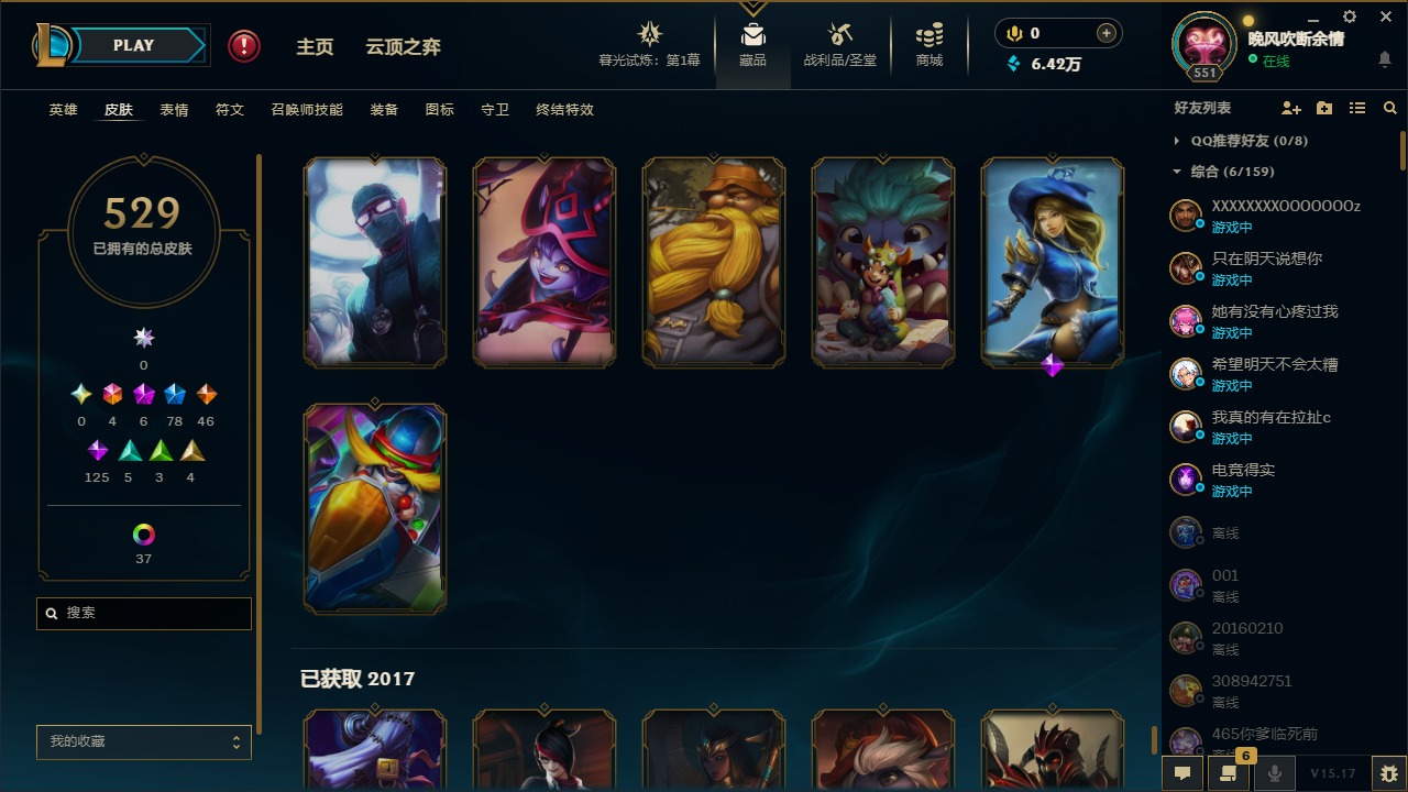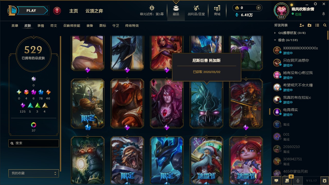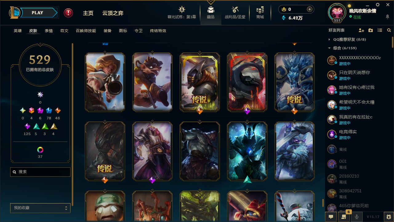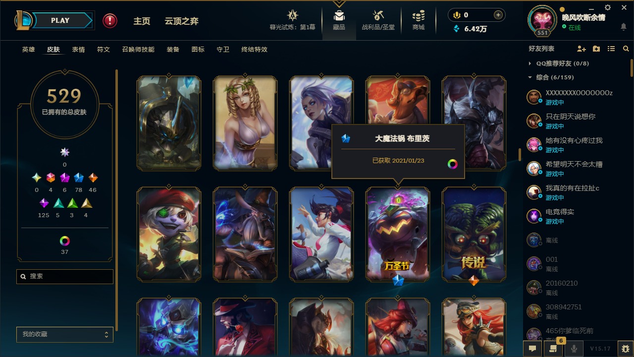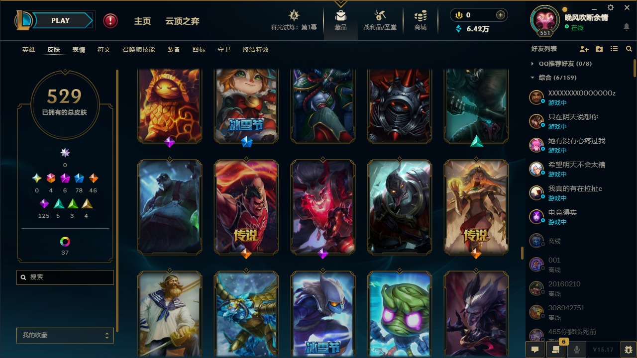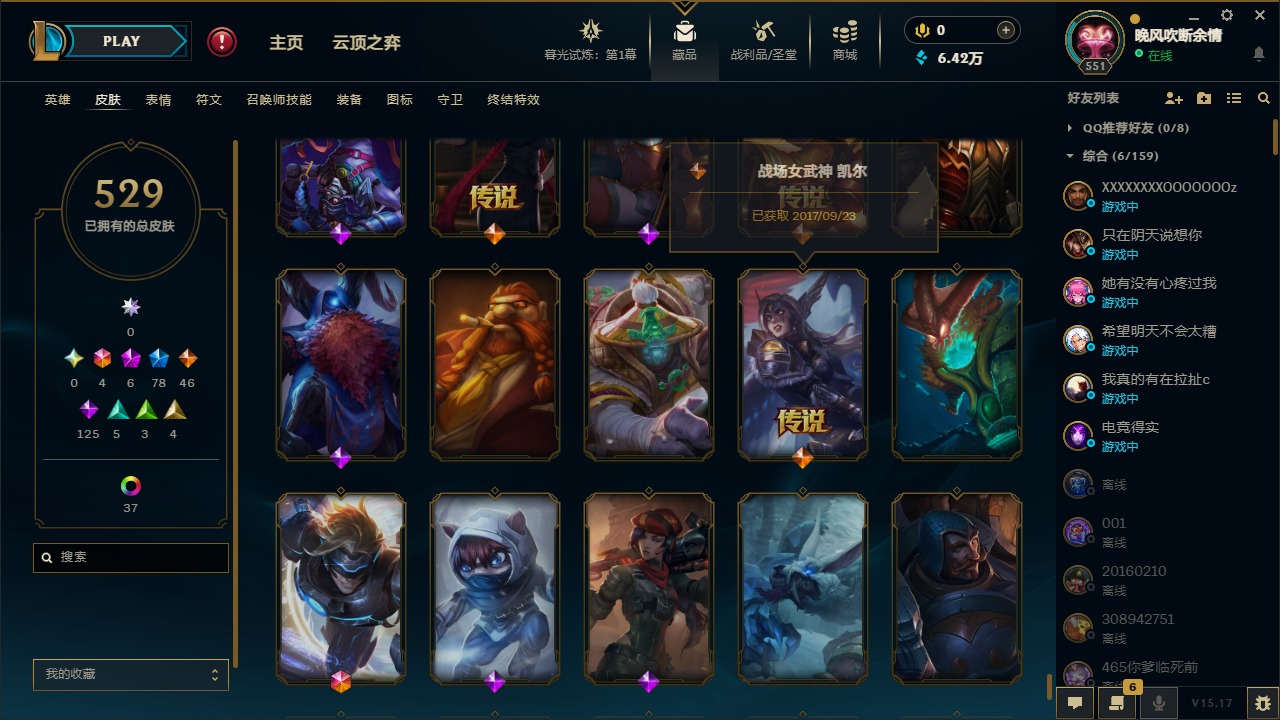 [11913098]4终极 6神话 78限定 46传说 125史诗 529皮肤 64炫彩 171英雄 可二次 可修改实名 优质装备:源代码 乐芙兰,防爆天使 凯尔,暗影 沃里克,巧克力工坊 波比,地底世界 崔斯特,都铎王朝 图奇,夺命美人 卡特,防爆士兵 格雷福斯,冠军掠夺者 卡兹克,冠军之矛 滑板鞋,冠军之志 瑞兹,密林猎手 提莫,送披萨的小姐姐 希维尔,野兽猎人 瑟庄妮,野兽猎人 泰达米尔,勇者 阿狸,御魔星矢 寒冰,征服者 卡尔玛,制胜金球 拉莫斯,制胜金靴 李青,大元素使,灵魂守卫,未来战士,武装战姬,奥德赛 吉格斯,无畏骑士 瑟庄妮 赤子初心,可爱可爱粉红红 布里茨,幻灵战斗猫 金克丝 梦幻强袭,净雪之月 莫甘娜 冬虹,墨之影武者 亚索 金墨耀影,十五周年纪念 希维尔,暗星 科加斯,心之钢 伊泽瑞尔 天纵才华,魔女 阿卡丽 虚荣,王国机神 白虎 贾克斯 云霄,暗裔英雄 盖伦 海克斯:海克斯 玛尔扎哈 情人节限定:穿心之剑 菲奥娜 赛季限定皮:胜利之运 崔斯特,胜利凤凰 艾尼维亚,胜利剑圣 易,胜利之王 泰达米尔,胜利之剑 剑魔,胜利枪神 卢锡安,胜利机器人 布里茨,胜利女神 瑟庄妮 冠军限定系列:S1FNC 酒桶,S1FNC 迦娜,S1FNC 嘉文四世,S2 暗杀星 发条,S2 暗杀星 蒙多,S4 SSW 雷恩加尔,S4 SSW 炼金,S5 SKT T1 雷克顿,S5 SKT T1 滑板鞋,S5 SKT T1 蜘蛛 冰雪节限定:“主人不要我了” 阿木木,冰雪节 马尔扎哈,冰雪节 炼金,冰雪女神 辛德拉,冰雪驯鹿 波比,冬季仙灵 索拉卡,平安夜女神 娑娜,魄罗骑士 瑟庄妮,圣诞开心鬼 提莫,圣诞精灵 崔丝塔娜,圣诞狂欢 时光,圣诞狂欢 努努,圣诞老人 酒桶,圣诞玩偶 波比,圣诞驯鹿 克格莫,冰雪节 茂凯,邪恶圣诞老人 维迦,幸福女神 乐芙兰,雪默丁格,英勇玩具兵船长 泳池派对:泳池派对 吉格斯 万圣节限定:鬼影森森 茂凯,伯爵 卡萨丁,大魔法锅 布里茨,鬼影重重 魔腾,海贼 瑞兹,古拉伯爵 克烈,魅惑女巫 波比 年限:天龙之子 斯莫德,龙年 李青,蛇年 卡西奥佩娅,马年 锐雯,猴年 孙悟空,猴年 莫甘娜,鸡年 盖伦,鼠年 瑟提,鼠年 武器 周年:4周年 锐雯,5周年 阿狸,10周年 安妮,10周年 凤凰