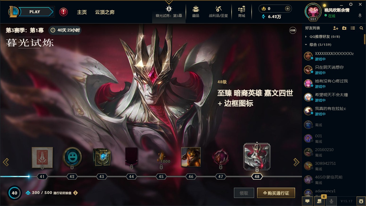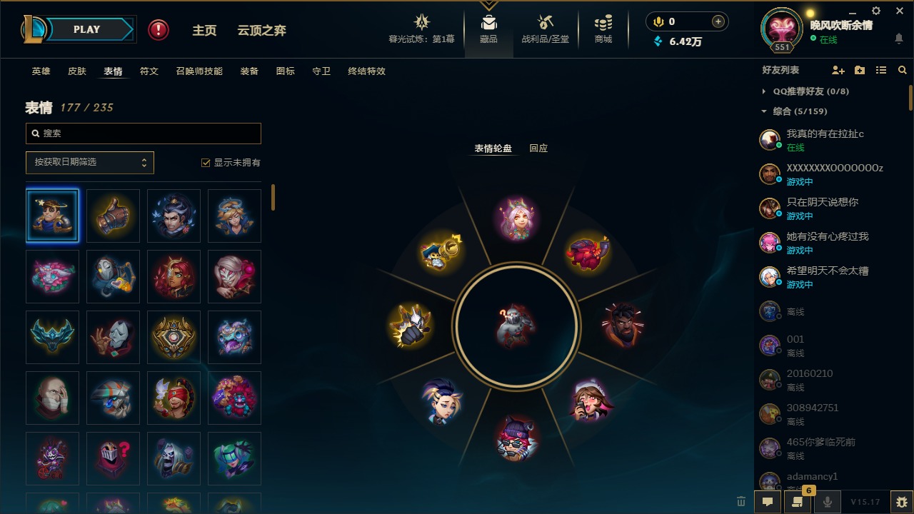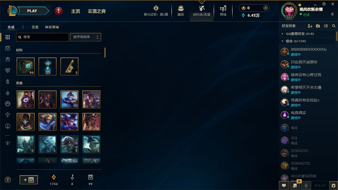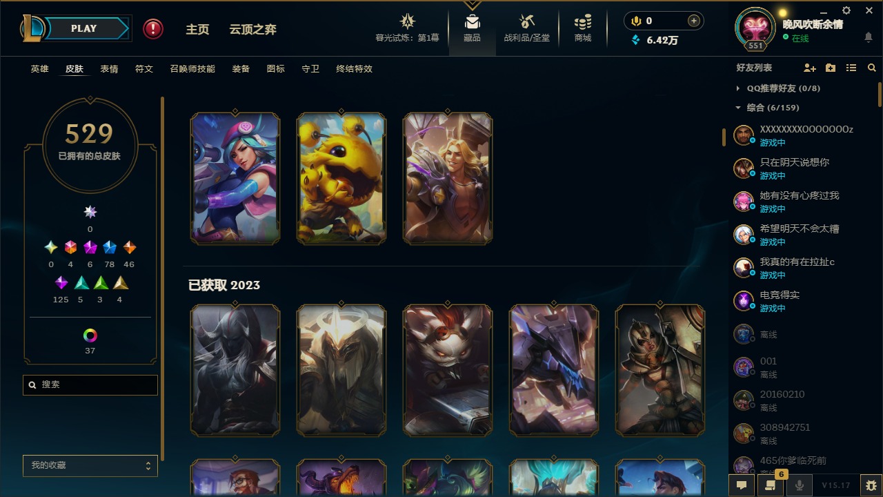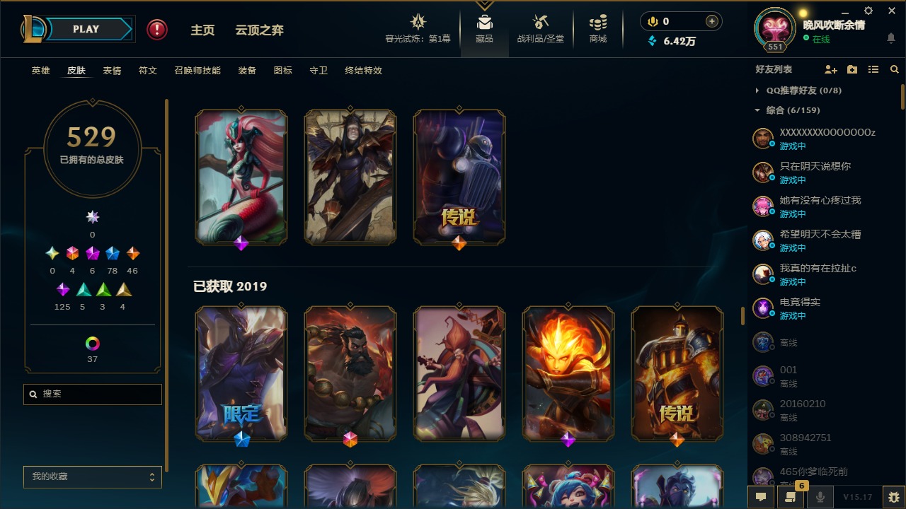 [11913098]4终极 6神话 78限定 46传说 125史诗 529皮肤 64炫彩 171英雄 可二次 可修改实名 优质装备:源代码 乐芙兰,防爆天使 凯尔,暗影 沃里克,巧克力工坊 波比,地底世界 崔斯特,都铎王朝 图奇,夺命美人 卡特,防爆士兵 格雷福斯,冠军掠夺者 卡兹克,冠军之矛 滑板鞋,冠军之志 瑞兹,密林猎手 提莫,送披萨的小姐姐 希维尔,野兽猎人 瑟庄妮,野兽猎人 泰达米尔,勇者 阿狸,御魔星矢 寒冰,征服者 卡尔玛,制胜金球 拉莫斯,制胜金靴 李青,大元素使,灵魂守卫,未来战士,武装战姬,奥德赛 吉格斯,无畏骑士 瑟庄妮 赤子初心,可爱可爱粉红红 布里茨,幻灵战斗猫 金克丝 梦幻强袭,净雪之月 莫甘娜 冬虹,墨之影武者 亚索 金墨耀影,十五周年纪念 希维尔,暗星 科加斯,心之钢 伊泽瑞尔 天纵才华,魔女 阿卡丽 虚荣,王国机神 白虎 贾克斯 云霄,暗裔英雄 盖伦 海克斯:海克斯 玛尔扎哈 情人节限定:穿心之剑 菲奥娜 赛季限定皮:胜利之运 崔斯特,胜利凤凰 艾尼维亚,胜利剑圣 易,胜利之王 泰达米尔,胜利之剑 剑魔,胜利枪神 卢锡安,胜利机器人 布里茨,胜利女神 瑟庄妮 冠军限定系列:S1FNC 酒桶,S1FNC 迦娜,S1FNC 嘉文四世,S2 暗杀星 发条,S2 暗杀星 蒙多,S4 SSW 雷恩加尔,S4 SSW 炼金,S5 SKT T1 雷克顿,S5 SKT T1 滑板鞋,S5 SKT T1 蜘蛛 冰雪节限定:“主人不要我了” 阿木木,冰雪节 马尔扎哈,冰雪节 炼金,冰雪女神 辛德拉,冰雪驯鹿 波比,冬季仙灵 索拉卡,平安夜女神 娑娜,魄罗骑士 瑟庄妮,圣诞开心鬼 提莫,圣诞精灵 崔丝塔娜,圣诞狂欢 时光,圣诞狂欢 努努,圣诞老人 酒桶,圣诞玩偶 波比,圣诞驯鹿 克格莫,冰雪节 茂凯,邪恶圣诞老人 维迦,幸福女神 乐芙兰,雪默丁格,英勇玩具兵船长 泳池派对:泳池派对 吉格斯 万圣节限定:鬼影森森 茂凯,伯爵 卡萨丁,大魔法锅 布里茨,鬼影重重 魔腾,海贼 瑞兹,古拉伯爵 克烈,魅惑女巫 波比 年限:天龙之子 斯莫德,龙年 李青,蛇年 卡西奥佩娅,马年 锐雯,猴年 孙悟空,猴年 莫甘娜,鸡年 盖伦,鼠年 瑟提,鼠年 武器 周年:4周年 锐雯,5周年 阿狸,10周年 安妮,10周年 凤凰