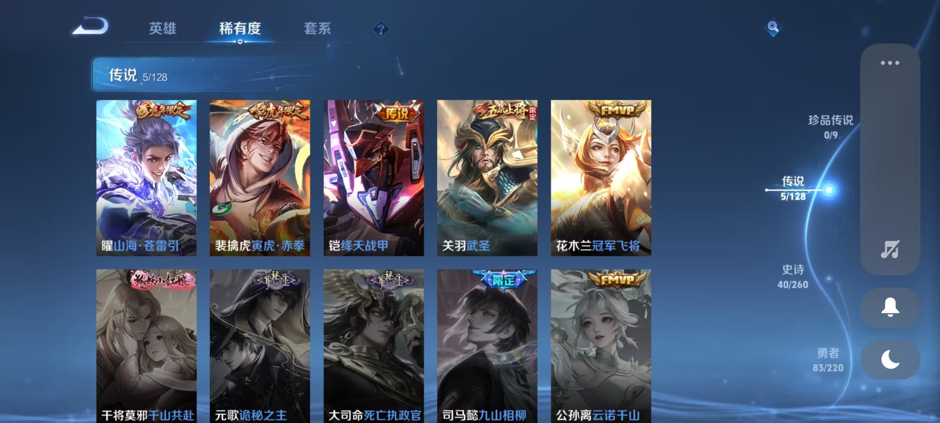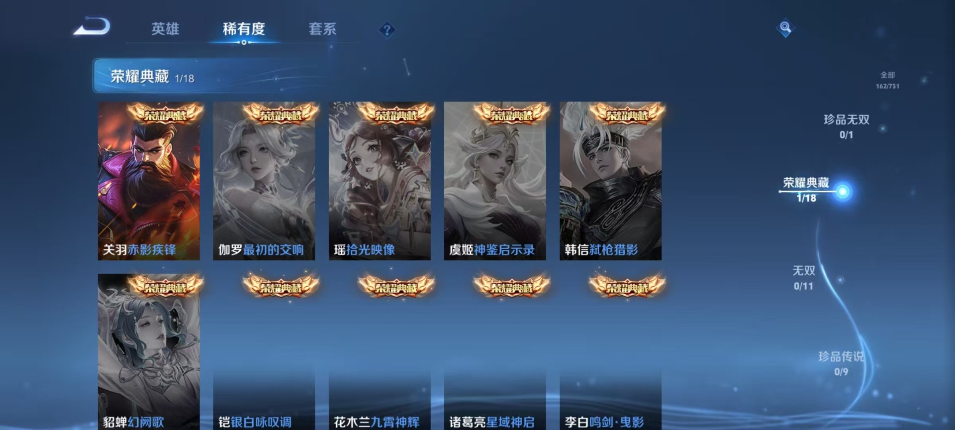 夏侯惇朔风刀,老夫子醍醐杖,沈梦溪大漠名商,苏烈千军破阵,达摩沙漠行僧,兰陵王金庭之子,裴擒虎擒涛扼浪,鲁班大师探海日志,明世隐疑决卦,鬼谷子原初探秘者,张良古海寻踪,桑启海盐诗旅,狄仁杰万华元夜,程咬金演武夺筹,李元芳云中旅人,弈星混沌棋,钟馗驱傩正仪