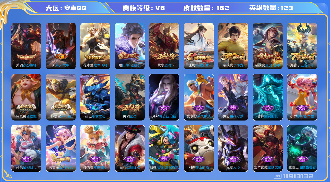[11913132]V6 1典藏 5传说 123英雄 162皮肤 可修改实名 优质装备:赤影疾锋,冠军飞将,绛天战甲(鸡嘴战神),山海·苍雷引(电光曜子) 珍宝阁皮:胡桃夹子,女武神,玩趣恶龙 限定皮:高山流水,五谷丰年,武圣,烈魂,李小龙,孙行者,猪悟能,引擎之心,寅虎·赤拳(老虎年限) 史诗皮:百相守梦-黄忠,特工魅影,江河有灵,真我赫兹(百里守约),蒙恬荣光圣徽,电玩·爆裂旋风,龙骑士(小龙虾),猫狗日记-孙策,修罗,水果甜心,绅士熊喵,功夫厨神,德古拉伯爵,暗隐猎兽者,幽灵船长,鬼剑武藏,心灵战警,缤纷独角兽,乘风破浪,逐浪之夏,金属风暴,原初追逐者,圣诞狂欢,圣诞恋歌,鹰眼统帅,魅力维加斯,黎明之约,无心