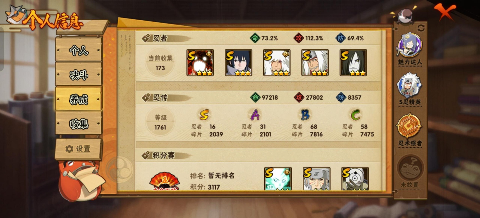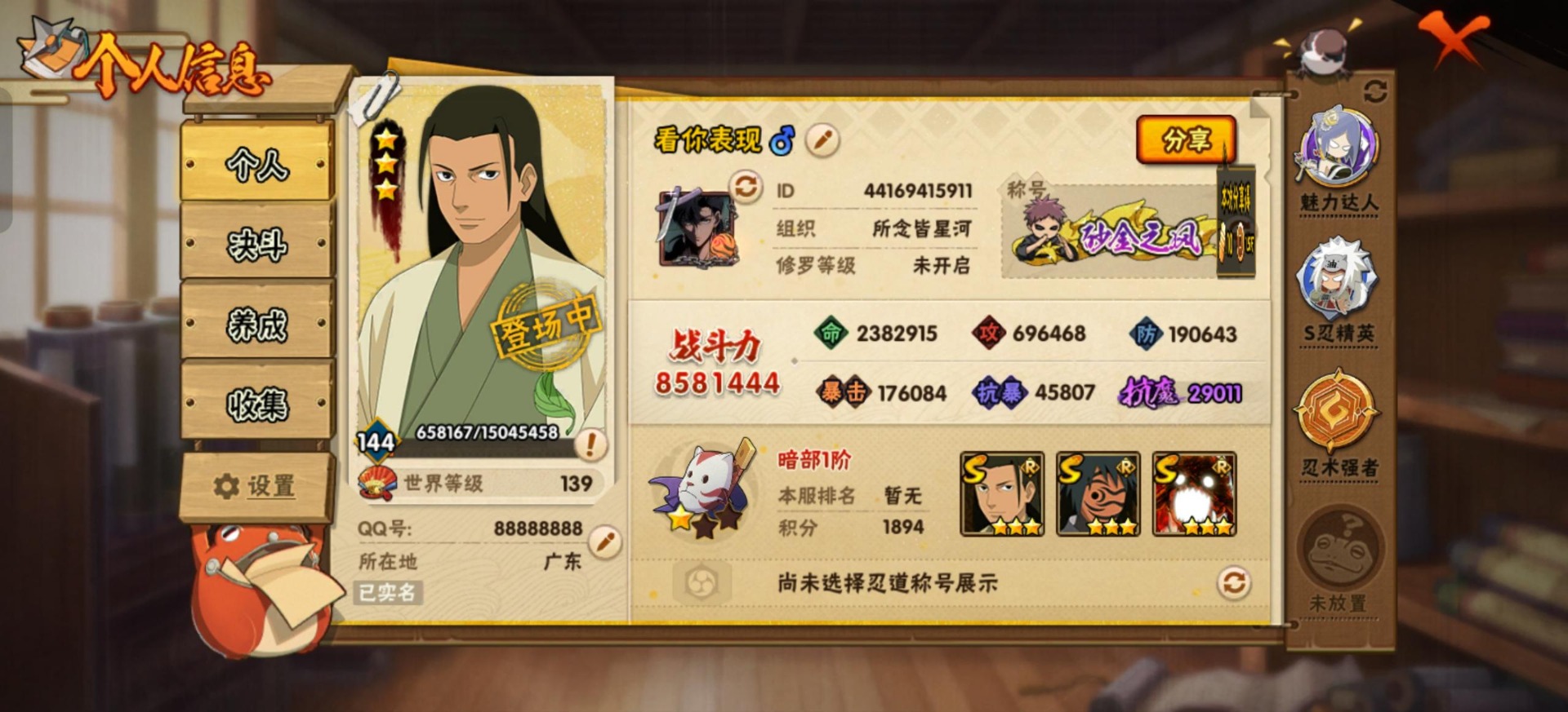 [11913148]V10 16S忍 31A忍 16通灵 858.1W战力 可二次 可修改实名 优质装备:千手扉间「秽土转生」,纲手「百豪」,宇智波带土 「忍界大战」,“宇智波斑” 「白面具」,神秘面具男 「红夜之刃」,宇智波佐助「永恒万花筒」,千手柱间·木叶创立,宇智波斑「秽土转生·解」,大筒木舍人 「最终章」,漩涡鸣人 「暴怒·第六尾」 S级忍者:自来也 「舞之豪杰」,宇智波鼬 「须佐能乎」,佩恩「天道」,波风水门,大蛇丸,自来也