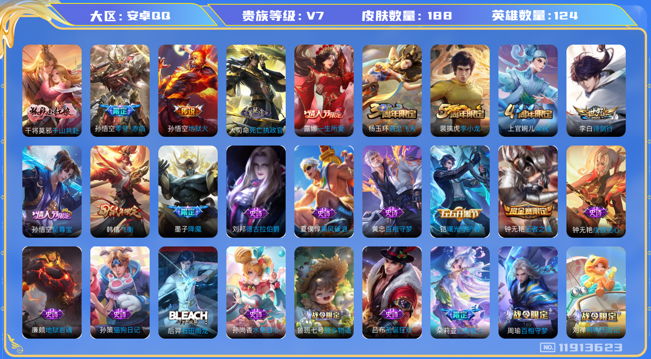 - [11586529]V7 6传说 125英雄 167皮肤 典藏英雄武则天 可修改实名 优质装备:黄金射手座,地狱之眼 传说皮:幻光神枪 珍宝阁皮:优雅恋人 限定皮:愿照·岁时盈(虞姬年限),愿照·山河定(司空震年限),白虎志(电光耗子),遇见飞天,梁祝,李小龙,玄武志(苏烈年限),大圣娶亲 史诗皮:鸭鸭历险记-刘禅,器灵·浮梦炉,龙之律动,东方月初,蔬乡物语(鲁班七号),苍穹之光,永昼,冰冠公主,偶像歌手,晚萤,暗夜猫娘,龙骑士(小龙虾),末日机甲-吕布,乱世虎臣,女仆咖啡,水果甜心,天才门将,功夫厨神,乐园奇幻夜,地狱岩魂,纤云弄巧,繁星吟游(呼啦呼啦),缤纷独角兽,乘风破浪,逐浪之夏,曙光守护者,金属风暴,原初追逐者,圣诞狂欢,圣诞恋歌,鹰眼统帅,暗夜贵公子,魅力维加斯,黎明之约