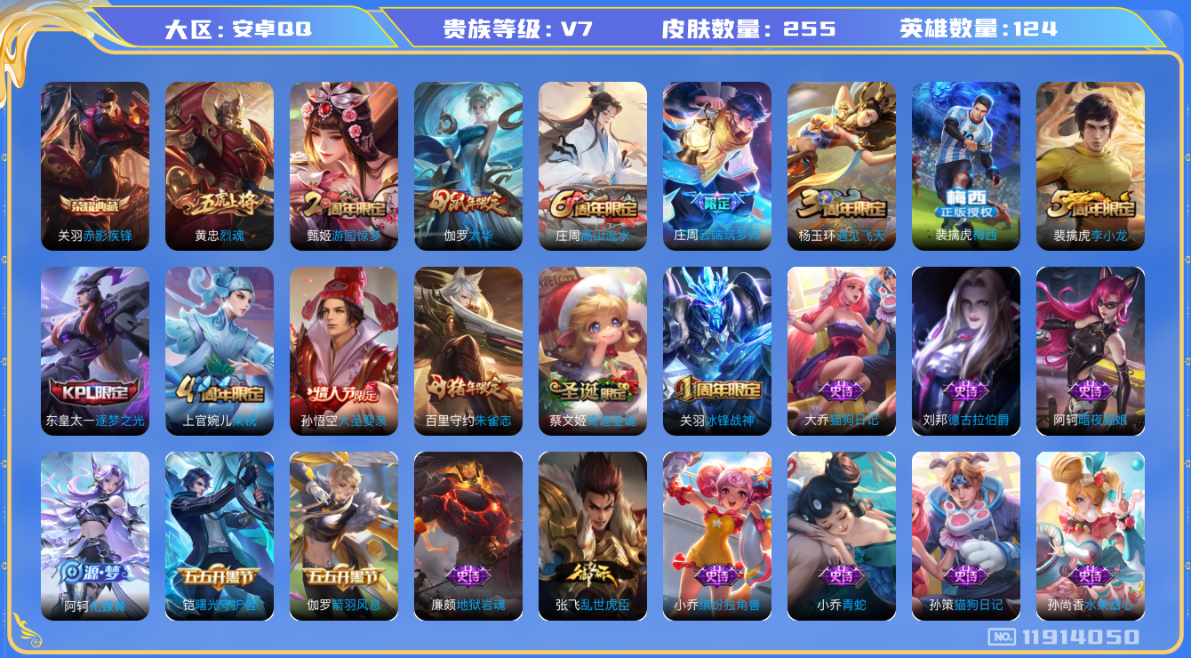 [11914050]V7 1典藏 1传说 124英雄 255皮肤 可修改实名 优质装备:赤影疾锋,涂山容容 珍宝阁皮:蔷薇恋人 限定皮:太华(伽罗年限),梅西,遇见飞天,高山流水,冰锋战神,游园惊梦,梁祝,烈魂,李小龙,逐梦之光,朱雀志(守约年限),奇迹圣诞,大圣娶亲,云端筑梦师 史诗皮:鸭鸭历险记-刘禅,化蝶舞,百相守梦-周瑜,蔬乡物语(鲁班七号),紫霞仙子,电玩小子(小书包),千年之狐,魅语,冰冠公主,青蛇,偶像歌手,暗夜猫娘,猫狗日记-孙策,猫狗日记-大乔,乱世虎臣,女仆咖啡,摇滚巨星,水果甜心,天才门将,星夜王子,德古拉伯爵,暗隐猎兽者,鬼剑武藏,心灵战警,地狱岩魂,繁星吟游(呼啦呼啦),缤纷独角兽,逐浪之夏,水晶猎龙者,曙光守护者,箭羽风息,金属风暴,原初追逐者,圣诞狂欢,圣诞恋歌,鹰眼统帅,暗夜贵公子,魅力维加斯,黎明之约,未来纪元-赵云