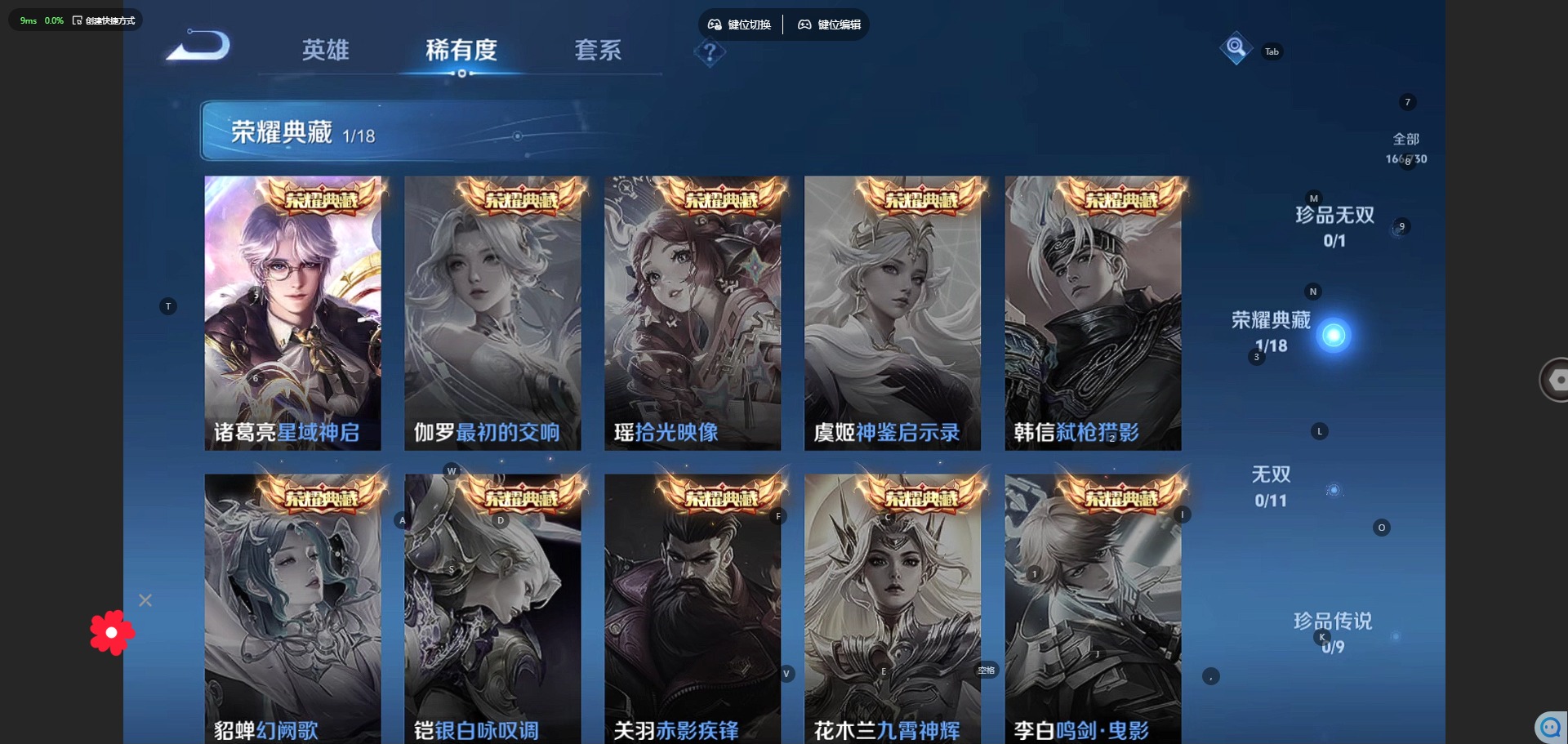 阿轲节奏热浪,铠曙光守护者,赵怀真器灵·浮梦炉,吕布末日机甲,刘禅电玩·爆裂旋风,司马懿暗渊魔法,刘禅天才门将,宫本武藏鬼剑武藏,兰陵王暗隐猎兽者,李白谪仙醉月,花木兰水晶猎龙者,李白千年之狐,程咬金功夫厨神,百里玄策原初追逐者,雅典娜冰冠公主,李元芳逐浪之夏,百里守约特工魅影,墨子金属风暴