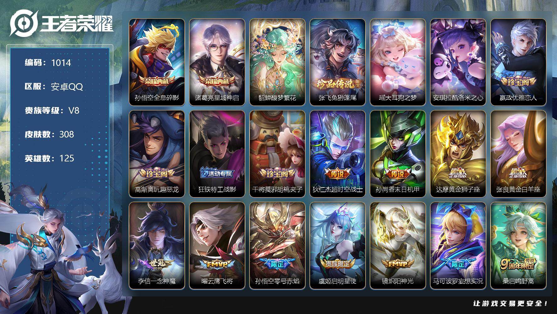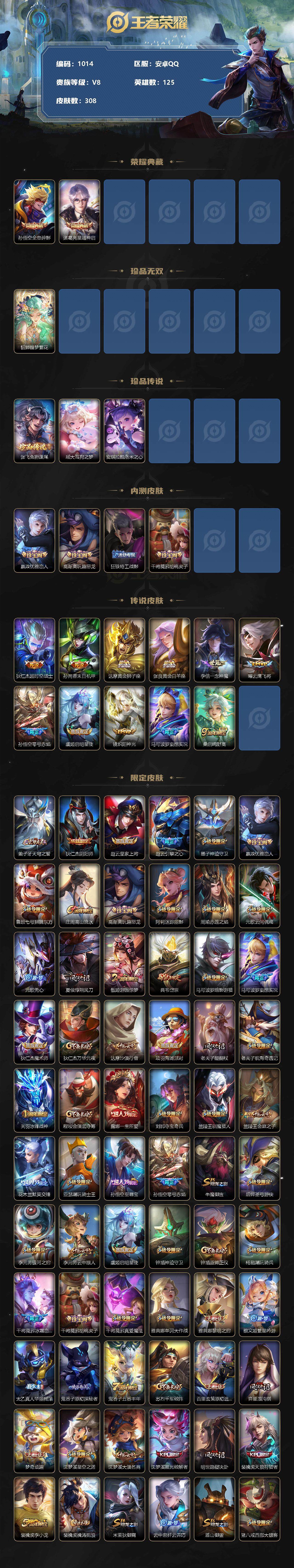 [11917907]【商品标题】:安卓Q-V8-至尊星耀III段位-125英雄-308皮肤-2典藏-1珍品无双-0无双-3珍品传说-11传说-88史诗