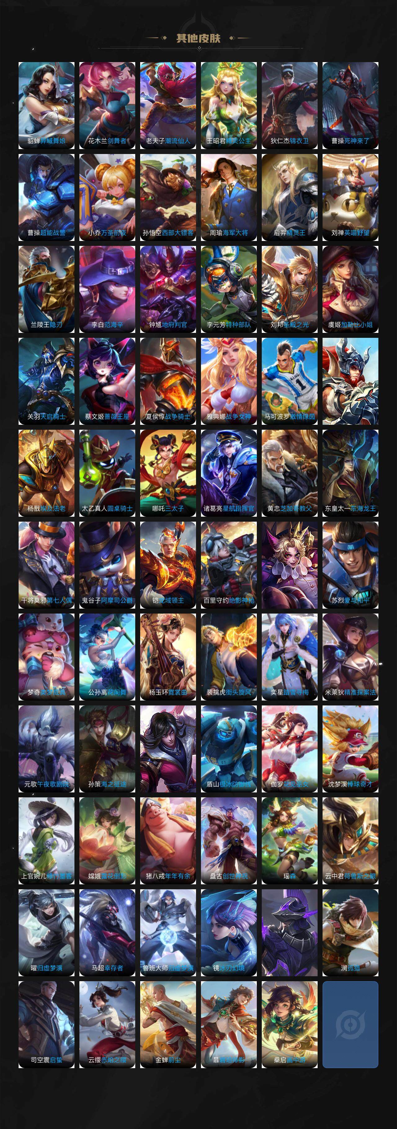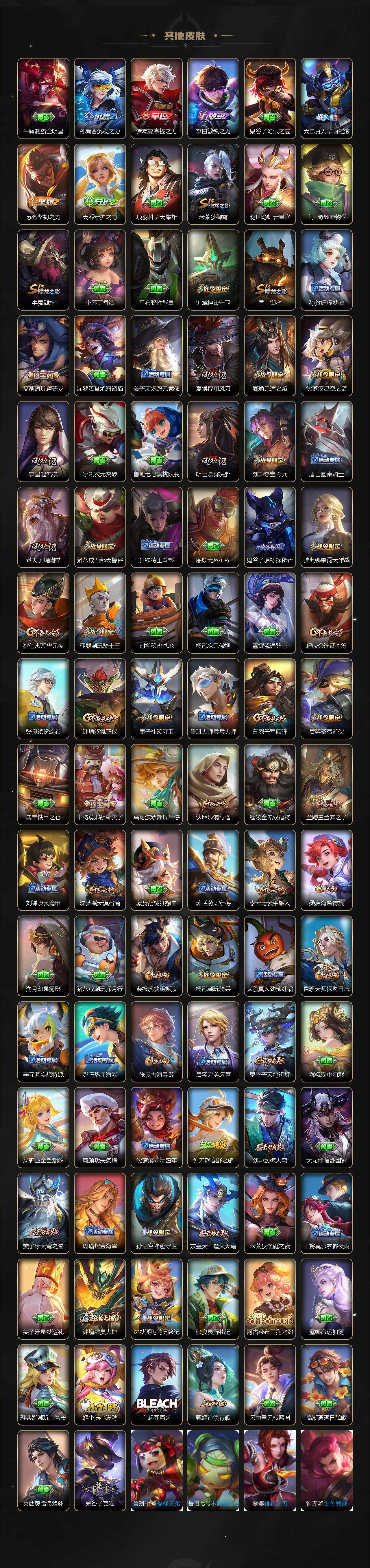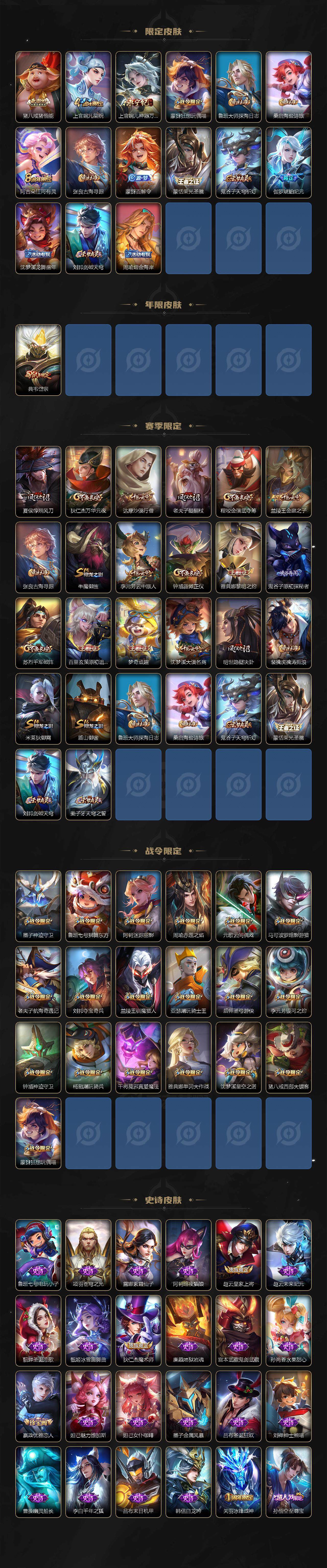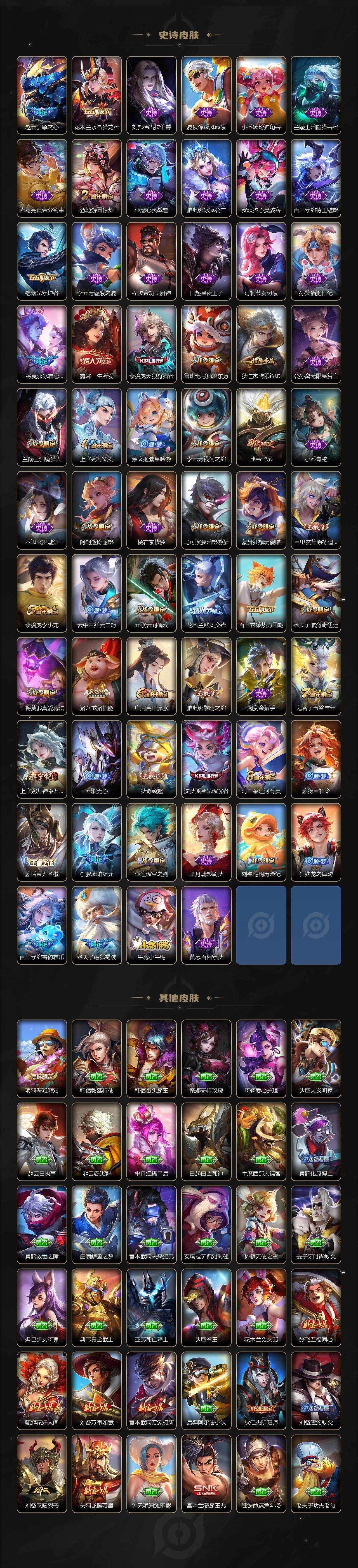 【限定皮肤】:姜子牙天穹之誓,狄仁杰阴阳师,赵云皇家上将,赵云引擎之心,墨子神迹守卫,嬴政优雅恋人,鲁班七号狮舞东方,庄周高山流水,高渐离玩趣恶龙,阿轲迷踪丽影,周瑜赤莲之焰,元歌云间偶戏,元歌无心,夏侯惇朔风刀,甄姬游园惊梦,典韦岱宗,马可波罗暗影游猎,马可波罗妄想实况,狄仁杰魔术师,狄仁杰万华元夜,达摩沙漠行僧,项羽海滩派对,老夫子醍醐杖,老夫子航海奇遇记,关羽冰锋战神,程咬金演武夺筹,露娜一生所爱,刘邦夺宝奇兵,兰陵王驯魔猎人,兰陵王金庭之子,花木兰默契交锋,亚瑟潮玩骑士王,孙悟空至尊宝,孙悟空零号赤焰,牛魔御旌,后羿圣弓游侠,李元芳银河之约,李元芳云中旅人,虞姬启明星使,钟馗神迹守卫,钟馗驱傩正仪,杨戬潮玩骑兵,干将莫邪冰霜恋舞曲,干将莫邪胡桃夹子,干将莫邪真爱魔法,雅典娜单词大作战,雅典娜黎明之约,蔡文姬繁星吟游,太乙真人华丽摇滚,鬼谷子原初探秘者,鬼谷子五谷丰年,苏烈千军破阵,百里玄策原初追逐者,弈星混沌棋,梦奇顽趣,沈梦溪星空之诺,沈梦溪大漠名商,沈梦溪匿光破解者,明世隐疑决卦,裴擒虎天狼狩猎者,裴擒虎李小龙,裴擒虎擒涛扼浪,米莱狄御霄,云中君纤云弄巧,盾山御銮,猪八戒西部大镖客,猪八戒猪悟能,上官婉儿梁祝,上官婉儿神器万象笔,蒙犽狂想玩偶喵,鲁班大师探海日志,桑启海盐诗旅,阿古朵江河有灵,张良古海寻踪,蒙犽百解令,蒙恬荣光圣徽,鬼谷子天穹祈灯,伽罗琥珀纪元,沈梦溪龙舞盛年,刘邦剑破天穹,周瑜熔金海岸