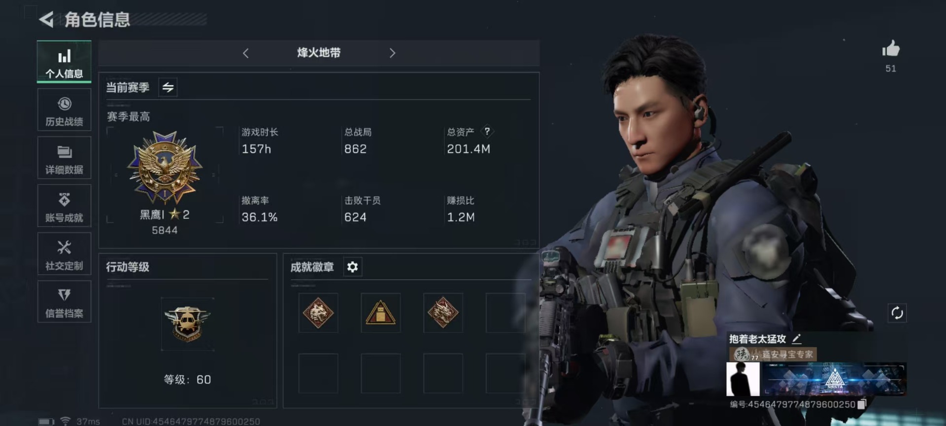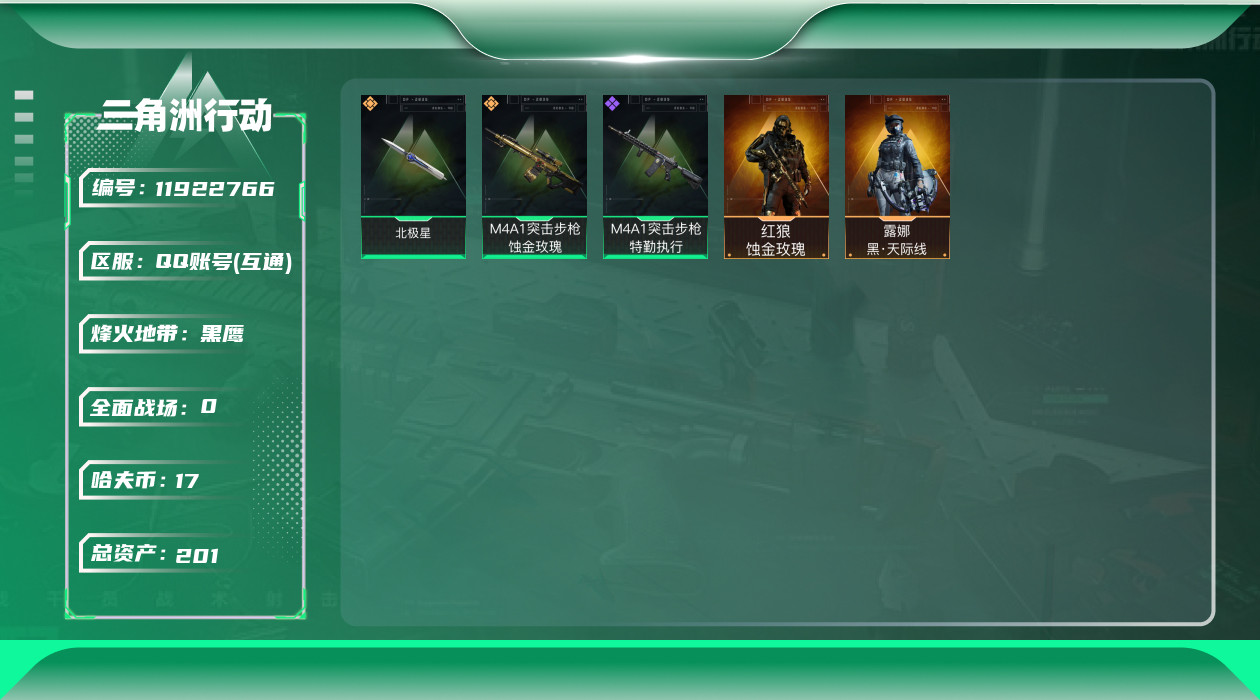 [11922766]总资产:201.4 2干员外观 1近战传说 2传说枪械 可二次 可修改实名 优质装备:近战-北极星 烽火地带段位:黑鹰 全面战场段位:上等兵 哈夫币:17.708 传说武器皮肤:M4A1突击步枪-蚀金玫瑰 史诗武器皮肤:M4A1突击步枪-特勤执行 干员外观:红狼-蚀金玫瑰,露娜-黑·天际线