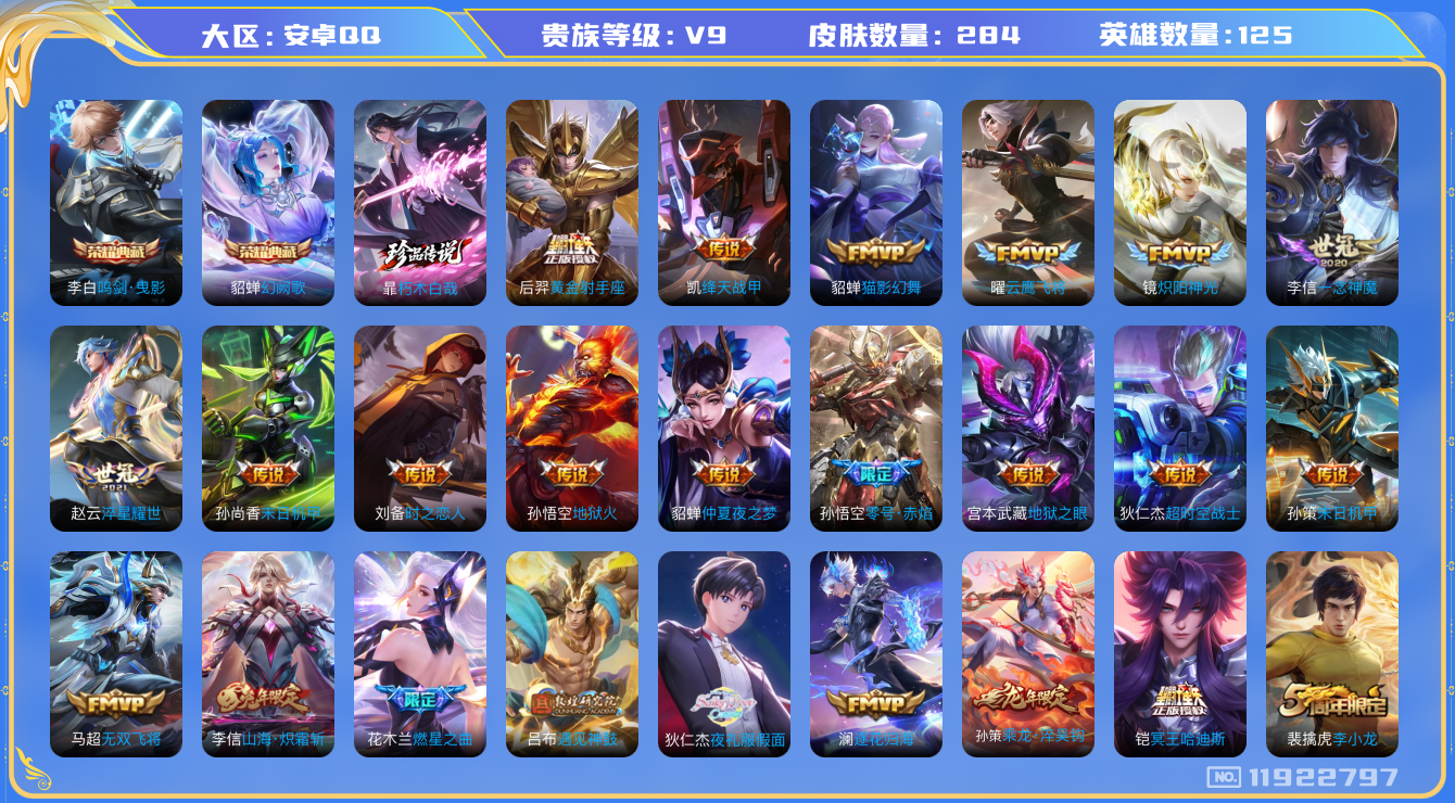 [11922797]【商品标题】:安卓Q-V9-最强王者段位-125英雄-284皮肤-2典藏-0珍品无双-0无双-1珍品传说-30传说-88史诗