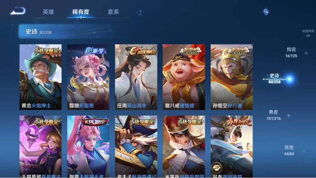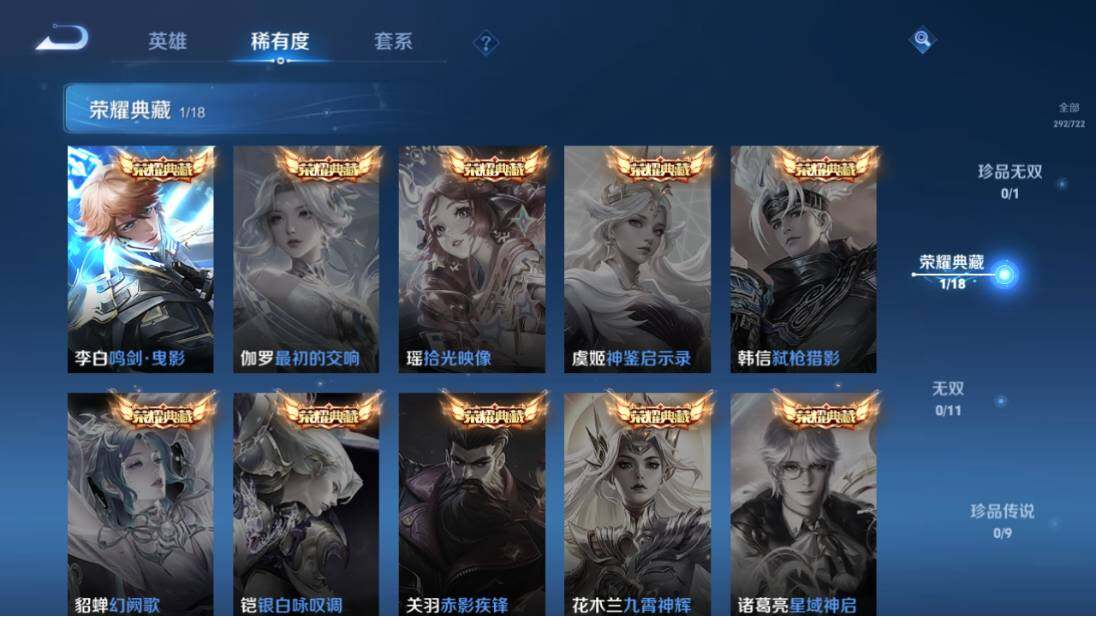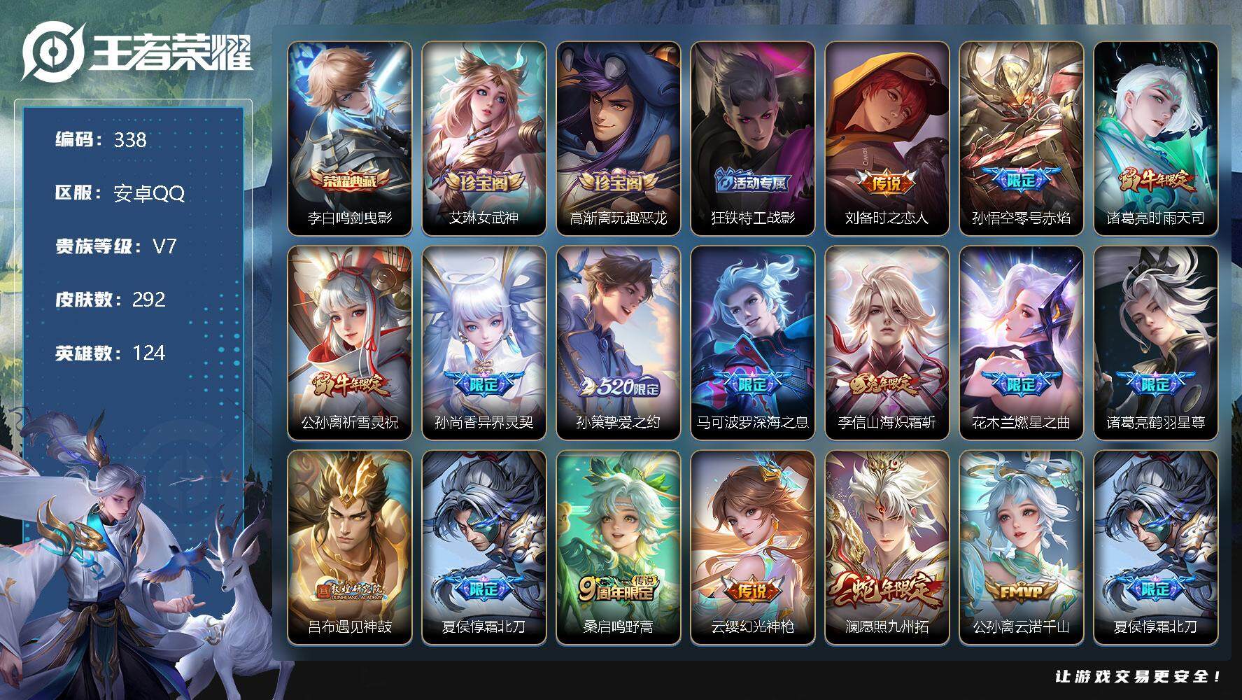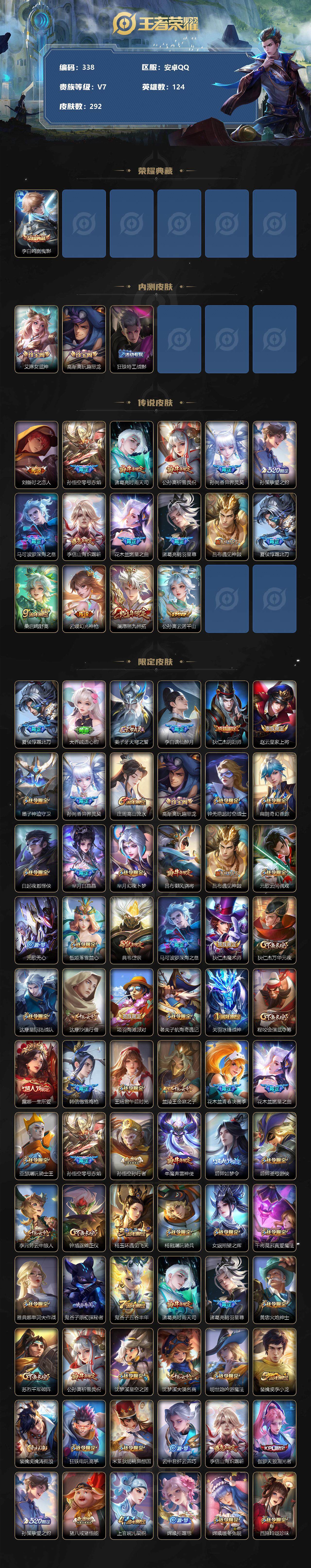 [11923854]【商品标题】:安卓Q-V7-至尊星耀V段位-124英雄-292皮肤-1典藏-0珍品无双-0无双-0珍品传说-16传说-79史诗