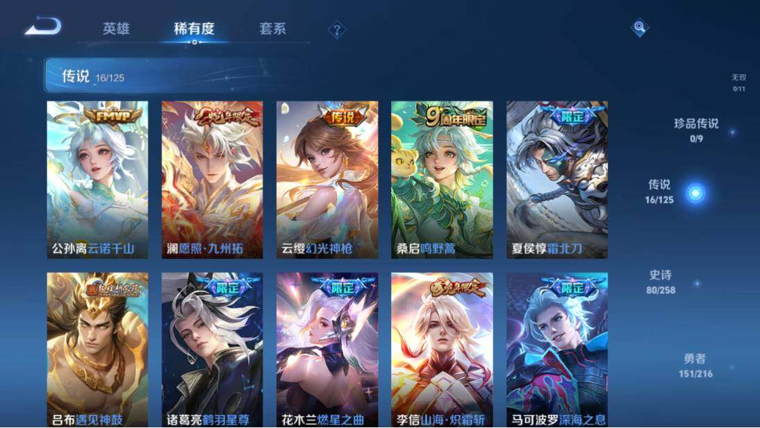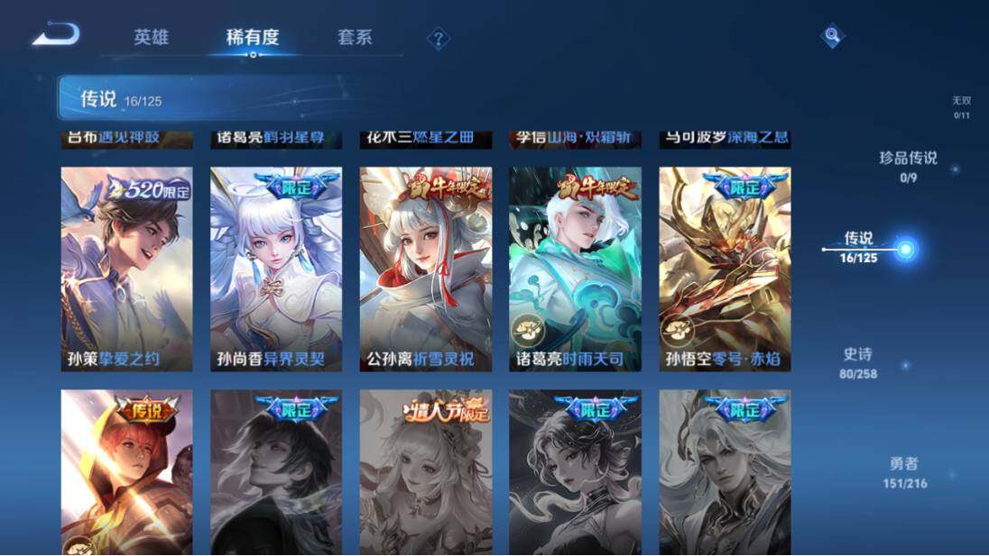 【传说皮肤】:刘备时之恋人,孙悟空零号赤焰,诸葛亮时雨天司,公孙离祈雪灵祝,孙尚香异界灵契,孙策挚爱之约,马可波罗深海之息,李信山海炽霜斩,花木兰燃星之曲,诸葛亮鹤羽星尊,吕布遇见神鼓,夏侯惇霜北刀,桑启鸣野蒿,云缨幻光神枪,澜愿照九州拓,公孙离云诺千山