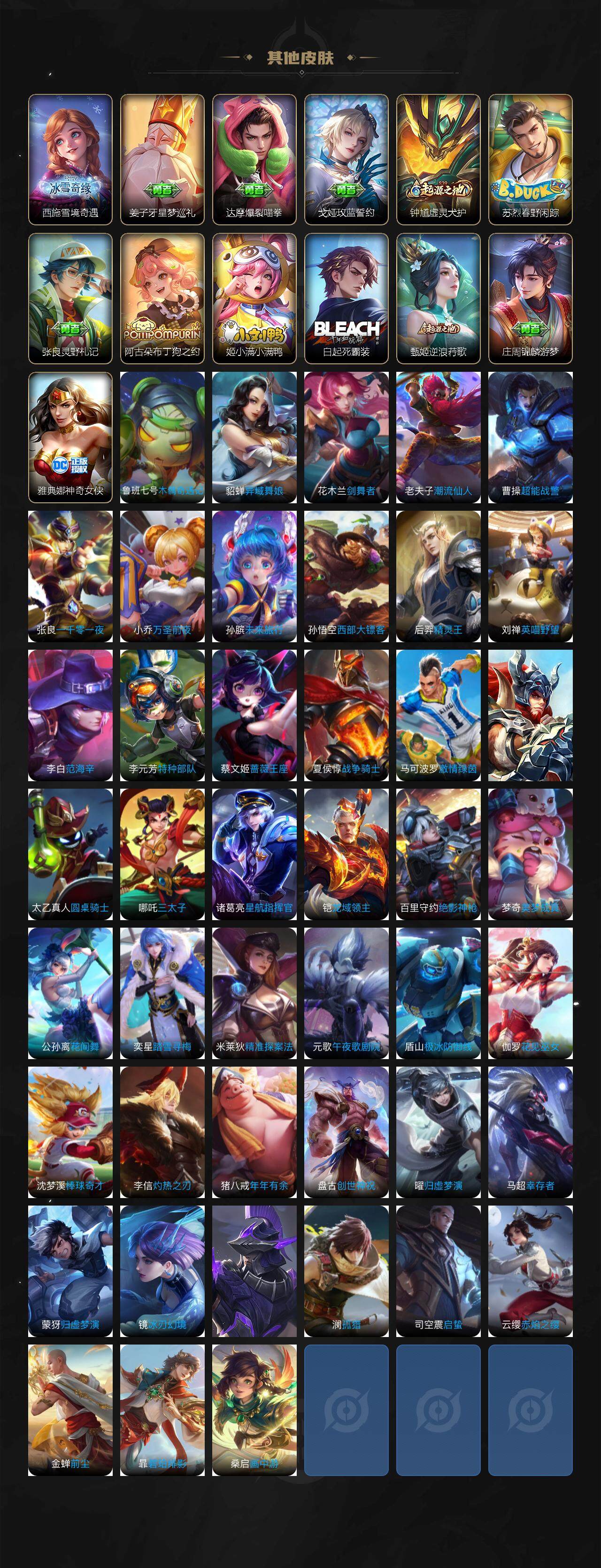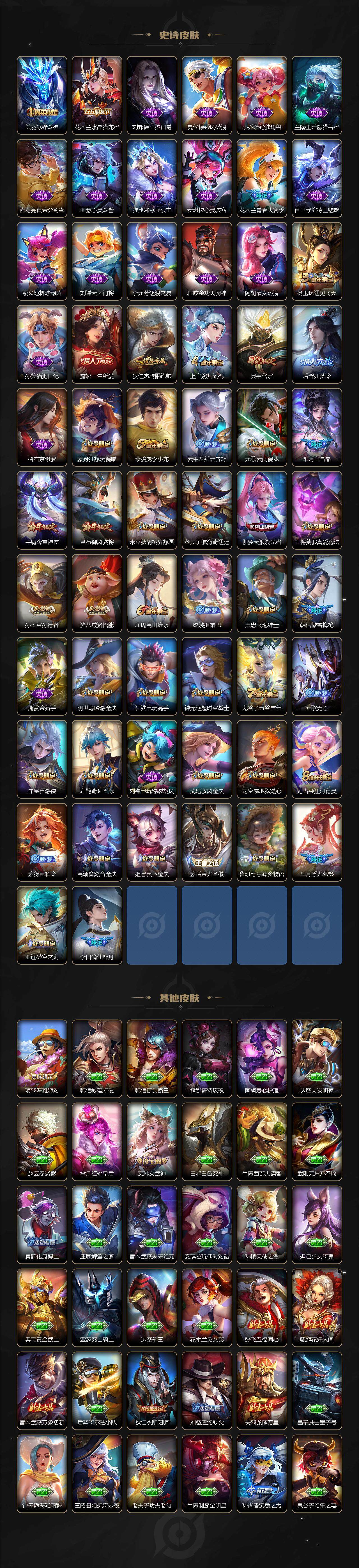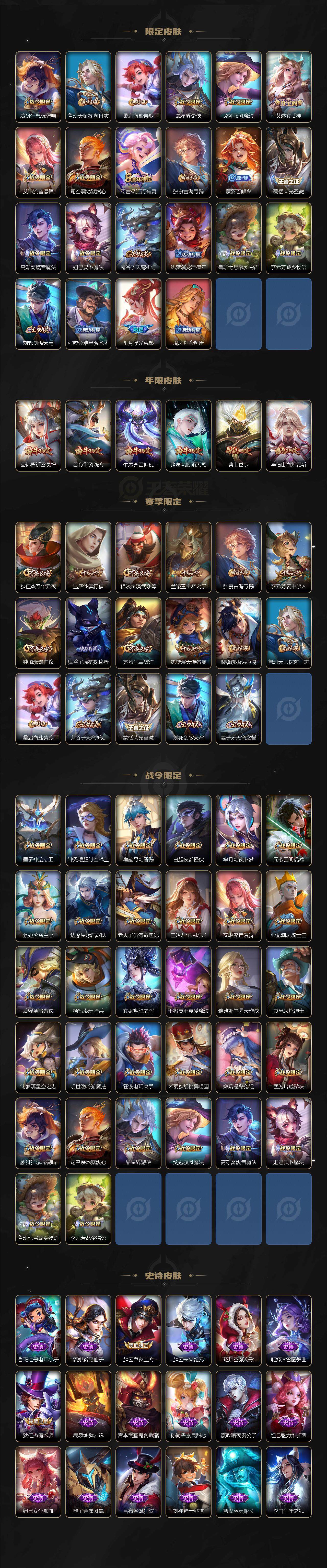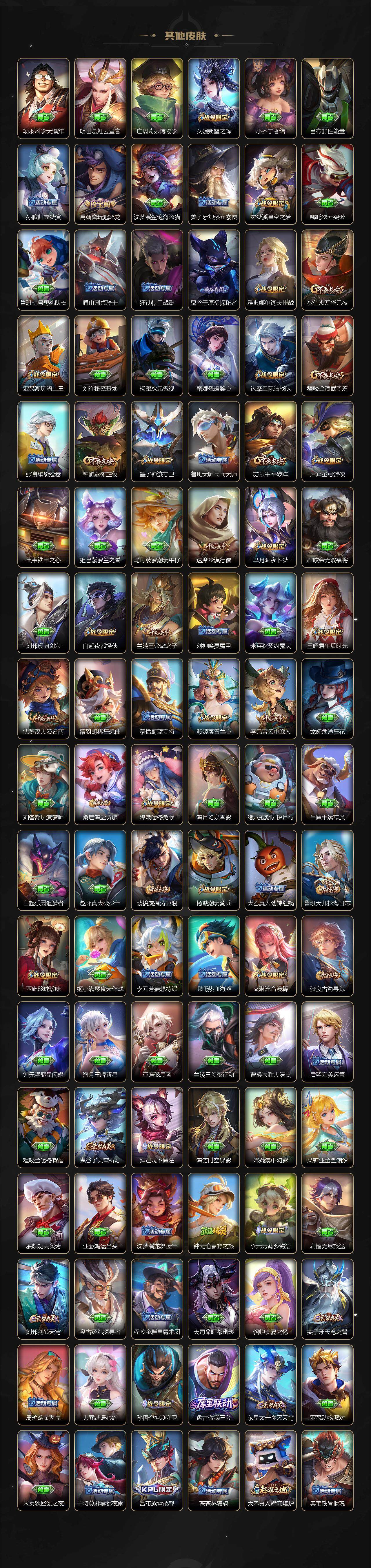 【限定皮肤】:夏侯惇霜北刀,大乔绒语心约,姜子牙天穹之誓,李白谪仙醉月,狄仁杰阴阳师,赵云皇家上将,墨子神迹守卫,孙尚香异界灵契,庄周高山流水,高渐离玩趣恶龙,钟无艳超时空战士,扁鹊奇幻香踪,白起夜都怪侠,芈月白晶晶,芈月幻夜卜梦,吕布御风骁将,吕布遇见神鼓,元歌云间偶戏,元歌无心,甄姬落雪兰心,典韦岱宗,马可波罗深海之息,狄仁杰魔术师,狄仁杰万华元夜,达摩星际陆战队,达摩沙漠行僧,项羽海滩派对,老夫子航海奇遇记,关羽冰锋战神,程咬金演武夺筹,露娜一生所爱,韩信傲雪梅枪,王昭君午后时光,兰陵王金庭之子,花木兰青春决赛季,花木兰燃星之曲,亚瑟潮玩骑士王,孙悟空零号赤焰,孙悟空孙行者,牛魔奔雷神使,后羿如梦令,后羿圣弓游侠,李元芳云中旅人,钟馗驱傩正仪,杨玉环遇见飞天,杨戬潮玩骑兵,女娲朔望之晖,干将莫邪真爱魔法,雅典娜单词大作战,鬼谷子原初探秘者,鬼谷子五谷丰年,诸葛亮时雨天司,诸葛亮鹤羽星尊,黄忠火炮绅士,苏烈千军破阵,公孙离祈雪灵祝,沈梦溪星空之诺,沈梦溪大漠名商,明世隐吟游魔法,裴擒虎李小龙,裴擒虎擒涛扼浪,狂铁电玩高手,米莱狄胡桃异想国,云中君纤云弄巧,李信山海炽霜斩,伽罗天狼溯光者,孙策挚爱之约,猪八戒猪悟能,上官婉儿梁祝,嫦娥拒霜思,嫦娥暖冬兔眠,西施玲珑珍味,蒙犽狂想玩偶喵,鲁班大师探海日志,桑启海盐诗旅,暃星界游侠,戈娅驭风魔法,艾琳女武神,艾琳流音漫舞,司空震地狱燃心,阿古朵江河有灵,张良古海寻踪,蒙犽百解令,蒙恬荣光圣徽,高渐离燃音魔法,妲己灵卜魔法,鬼谷子天穹祈灯,沈梦溪龙舞盛年,鲁班七号蔬乡物语,李元芳蔬乡物语,刘邦剑破天穹,程咬金群星魔术团,芈月浮光幕影,周瑜熔金海岸