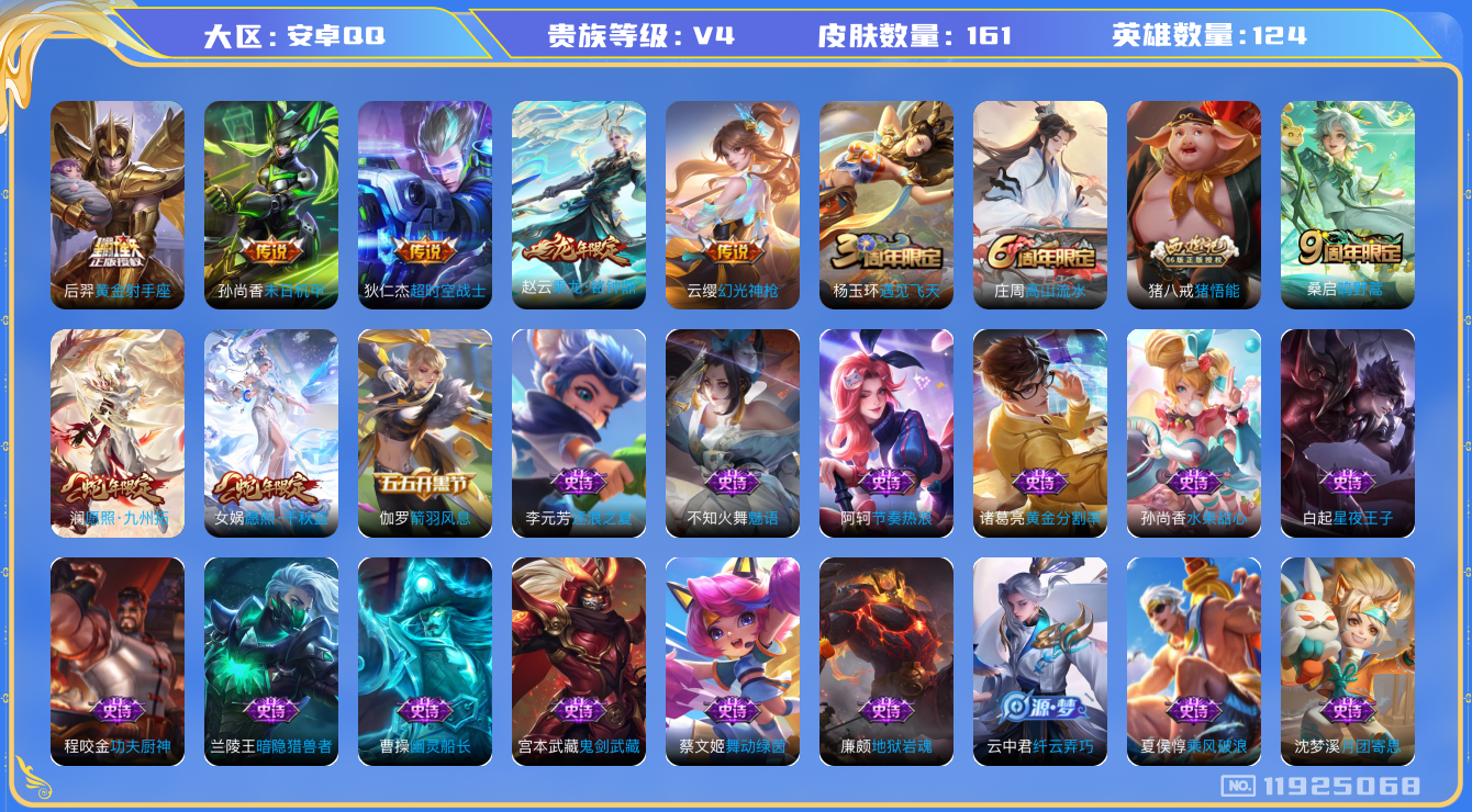 [11925068]【商品标题】:安卓Q-V4-永恒钻石III段位-124英雄-161皮肤-0典藏-0珍品无双-0无双-0珍品传说-8传说-45史诗