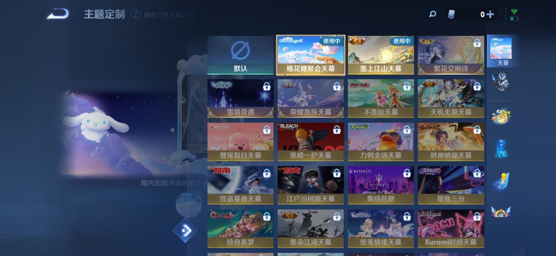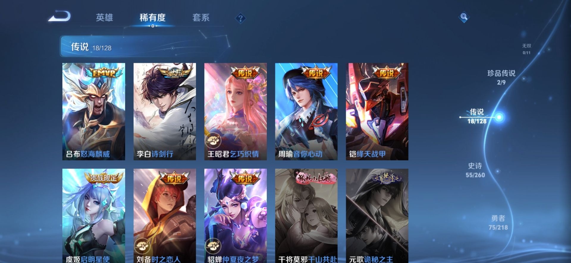 大乔白蛇,大乔猫狗日记,刘邦德古拉伯爵,刘备百相守梦,伽罗箭羽风息,廉颇地狱岩魂,小乔缤纷独角兽,鲁班七号电玩小子,项羽苍穹之光,吕布圣诞狂欢,诸葛亮黄金分割率,刘禅电玩·爆裂旋风,公孙离无限星赏官,兰陵王暗隐猎兽者,貂蝉圣诞恋歌,花木兰水晶猎龙者,安琪拉心灵骇客,安琪拉时之奇旅,艾琳奇遇舞章,亚瑟心灵战警,嬴政摇滚巨星,雅典娜黎明之约,李元芳逐浪之夏,百里守约特工魅影,墨子龙骑士,蔡文姬舞动绿茵,王昭君偶像歌手,橘右京修罗