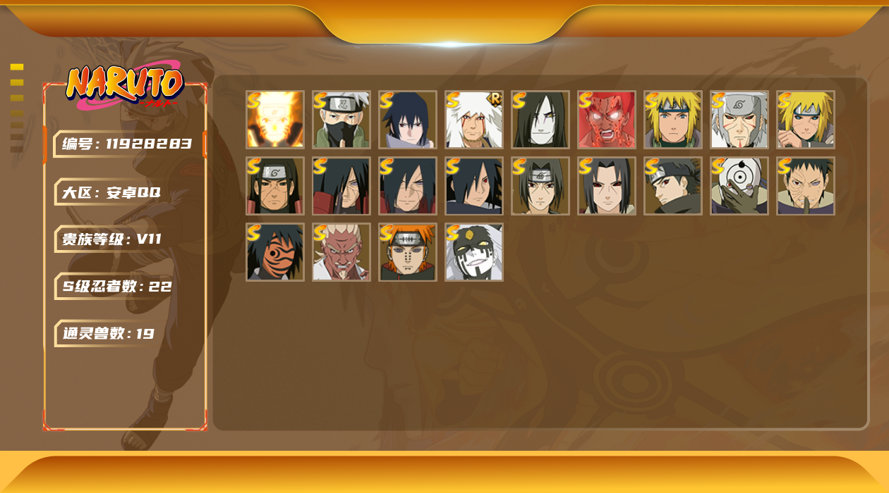 [11928283]V11 22S忍 48A忍 19通灵 1041.1W战力 可二次 可修改实名 优质装备:熊猫,千手柱间「秽土转生」,宇智波鼬「秽土转生」,宇智波斑「秽土转生」,宇智波斑 「木叶创立」,千手扉间「秽土转生」,波风水门「秽土转生」,迈特凯「死门」,宇智波带土 「忍界大战」,“宇智波斑” 「白面具」,漩涡鸣人 「九喇嘛连结」,神秘面具男 「红夜之刃」,宇智波佐助「永恒万花筒」,宇智波斑「秽土转生·解」,大筒木桃式,艾「忍界大战」,宇智波止水「须佐能乎」,旗木卡卡西「须佐能乎」 S级忍者:自来也 「舞之豪杰」,宇智波鼬 「须佐能乎」,佩恩「天道」,波风水门,大蛇丸