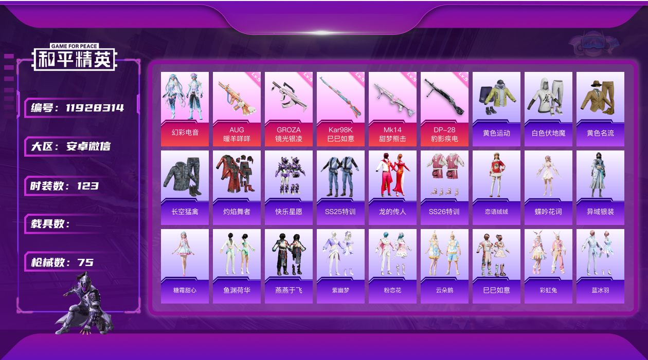 [11928314]1粉装 5特效枪 3印记 可二次 可修改实名 优质装备:GROZA-镜光银凌,AUG-暖羊咩咩,MK14-甜梦熊击,幻彩电音,Kar98K-巳巳如意 稀有枪皮:DP-28-豹影疾电 五级特效枪:五级GROZA-镜光银凌,五级Kar98K-巳巳如意,五级DP-28-豹影疾电,五级MK14-甜梦熊击,五级AUG-暖羊咩咩 紫色装扮:SS31特训套装,SS30特训套装,云朵鹅,彩虹兔,雪绒豹,SS33特训套装,顶瓜瓜,快乐星愿,长空猛禽,黄色名流,黄色运动,龙的传人,熔岩游骑兵连帽夹克,白色伏地魔,灼焰舞者,异域银装,鱼渊荷华,燕燕于飞,巳巳如意,SS25特训,蝶吟花词,SS26特训,大橘大利,星影赞美诗,粉恋花,蓝冰羽,紫幽梦,SS32特训服(SS32特训套装),糖霜甜心,恋语绒绒 优质战备:镜光幻境飞行器(镜光幻境飞行翼),时光之吻降落伞,智耀战神降落伞,彩虹独角兽降落伞