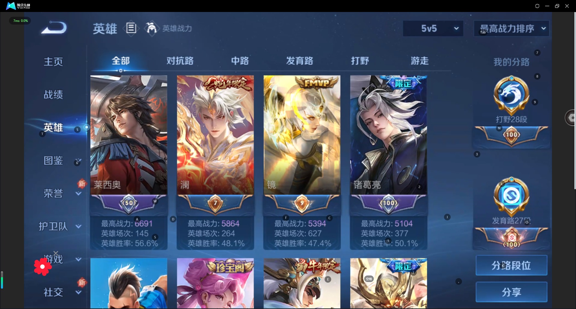 - [11526821]V7 1典藏 1珍品传说 11传说 124英雄 198皮肤 可修改实名 优质装备:神鉴启示录,器灵·落星盏,黄金狮子座,超时空战士-狄仁杰,浮生妄,百相守梦(张飞),霜月吟 珍宝阁皮:妄想食味 限定皮:愿照·岁时盈(虞姬年限),愿照·山河定(司空震年限),愿照·千秋盛(女娲年限),映山客,鸣野蒿,太华(伽罗年限),李小龙,寅虎·心曲(虎婆),神器·万象笔,山海·玄木吟(马可年限) 史诗皮:器灵·浮梦炉,化蝶舞,星界战将,龙之律动,石田雨龙,茶境仙,破空之剑,蒙犽顽岩魄,海诺心动手记,夜落电台,乘龙·聚宝船(安琪拉年限),百相守梦-黄忠,织梦人,遇见神鹿,特工魅影,真我赫兹(百里守约),闲日渔趣,蒙恬荣光圣徽,冰冠公主,偶像歌手,白蛇,电玩·兔顽号,电玩·爆裂旋风,银翎春语,龙骑士(小龙虾),末日机甲-吕布,猫狗日记-孙策,猫狗日记-大乔,乱世虎臣,摇滚巨星,水果甜心,时之奇旅-安琪拉,德古拉伯爵,幽灵船长,鬼剑武藏,心灵战警,乐园奇幻夜,舞动绿茵,乘风破浪,逐浪之夏,金属风暴,鹰眼统帅,魅力维加斯,滕王阁序,千筹问战