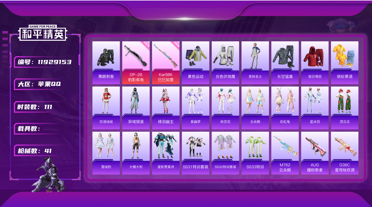 [11929153]2特效枪 3印记 可二次 可修改实名 优质装备:Kar98K-巳巳如意 热门装扮:鹰眼刺客 稀有枪皮:DP-28-豹影疾电 五级特效枪:五级DP-28-豹影疾电 三级特效枪:三级Kar98K-巳巳如意 紫色装扮:SS31特训套装,旭日情侣,云朵鹅,彩虹兔,雪绒豹,SS33特训套装,顶瓜瓜,长空猛禽,缤纷果语,绛羽幽主,黄色运动,白色伏地魔,异域银装,竞技名士,大橘大利,星影赞美诗,粉恋花,蓝冰羽,紫幽梦,SS32特训服(SS32特训套装),恋语绒绒 优质战备:冷漠罗丽降落伞,绯穹魔姬降落伞,智耀战神降落伞