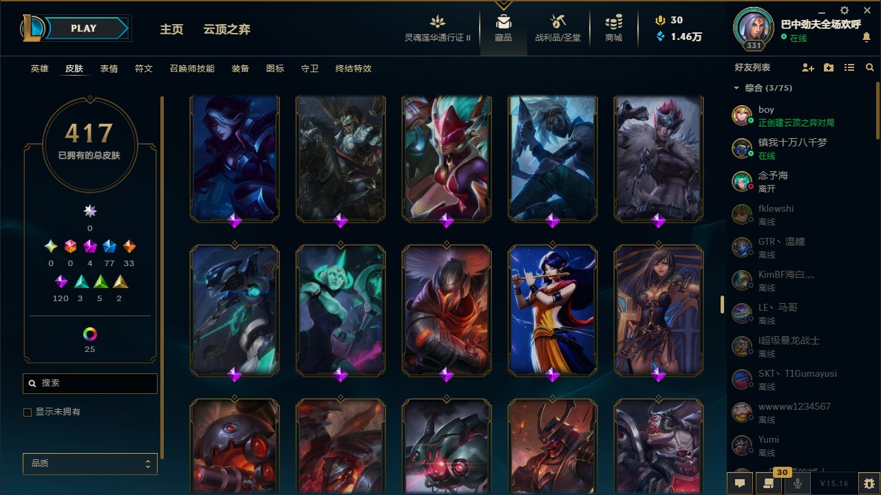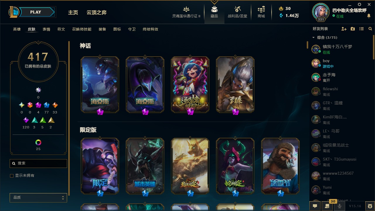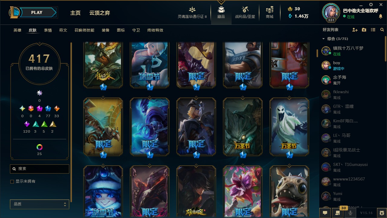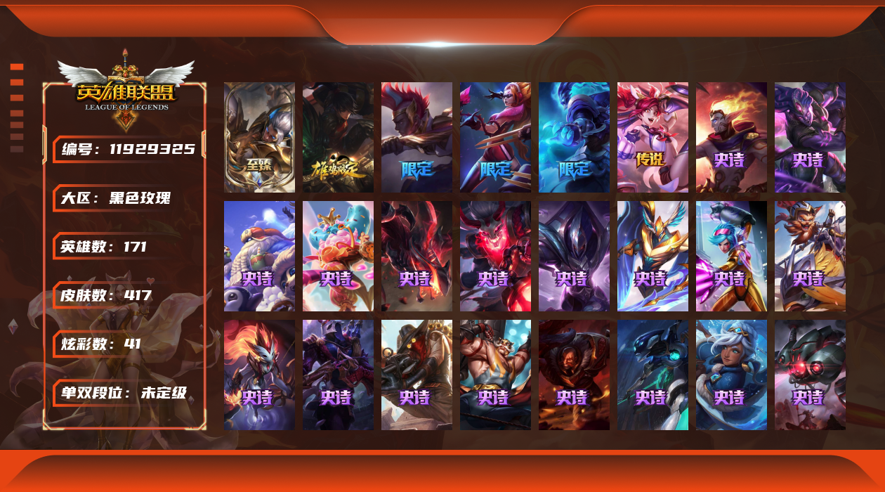 [11929325]可二次 可修改实名 4神话 8臻彩 77限定 33传说 120史诗 417皮肤 41炫彩 171英雄 铂金 皮肤:至臻 神龙尊者 炎龙瑟提,王国机神苍狼 瑟提,太空律动 “创乐之神” 奥恩,雷霆领主 奥恩,晨星之翎 洛,冰雪游神 巴德,腥红之月 卡莉丝塔,灌篮高手 艾翁,糖果之王 艾翁,上古战魂 雷克塞,虚空使者 俄洛伊,腥红之月 锤石,冠军典狱长 锤石,司马懿 仲达,星际之门 阿兹尔,海皇姬 娜美,鲛妮座人 娜美,胜利之剑 亚托克斯,仲裁圣骑 亚托克斯,源计划:裁决 蔚,虎痴之拳 蔚,霓虹杀拳 蔚,SKT T1 艾克,任性学霸 艾克,爵士 克烈,胜利枪神 卢锡安,纳财大帝 塔姆,海牛大大 塔姆,星之守护者 金克丝,神龙烈焰 金克丝,黯焰双魂 千珏,腥红之月 烬,西部牛仔 烬,糖果大战 布隆,布隆·狮心,猛虎 布隆,屠龙勇士 布隆,源代码 卡蜜尔,弗雷尔卓德 塔莉垭,这货不是维克兹,苍穹之光 维克兹,战地机甲 维克兹,源计划:风 亚索,西部牛仔 亚索,邪恶魔人 扎克,狂狮 纳尔,萌侦探 喵尔摩斯,最后一只恐龙 纳尔,魔女 婕拉,驯龙女巫 婕拉,SKT T1 婕拉,鬼影森森 婕拉,野火之藤 婕拉