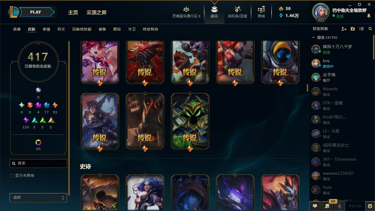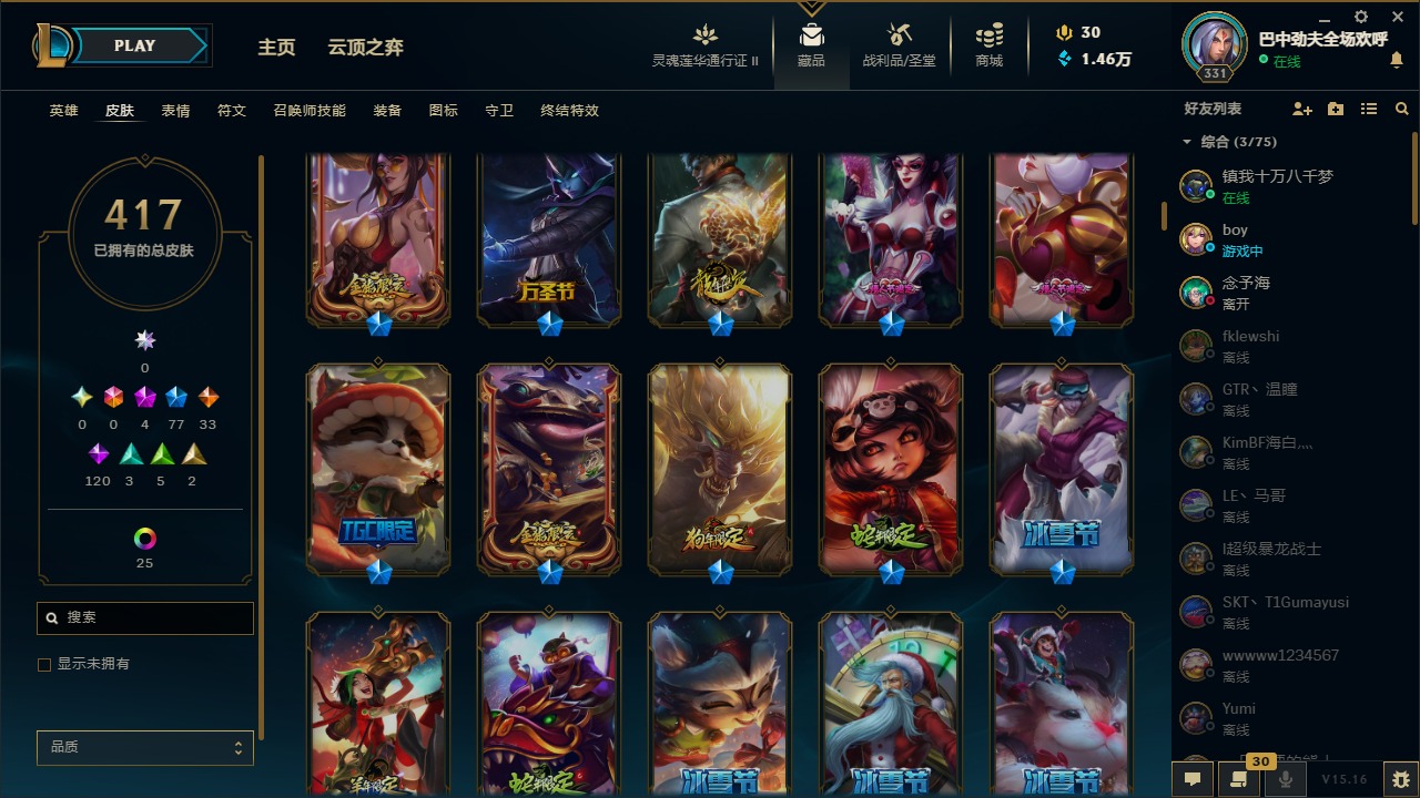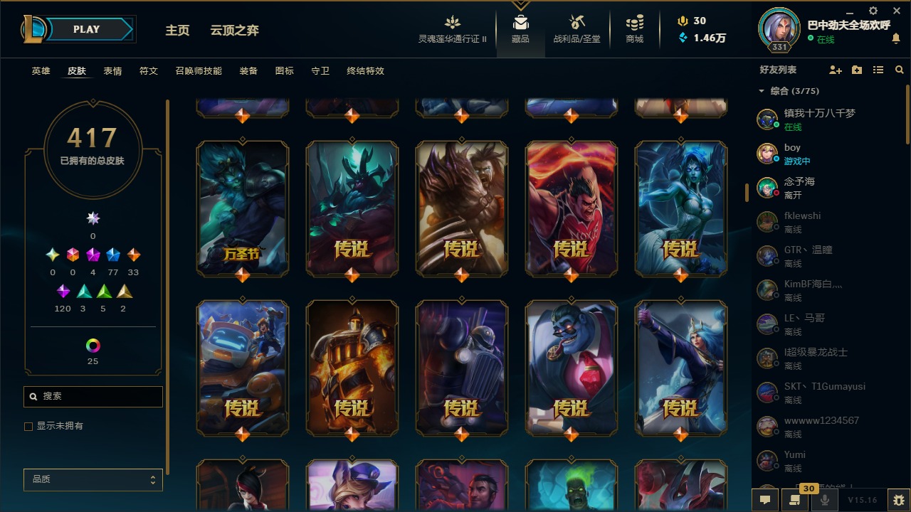 [11929325]可二次 可修改实名 4神话 8臻彩 77限定 33传说 120史诗 417皮肤 41炫彩 171英雄 铂金 皮肤:至臻 神龙尊者 炎龙瑟提,王国机神苍狼 瑟提,太空律动 “创乐之神” 奥恩,雷霆领主 奥恩,晨星之翎 洛,冰雪游神 巴德,腥红之月 卡莉丝塔,灌篮高手 艾翁,糖果之王 艾翁,上古战魂 雷克塞,虚空使者 俄洛伊,腥红之月 锤石,冠军典狱长 锤石,司马懿 仲达,星际之门 阿兹尔,海皇姬 娜美,鲛妮座人 娜美,胜利之剑 亚托克斯,仲裁圣骑 亚托克斯,源计划:裁决 蔚,虎痴之拳 蔚,霓虹杀拳 蔚,SKT T1 艾克,任性学霸 艾克,爵士 克烈,胜利枪神 卢锡安,纳财大帝 塔姆,海牛大大 塔姆,星之守护者 金克丝,神龙烈焰 金克丝,黯焰双魂 千珏,腥红之月 烬,西部牛仔 烬,糖果大战 布隆,布隆·狮心,猛虎 布隆,屠龙勇士 布隆,源代码 卡蜜尔,弗雷尔卓德 塔莉垭,这货不是维克兹,苍穹之光 维克兹,战地机甲 维克兹,源计划:风 亚索,西部牛仔 亚索,邪恶魔人 扎克,狂狮 纳尔,萌侦探 喵尔摩斯,最后一只恐龙 纳尔,魔女 婕拉,驯龙女巫 婕拉,SKT T1 婕拉,鬼影森森 婕拉,野火之藤 婕拉