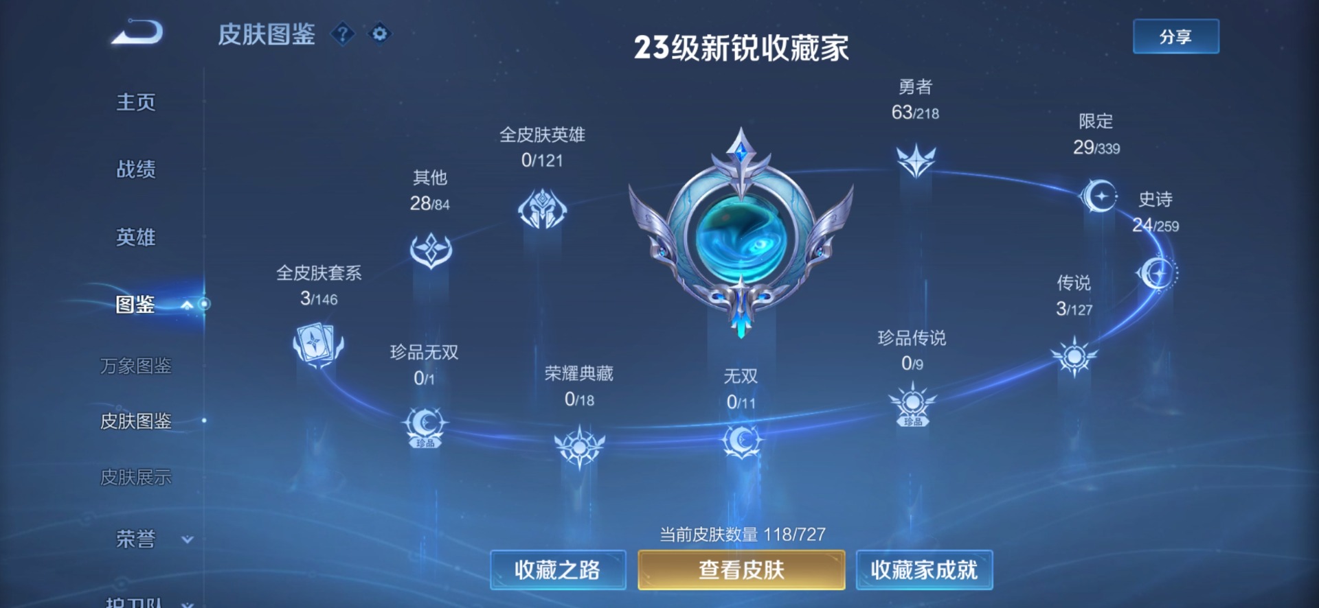 - PX_2101899-Q/非凡王者/273皮肤/125英雄/1典藏/0珍品无双/0无双/3珍品传说/20传说/90史诗/9稀有英雄 【3 珍品传说】朽木白哉 暃,怪盗基德 马可波罗,时之奇旅 孙策, 【1 典藏皮肤】鸣剑·曳影 李白, 【20 传说皮肤】启明星使 虞姬,无双飞将 马超,白虎志 百里玄策,云鹰飞将 曜,地狱之眼 宫本武藏,炽阳神光 镜,黄金射手座 后羿,怒海麟威 吕布,时之恋人 刘备