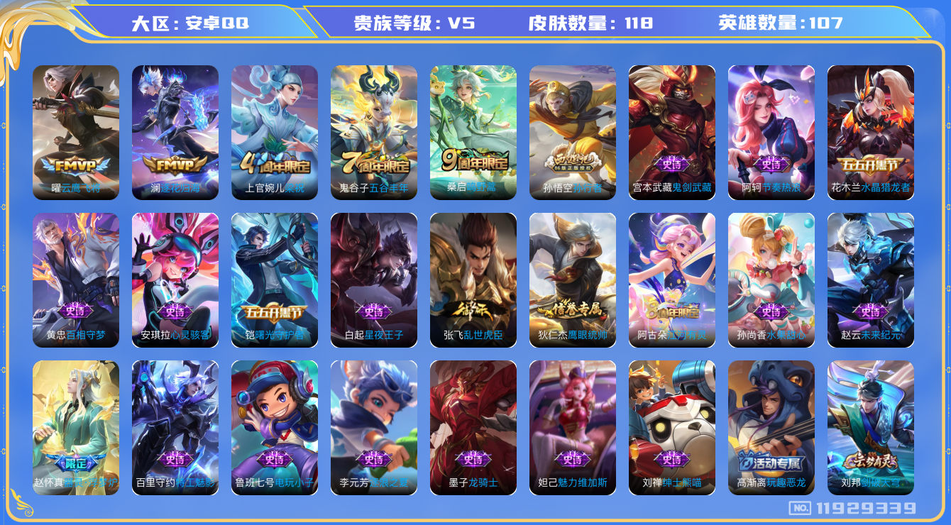 - [11604521]V9 2典藏 1珍品传说 26传说 124英雄 309皮肤 可修改实名 优质装备:鸣剑·曳影,银白咏叹调(倪克斯侍卫),怪盗基德,云鹰飞将(小将军),久胜战神,一念神魔,云霓雀翎,末日机甲-孙尚香(绿蚂蚱),仲夏夜之梦(大飞蛾),零号·赤焰,胖达荣荣,游龙清影(小青龙),淬星耀世,挚爱之约,无双飞将,碎云,山海·炽霜斩(李信年限),鹤归松栖(云缨),大乔-时之奇旅,澜逐花归海,金乌负日,黄金天蝎座 珍宝阁皮:妄想食味,女武神,玩趣恶龙 限定皮:逐霄战戟,映山客,鸣野蒿,至尊宝,武陵仙君(小桃花),傲雪梅枪,绯月行,高山流水,匿光决锋者,五谷丰年,游园惊梦,逐梦之音,祈雪灵祝(雪兔子),李小龙,霸王别姬-虞姬,孙行者,猪悟能,青春决赛季,热情桑巴,匿光追影者,寅虎·瑞焰(虎皮蛋子),寅虎·心曲(虎婆),百木心枪,玉兔公主,山海·玄木吟(马可年限) 史诗皮:星界战将,破空之剑,涂山红红,埋骨钱,芈月浮光幕影,上官婉儿群星魔术团,蔬乡物语(鲁班七号),乘龙·聚宝船(安琪拉年限),百相守梦-百里守约,紫霞仙子,苍穹之光,黄金分割率,特工魅影,永昼,百相守梦(关羽),电玩·爆裂旋风,鹤归松栖(赵怀真),江河有灵,蒙恬荣光圣徽,龙骑士(小龙虾),白蛇,暗夜猫娘,魅语,晚萤,冰冠公主,末日机甲-吕布,时之恋人-孙尚香,乱世虎臣,节奏热浪,修罗,女仆咖啡,摇滚巨星,水果甜心,绅士熊喵,天才门将,星夜王子,心灵骇客,功夫厨神,德古拉伯爵,暗隐猎兽者,幽灵船长,鬼剑武藏,心灵战警,乐园奇幻夜,舞动绿茵,地狱岩魂,拒霜思,缤纷独角兽,乘风破浪,逐浪之夏,月团寄思,水晶猎龙者,曙光守护者,箭羽风息,唤灵魅影,金属风暴,原初追逐者,圣诞狂欢,圣诞恋歌,鹰眼统帅,暗夜贵公子,魅力维加斯,黎明之约,奇遇舞章,无心,未来纪元-赵云