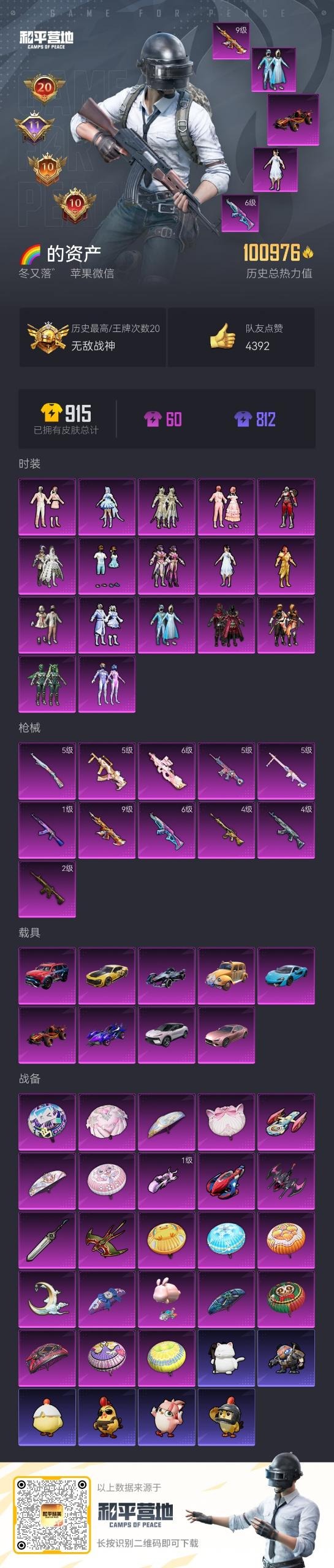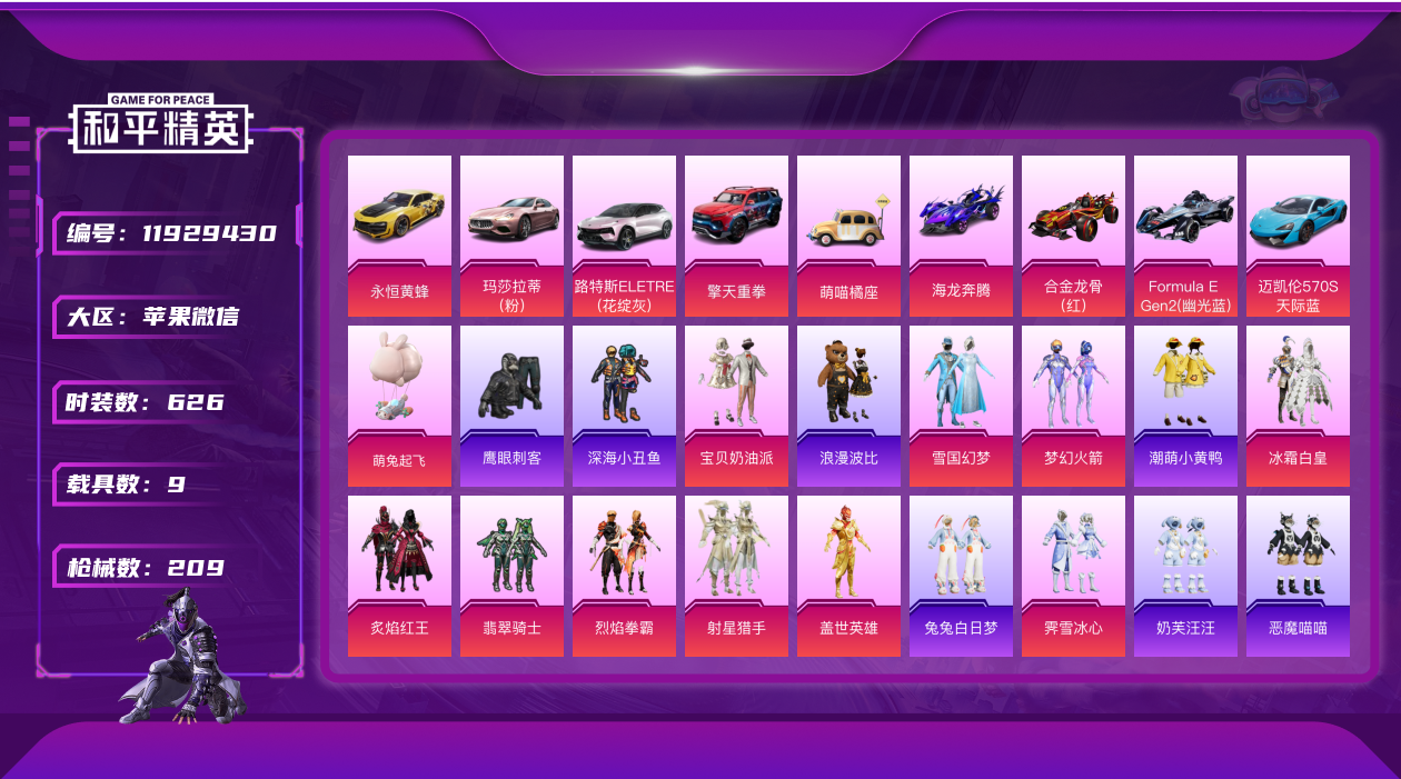[11929430]17粉装 11特效枪 9载具 20印记 可二次 可修改实名 身法装备:KONE追光队服,巡查衣(绝对防御上衣),萌熊伴侣背包(粉熊背包) 优质装备:合金龙骨(红),雪国幻梦(冰雪女王),玛莎拉蒂Ghibli(粉),海龙奔腾,巡查员衣服(绝对防御上衣),路特斯ELETRE(花绽灰),迈凯伦570S(天际蓝),Formula E Gen2(幽光蓝),擎天重拳,永恒黄蜂,九级M416-至情至圣(满级至情至圣M416),巡查衣(绝对防御上衣),萌熊伴侣背包(粉熊背包),M416五爪金龙,梦幻火箭(新101)(新火箭少女101粉色套装),宝贝奶油派,M762激战未来,SCAR-L童趣迷兔,翡翠骑士,炙焰红王,冰霜白皇,AKM梦之光华,M16A4葫芦兄弟,GROZA焦糖拿铁,M416至情至圣,女娲后裔-赵灵儿,AKM星际浪客,MG3梦幻舞会,P90粉樱探戈,Kar98K-巳巳如意 热门装扮:烈焰拳霸,霁雪冰心,盖世英雄,银红美神,仲夏莫吉托,第五大道,阿尔茜,粉樱探戈,射星猎手,美琪,兔兔白日梦,奶芙汪汪,恶魔喵喵,潮萌小黄鸭,鹰眼刺客,深海小丑鱼,浪漫波比 载具:僚机-萌兔起飞,萌喵橘座 六级特效枪:六级AKM-梦之光华,六级P90-粉樱探戈 五级特效枪:五级SCAR-L-童趣迷兔,五级Kar98K-巳巳如意,五级MG3-梦幻舞会,五级GROZA-焦糖拿铁 四级特效枪:四级M762-激战未来,四级M16A4-葫芦兄弟 二级特效枪:二级M416-五爪金龙 一级特效枪:一级AKM-星际浪客 紫色装扮:田园牧歌,轻风白浪,和煦暖阳,SS22特训,莱茵河畔,孙悟空,SS23特训,幻彩翩翩,灵蜜圈圈,妙红点点,香榭午后,娇憨猪猪,俏皮奶喵,萌趣咩咩,暖心熊熊,SS21特训,熠彩粉晶,SS31特训套装,冰川特警,冷焰舞者,极速光影,SS30特训套装,云朵鹅,彩虹兔,雪绒豹,SS33特训套装,顶瓜瓜,SS20特训,青春冒险家,潮流游乐家,SS15特训,时空追击者,暴风机械师,SS16特训,爆裂葡萄,快乐星愿,遗落祭司,诡谋托雷基亚,星梦畅游,治愈之星,迅捷之星,科技之星,SS14特训,萌趣颜团子,特种颜团子,猎梦纪元,飞驰魅影,音速流光,极速竞梦,SS19特训,覆海蛟龙,吉莉礼服,甜心亚梦,虚音幻奏,瑞龙福将,团圆交子,SS17特训,沁蓝冰爽,异彩先驱,SS18特训,酷潮明星,长空猛禽