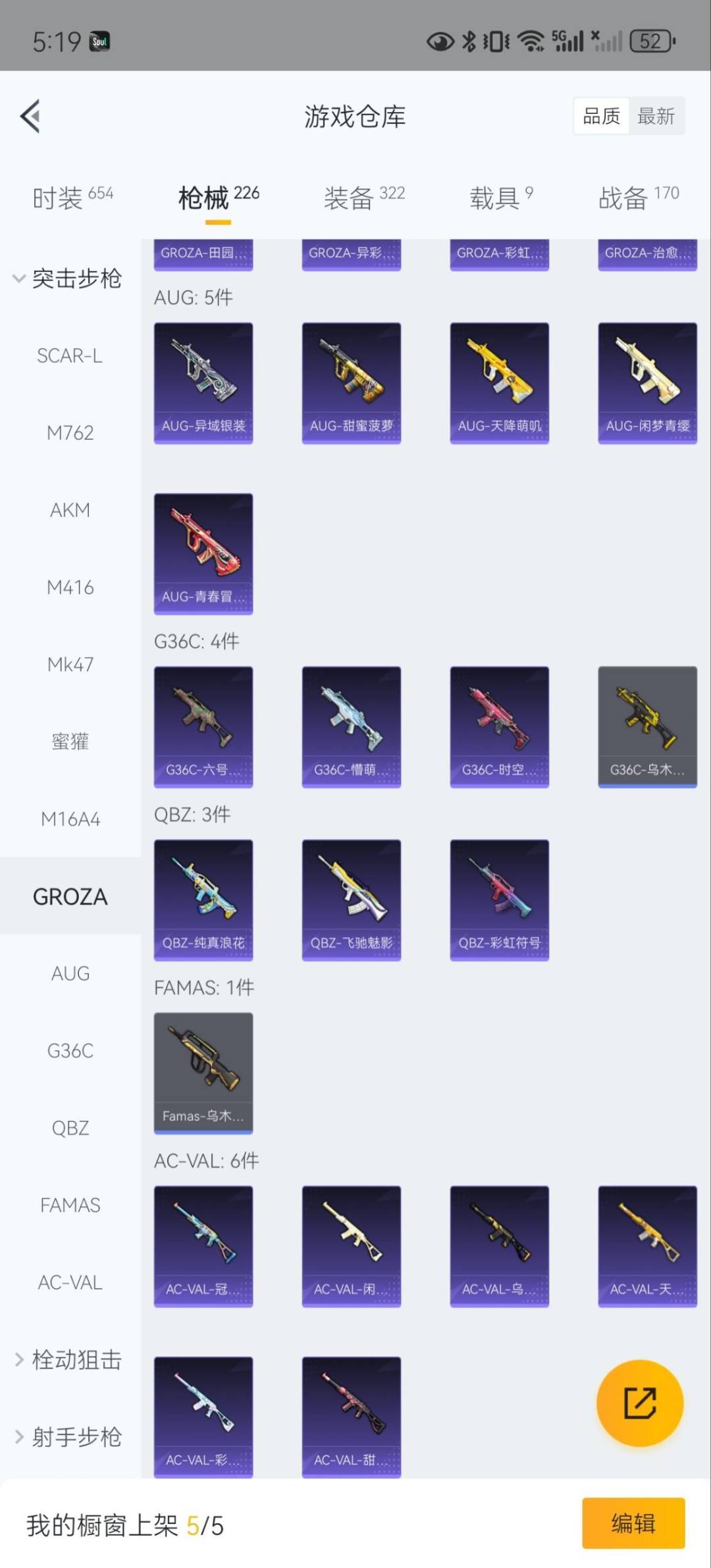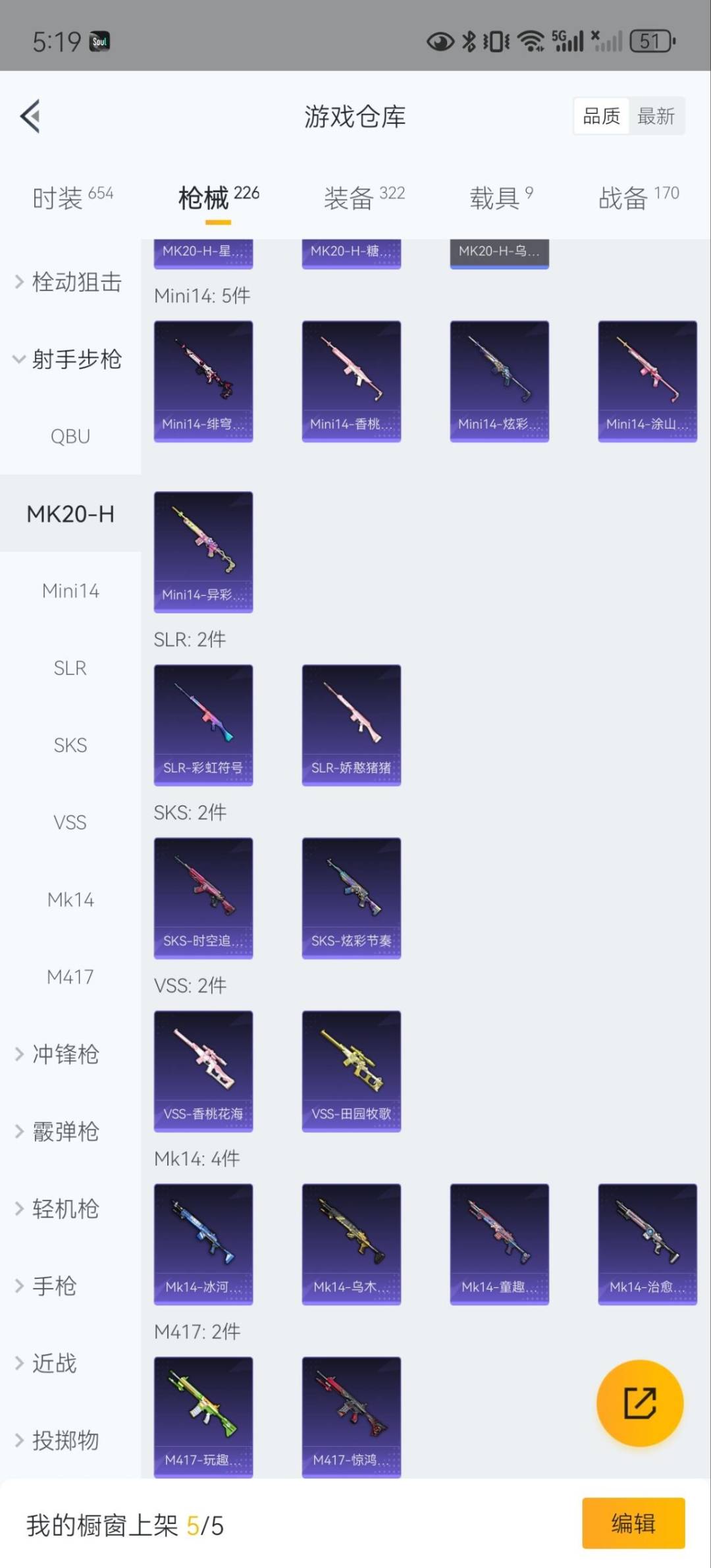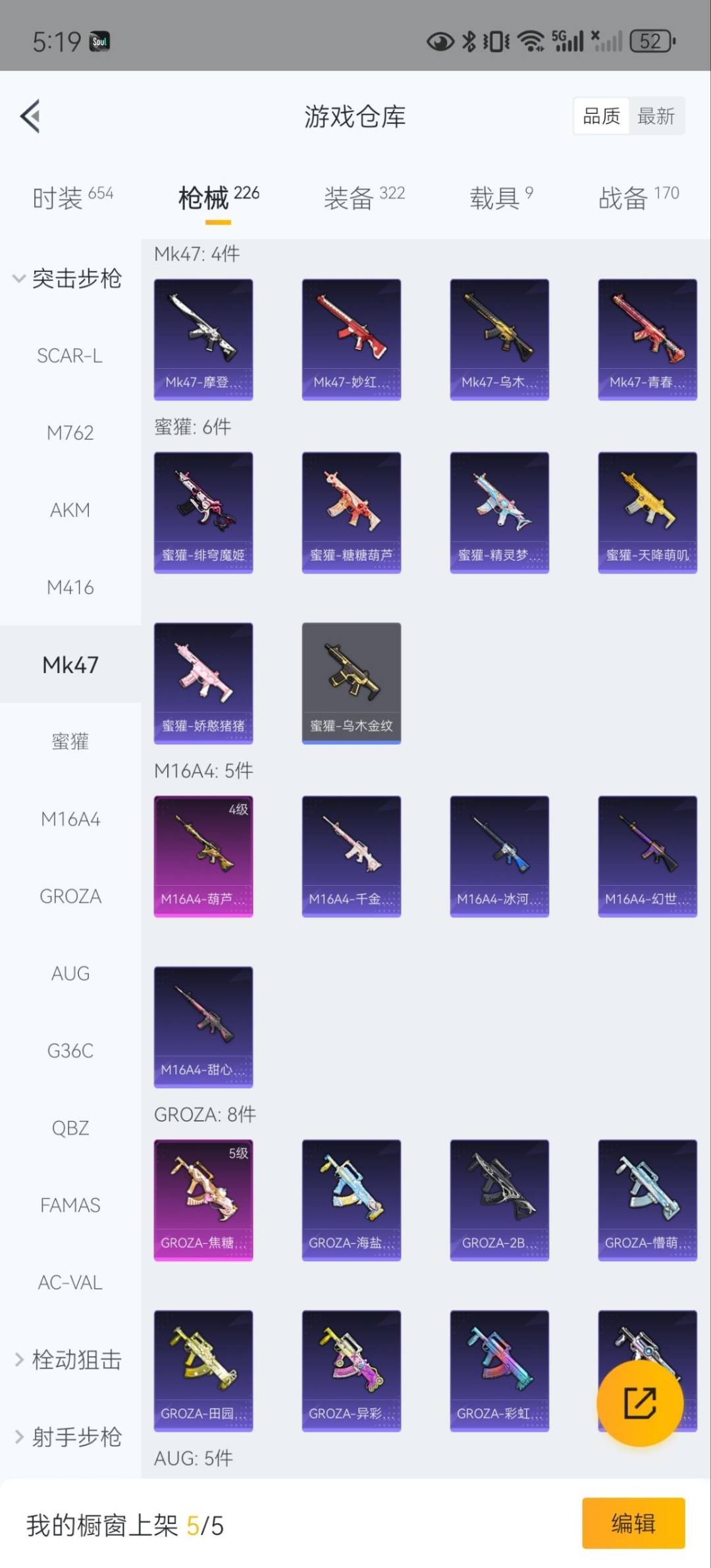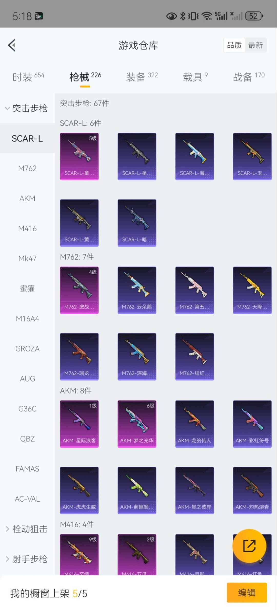 SCAR-L-童趣迷兔,M762-激战未来,AKM-星际浪客,AKM-梦之光华,M416-五爪金龙,M416-至情至圣,M16A4-葫芦兄弟,GROZA-焦糖拿铁,Kar98K-巳巳如意,P90-粉樱探戈,MG3-梦幻舞会