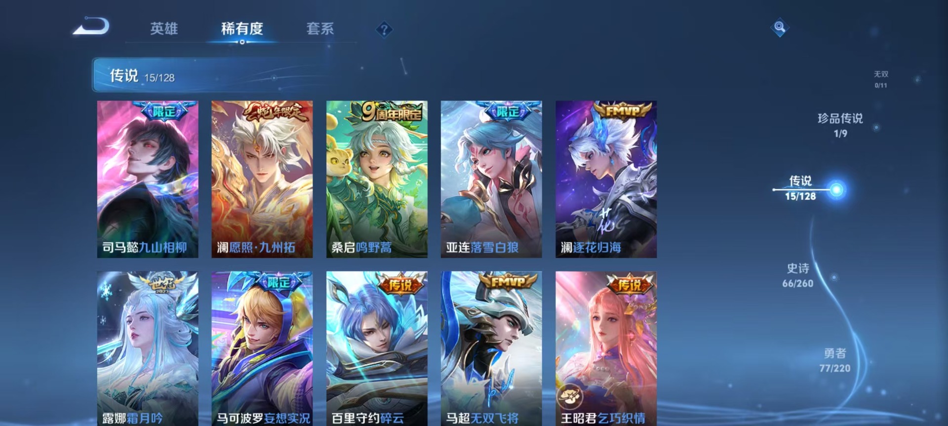 - [12204604]V6 6传说 125英雄 209皮肤 可修改实名 女号 优质装备:冠军飞将,仲夏夜之梦(大飞蛾),遇见神鼓,涂山容容 传说皮:吕布曦玄引 珍宝阁皮:妄想食味,优雅恋人 限定皮:逐霄战戟,鸣野蒿,怒海麟威,五谷丰年,梁祝,御风骁将(吕布年限),猪悟能,山海·玄木吟(马可年限) 史诗皮:化蝶舞,琥珀纪元伽罗,星界战将,百相守梦-黄忠,织梦人,紫霞仙子,苍穹之光,白龙吟,特工魅影,江河有灵,雪夜绮愿(周瑜),百解令(蒙犽),蒙恬荣光圣徽,电玩·爆裂旋风,无限星赏官,龙骑士(小龙虾),末日机甲-吕布,猫狗日记-孙策,乱世虎臣,节奏热浪,摇滚巨星,水果甜心,心灵骇客,德古拉伯爵,暗隐猎兽者,幽灵船长,鬼剑武藏,心灵战警,地狱岩魂,纤云弄巧,拒霜思,缤纷独角兽,乘风破浪,逐浪之夏,水晶猎龙者,曙光守护者,箭羽风息,金属风暴,圣诞狂欢,圣诞恋歌,鹰眼统帅,王者之锤,魅力维加斯