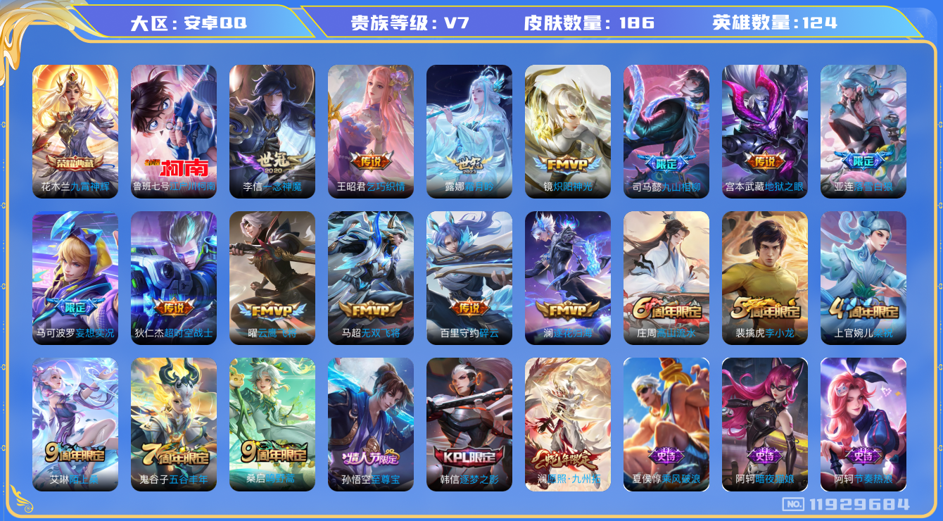 [11929684]V7 1典藏 1珍品传说 15传说 124英雄 186皮肤 可修改实名 优质装备:九霄神辉(木兰典藏),江户川柯南,云鹰飞将(小将军),炽阳神光,一念神魔,地狱之眼,乞巧织情,超时空战士-狄仁杰,无双飞将,碎云,妄想实况,霜月吟,澜逐花归海,涂山容容 传说皮:落雪白狼,九山相柳 珍宝阁皮:妄想食味,女武神 限定皮:愿照·九州拓(澜年限),陌上桑,鸣野蒿,至尊宝,高山流水,五谷丰年,梁祝,李小龙,逐梦之影 史诗皮:赞萌露比,器灵·浮梦炉,化蝶舞,灵蛊蚀心,星界战将,龙之律动,破空之剑,东方月初,蒙犽顽岩魄,芈月浮光幕影,百相守梦-百里守约,百相守梦-黄忠,紫霞仙子,黄金分割率,千年之狐,永昼,魅语,无限星赏官,冰冠公主,偶像歌手,暗夜猫娘,末日机甲-吕布,乱世虎臣,节奏热浪,修罗,女仆咖啡,摇滚巨星,水果甜心,星夜王子,暗隐猎兽者,鬼剑武藏,天秀·启明,地狱岩魂,拒霜思,缤纷独角兽,乘风破浪,逐浪之夏,月团寄思,水晶猎龙者,热力回旋,金属风暴,原初追逐者,圣诞狂欢,圣诞恋歌,鹰眼统帅,魅力维加斯,黎明之约,赏金猎手,奇遇舞章,无心