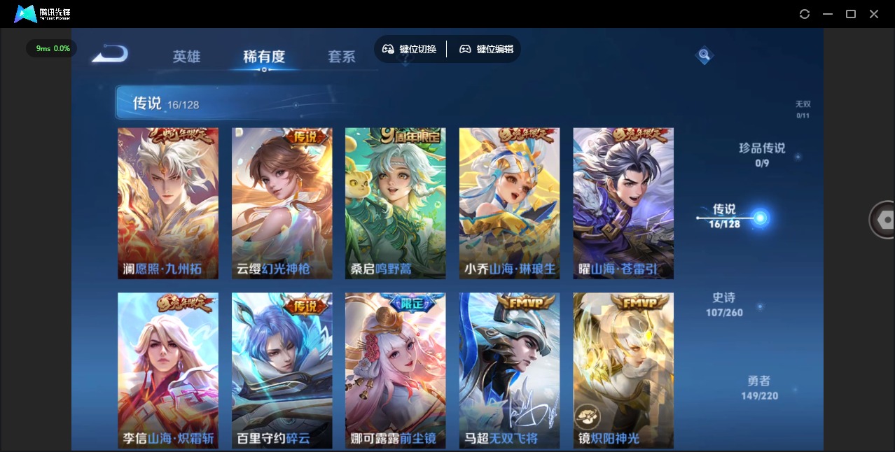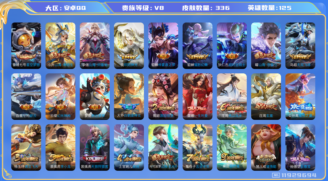 [11929694]V8 1典藏 16传说 125英雄 336皮肤 可修改实名 优质装备:星空梦想(太空人),猫影幻舞,炽阳神光,仲夏夜之梦(大飞蛾),胖达荣荣,超时空战士-狄仁杰,无双飞将,碎云,山海·炽霜斩(李信年限),山海·琳琅生(小乔年限),山海·苍雷引(电光曜子) 传说皮:幻光神枪 珍宝阁皮:妄想食味,优雅恋人,玩趣恶龙 限定皮:愿照·九州拓(澜年限),鸣野蒿,至尊宝,白虎志(电光耗子),前尘镜,白鹤梁神女,玄嵩(庄周年限),山海·碧波行(瑶年限),遇见飞天,高山流水,五谷丰年,游园惊梦,梁祝,天狼狩猎者,李小龙,猪悟能,一生所爱,蜜橘之夏,山海·玄木吟(马可年限) 史诗皮:星界战将,茶境仙,破空之剑,蒙犽顽岩魄,蔬乡物语(鲁班七号),百相守梦-百里守约,百相守梦-黄忠,遇见神鹿,紫霞仙子,苍穹之光,电玩小子(小书包),黄金分割率,特工魅影,千年之狐,江河有灵,魅语,百解令(蒙犽),高渐离燃音魔法,蒙恬荣光圣徽,无限星赏官,冰冠公主,偶像歌手,电玩·爆裂旋风,暗夜猫娘,末日机甲-吕布,猫狗日记-孙策,猫狗日记-大乔,时之恋人-孙尚香,乱世虎臣,节奏热浪,修罗,女仆咖啡,摇滚巨星,水果甜心,绅士熊喵,天才门将,星夜王子,心灵骇客,时之奇旅-安琪拉,功夫厨神,暗隐猎兽者,幽灵船长,鬼剑武藏,心灵战警,舞动绿茵,地狱岩魂,纤云弄巧,繁星吟游(呼啦呼啦),拒霜思,缤纷独角兽,乘风破浪,逐浪之夏,水晶猎龙者,曙光守护者,箭羽风息,金属风暴,原初追逐者,圣诞狂欢,圣诞恋歌,鹰眼统帅,暗夜贵公子,魅力维加斯,黎明之约,赏金猎手,无心,未来纪元-赵云