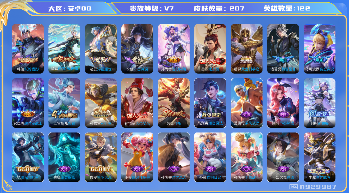 [11929987]V7 1典藏 9传说 122英雄 207皮肤 可修改实名 优质装备:弑枪猎影(韩信典藏),黄金射手座,一念神魔,淬星耀世,超时空战士-狄仁杰,音你闪耀(rap皮),鹤羽星尊,妄想实况 传说皮:乘龙·铭钟鼎(赵云年限),吕布曦玄引 珍宝阁皮:妄想食味 限定皮:飞衡(韩信年限),梁祝,孙行者,大圣娶亲 史诗皮:化蝶舞,星界战将,龙之律动,紫霞仙子,白龙吟,黄金分割率,特工魅影,千年之狐,魅语,百解令(蒙犽),高渐离燃音魔法,蒙恬荣光圣徽,电玩·爆裂旋风,猫狗日记-孙策,时之恋人-孙尚香,节奏热浪,修罗,女仆咖啡,摇滚巨星,水果甜心,天才门将,星夜王子,暗隐猎兽者,幽灵船长,鬼剑武藏,舞动绿茵,纤云弄巧,缤纷独角兽,乘风破浪,逐浪之夏,水晶猎龙者,曙光守护者,箭羽风息,金属风暴,圣诞狂欢,鹰眼统帅,黎明之约,未来纪元-赵云