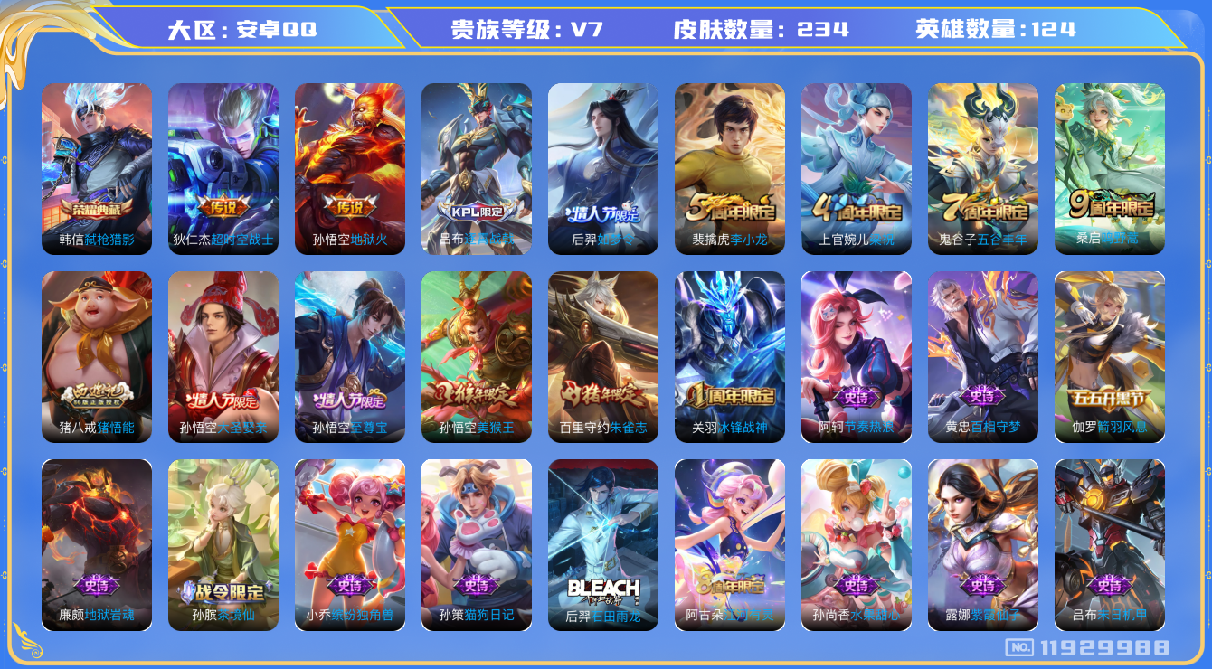 [11929988]V7 1典藏 3传说 124英雄 234皮肤 可修改实名 女号 优质装备:弑枪猎影(韩信典藏),地狱火,超时空战士-狄仁杰,涂山容容 珍宝阁皮:胡桃夹子,玩趣恶龙 限定皮:逐霄战戟,鸣野蒿,至尊宝,五谷丰年,冰锋战神,梁祝,李小龙,朱雀志(守约年限),如梦令-后羿,猪悟能,大圣娶亲,美猴王 史诗皮:鸭鸭历险记-刘禅,龙之律动,石田雨龙,茶境仙,星界特工,百相守梦-黄忠,紫霞仙子,黄金分割率,特工魅影,千年之狐,江河有灵,冰冠公主,晚萤,电玩·爆裂旋风,末日机甲-吕布,猫狗日记-孙策,节奏热浪,水果甜心,天才门将,心灵骇客,功夫厨神,鬼剑武藏,心灵战警,乐园奇幻夜,舞动绿茵,地狱岩魂,纤云弄巧,缤纷独角兽,箭羽风息,金属风暴,鹰眼统帅,魅力维加斯,赏金猎手,无心,未来纪元-赵云