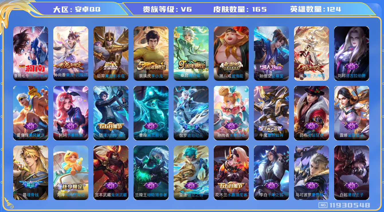 [11930548]V6 1珍品传说 4传说 124英雄 165皮肤 可修改实名 优质装备:江户川柯南,黄金射手座 传说皮:乘龙·问璇玑(孙尚香年限) 珍宝阁皮:胡桃夹子 限定皮:愿照·九州拓(澜年限),鸣野蒿,至尊宝,李小龙,猪悟能 史诗皮:鸭鸭历险记-刘禅,星界战将,龙之律动,炽弈燎原,破空之剑,东方月初,埋骨钱,琥珀纪元伽罗,百相守梦-百里守约,星界特工,紫霞仙子,特工魅影,千年之狐,晚萤,龙骑士(小龙虾),节奏热浪,修罗,女仆咖啡,摇滚巨星,水果甜心,星夜王子,德古拉伯爵,暗隐猎兽者,幽灵船长,鬼剑武藏,心灵战警,舞动绿茵,诗语江南,纤云弄巧,乘风破浪,逐浪之夏,水晶猎龙者,曙光守护者,圣诞狂欢,鹰眼统帅