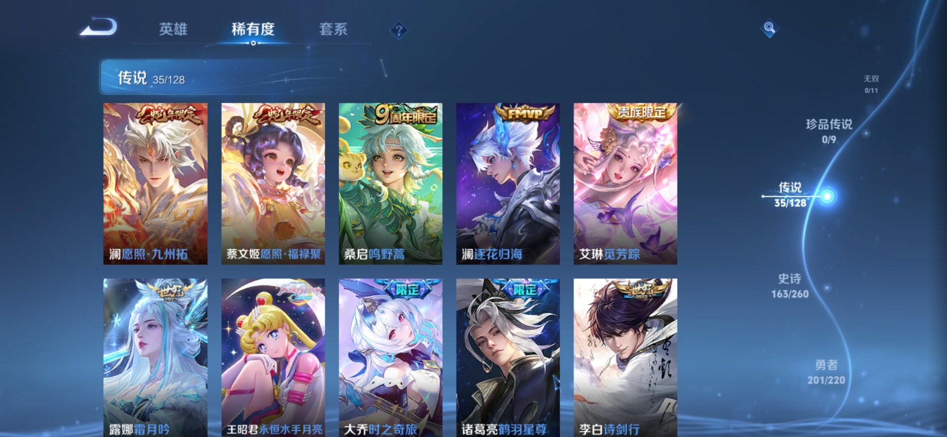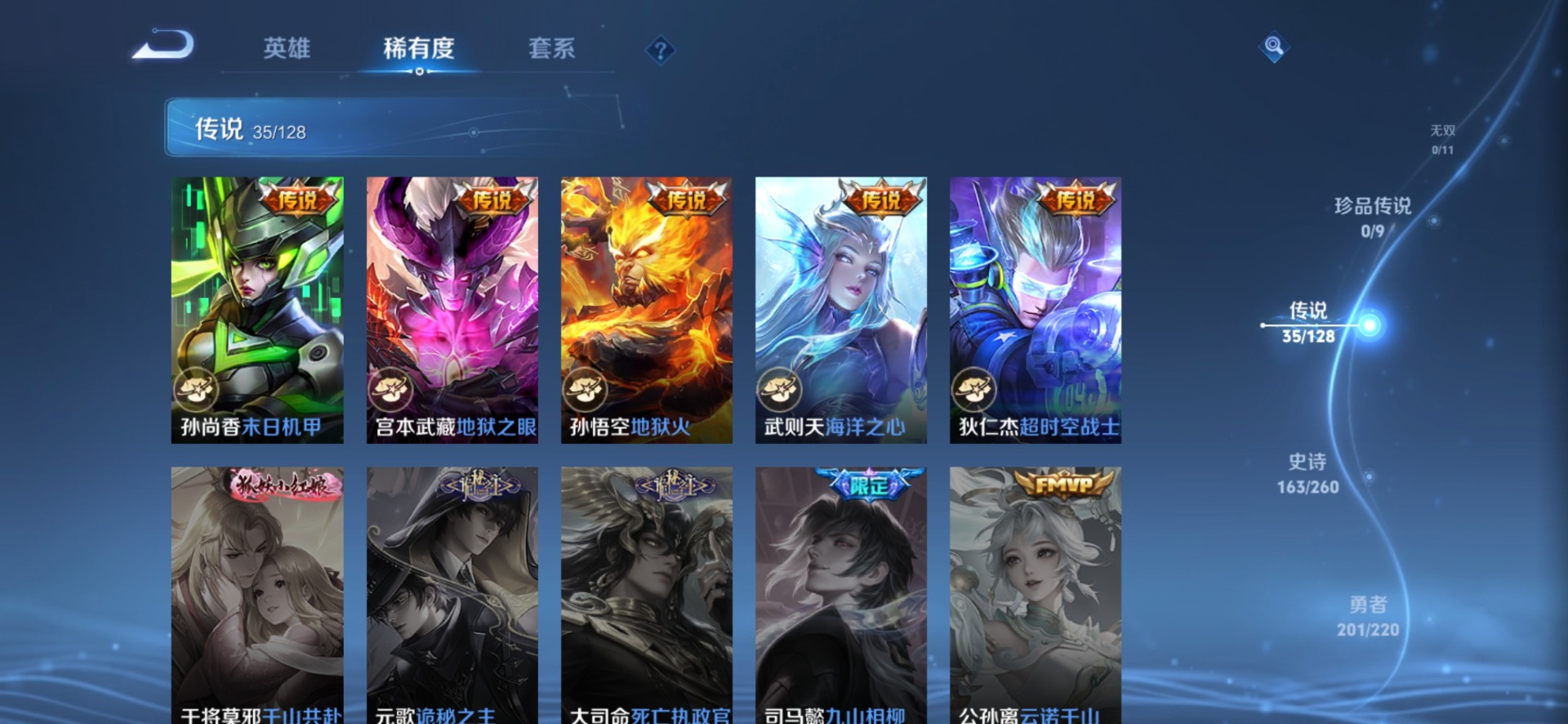 - PX_2103100-Q/无双王者/291皮肤/124英雄/2典藏/0珍品无双/1无双/0珍品传说/27传说/85史诗/8稀有英雄 【2 典藏皮肤】鸣剑·曳影 李白,九霄神辉 花木兰, 【1 无双皮肤】器灵·螭龙剑 曜, 【27 传说皮肤】鹤归松栖 云缨,启明星使 虞姬,前尘镜 娜可露露,逐花归海 澜,无双飞将 马超,李逍遥 曜,云鹰飞将 曜,齐天大圣 孙悟空,诗剑行 李白,浮生妄 夏洛特,地狱