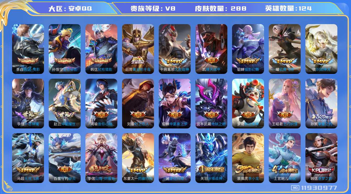 [11930977]【商品标题】:安卓Q-V8-至尊星耀V段位-124英雄-288皮肤-3典藏-0珍品无双-0无双-0珍品传说-22传说-87史诗
