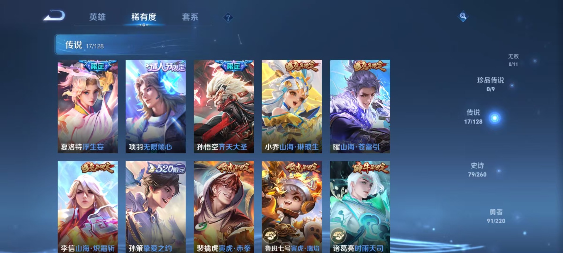 - PX_2094627-50 安卓QQ/永恒钻石/153皮肤/123英雄/0典藏/0珍品无双/0无双/1珍品传说/8传说/26史诗/7稀有英雄 【1 珍品传说】器灵·落星盏 嫦娥, 【8 传说皮肤】祈雪灵祝 公孙离,鹤羽星尊 诸葛亮,炽阳神光 镜,黄金射手座 后羿,愿照·九州拓 澜,祥瑞亨通 裴擒虎,鸣野蒿 桑启,云诺千山 公孙离, 【26 史诗皮肤】末日机甲 吕布,妄想食味 姬小满,山海·玄木吟